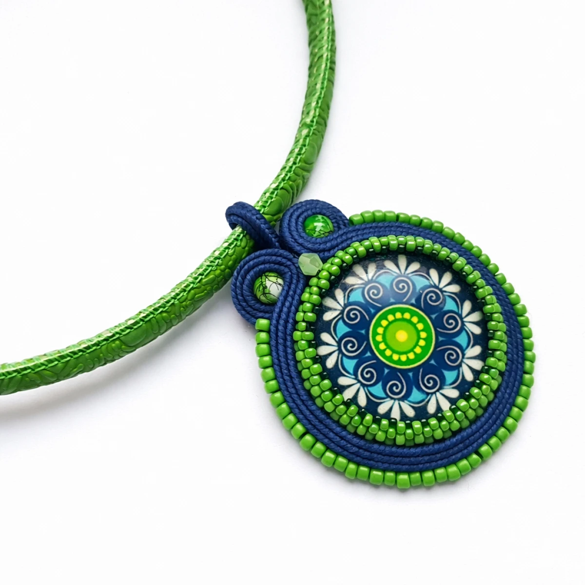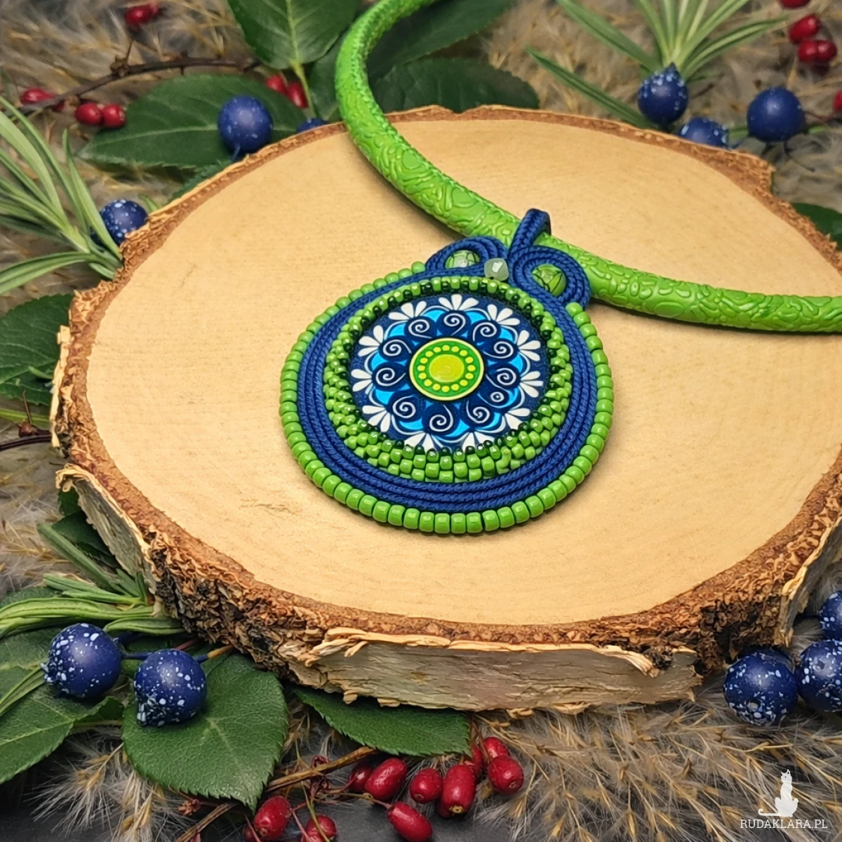 Unikatowy wisiorek sutasz stylizowany na kształt koła, wykonany pracochłonną techniką haftu soutache. Kompozycja w odcieniach głębokiego granatu i soczystej zieleni podkreśla dekoracyjny kaboszon z mandalowym wzorem, nadając całości artystyczny, boho charakter.
