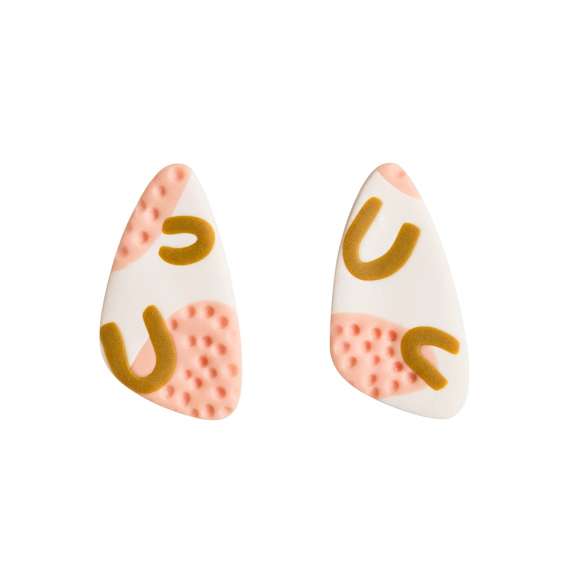 Kolczyki - sztyfty w kształcie owalnego trojkata. Ręcznie robione z abstrakcyjnymi, nieregularnymi wzorami. Kombinacja bieli, różu i musztardowego. Są lekkie, niemal niewyczuwalne przy noszeniu, a hipoalergiczne materiały gwarantują komfort użytkowania przez cały dzień.