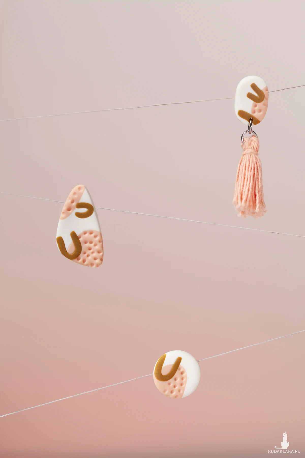 Małe, ręcznie robione kolczyki - sztyfty z abstrakcyjnymi, nieregularnymi wzorami. Kombinacja bieli, różu i musztardowego. Są lekkie, niemal niewyczuwalne przy noszeniu, a hipoalergiczne materiały gwarantują komfort użytkowania przez cały dzień.