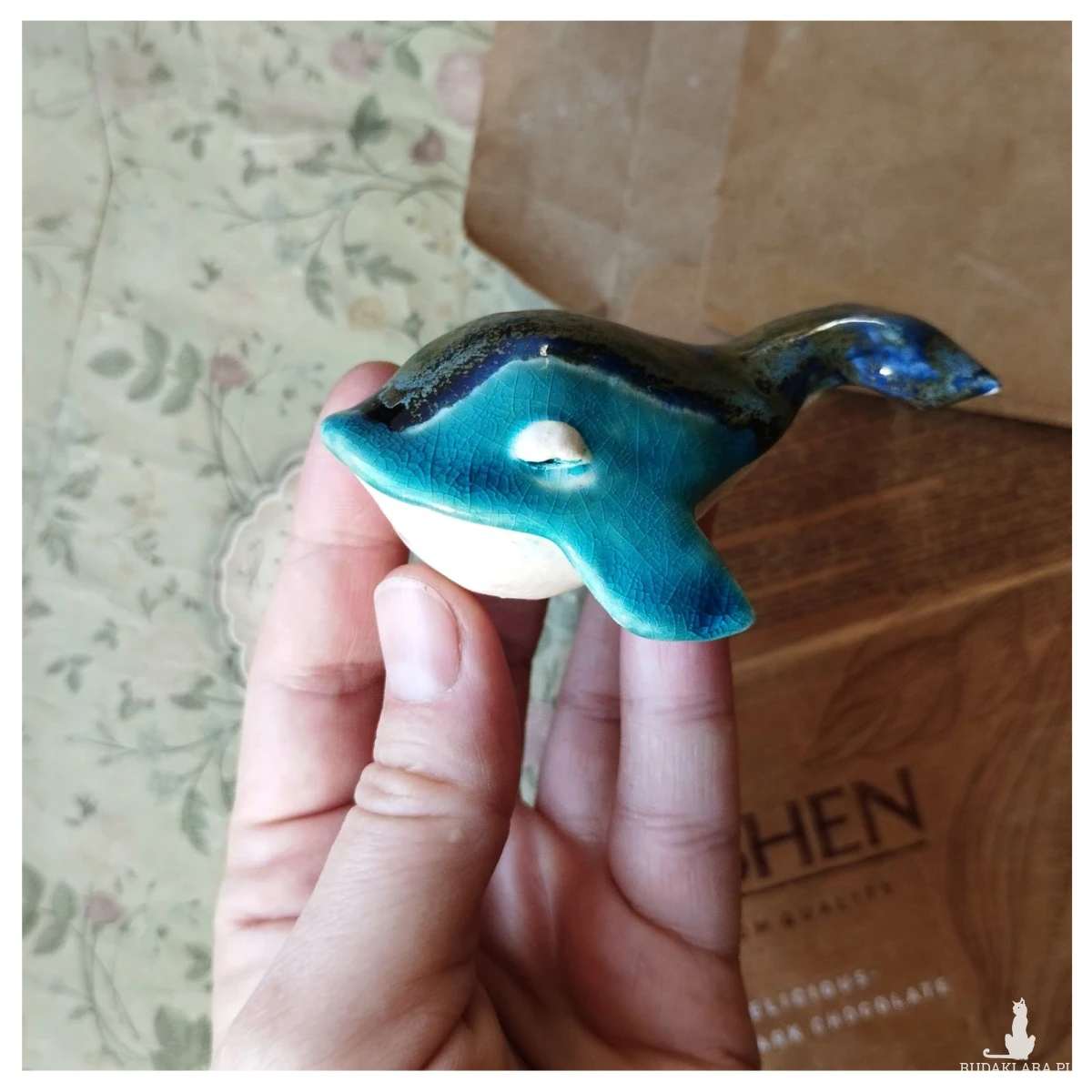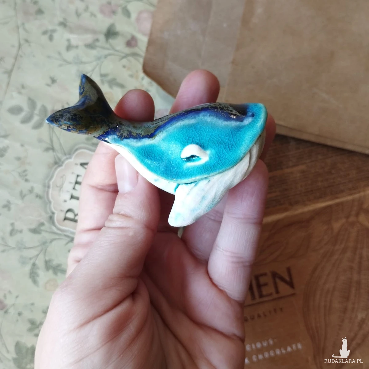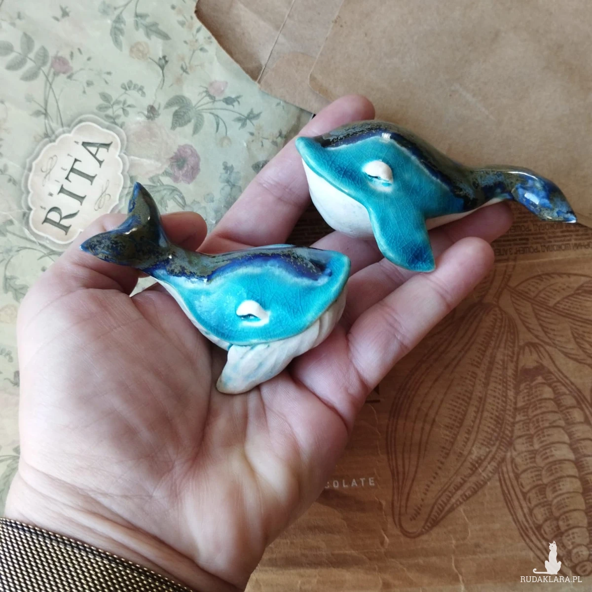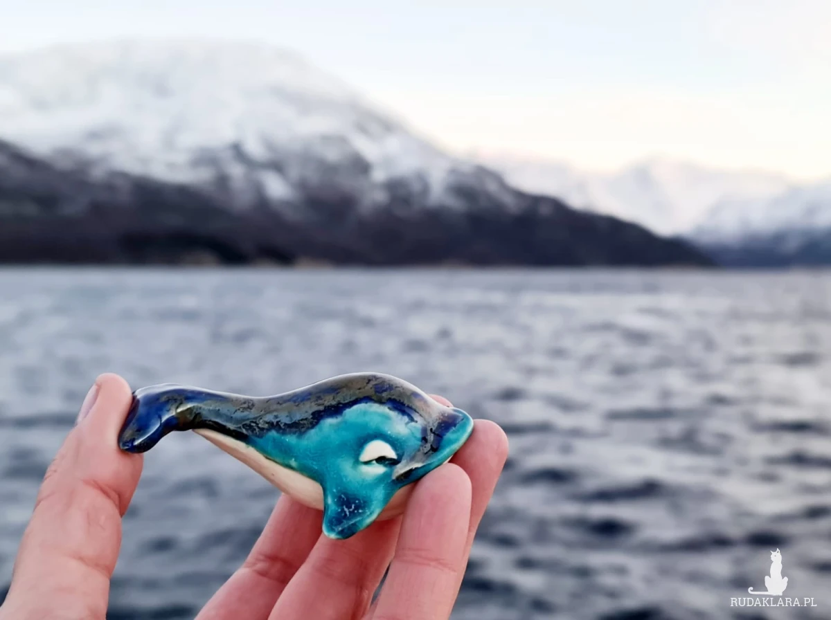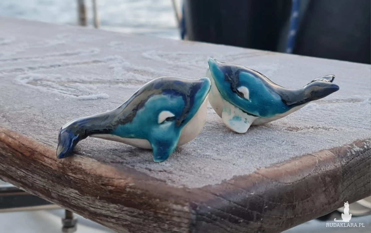 Ceramiczne wieloryby wykonane z gliny szamotowej wypalone na biskwit a następnie szkliwione w temp ok 1260 stopni C. Układ plam może różnić się od tego na zdjęciu. Wymiary: wielorybków ok 5,5 x 8 cm. Dostępne również osobno. Polecam serdecznie.