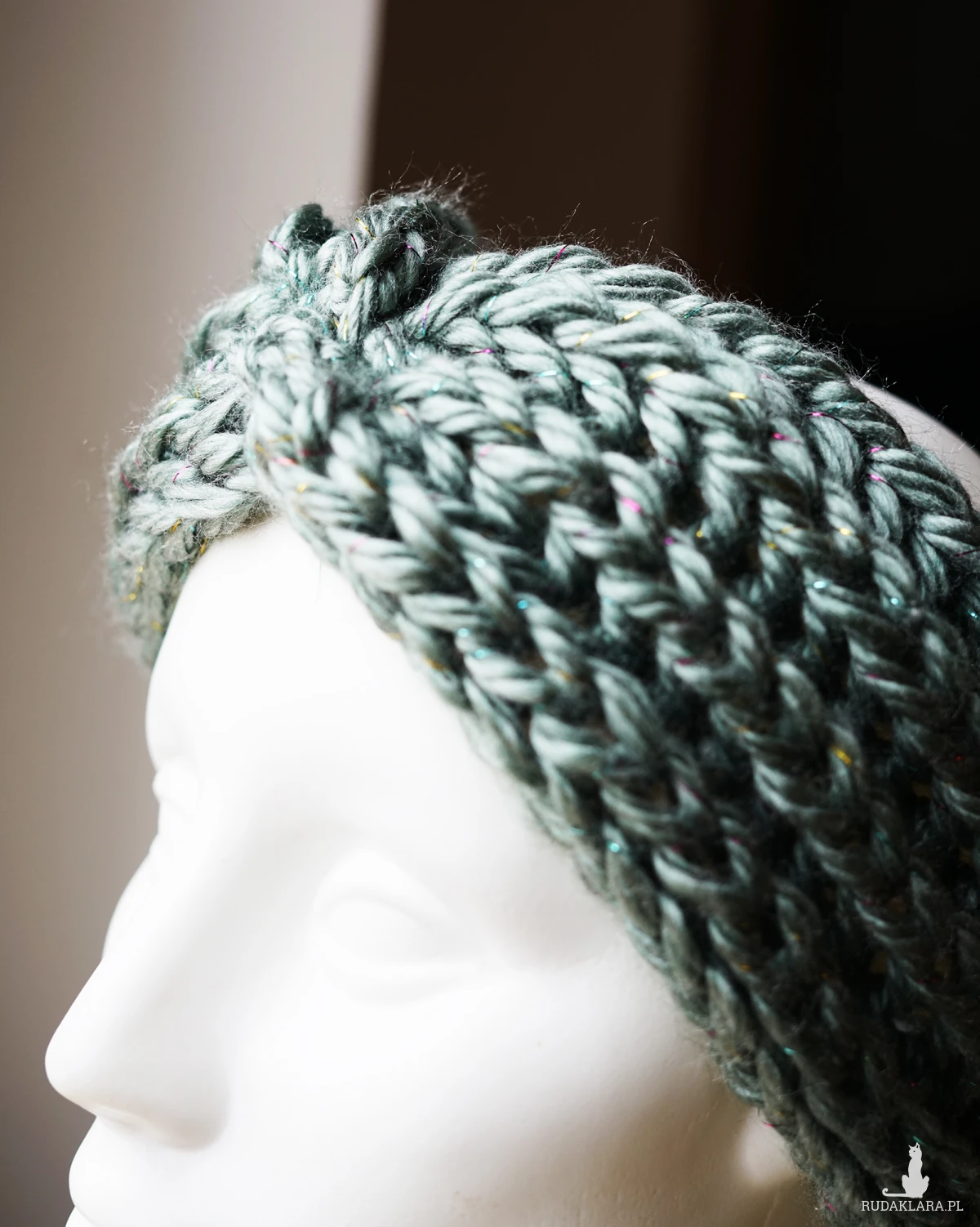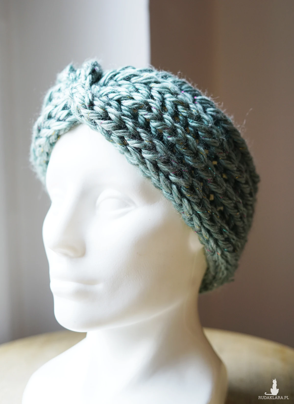 Elastyczna, gruba, ciepła i bardzo stylowa opaska w kolorze "brudnego" seledynu z kolorową, błyszczącą nicią.