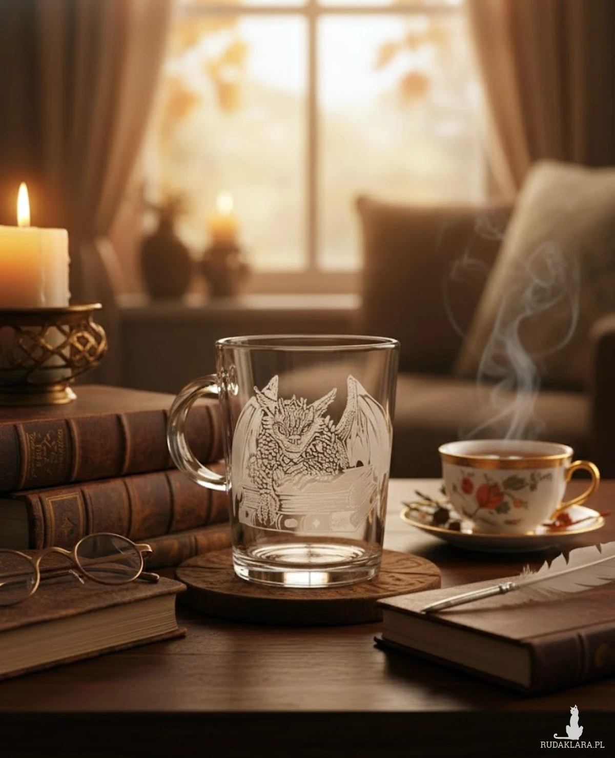Szklanka "Smocza Biblioteka" to nie tylko praktyczny przedmiot, ale także wyraz osobowości – dla wszystkich, którzy wierzą, że wiedza to prawdziwy skarb, a smoki to najlepsi jej strażnicy.