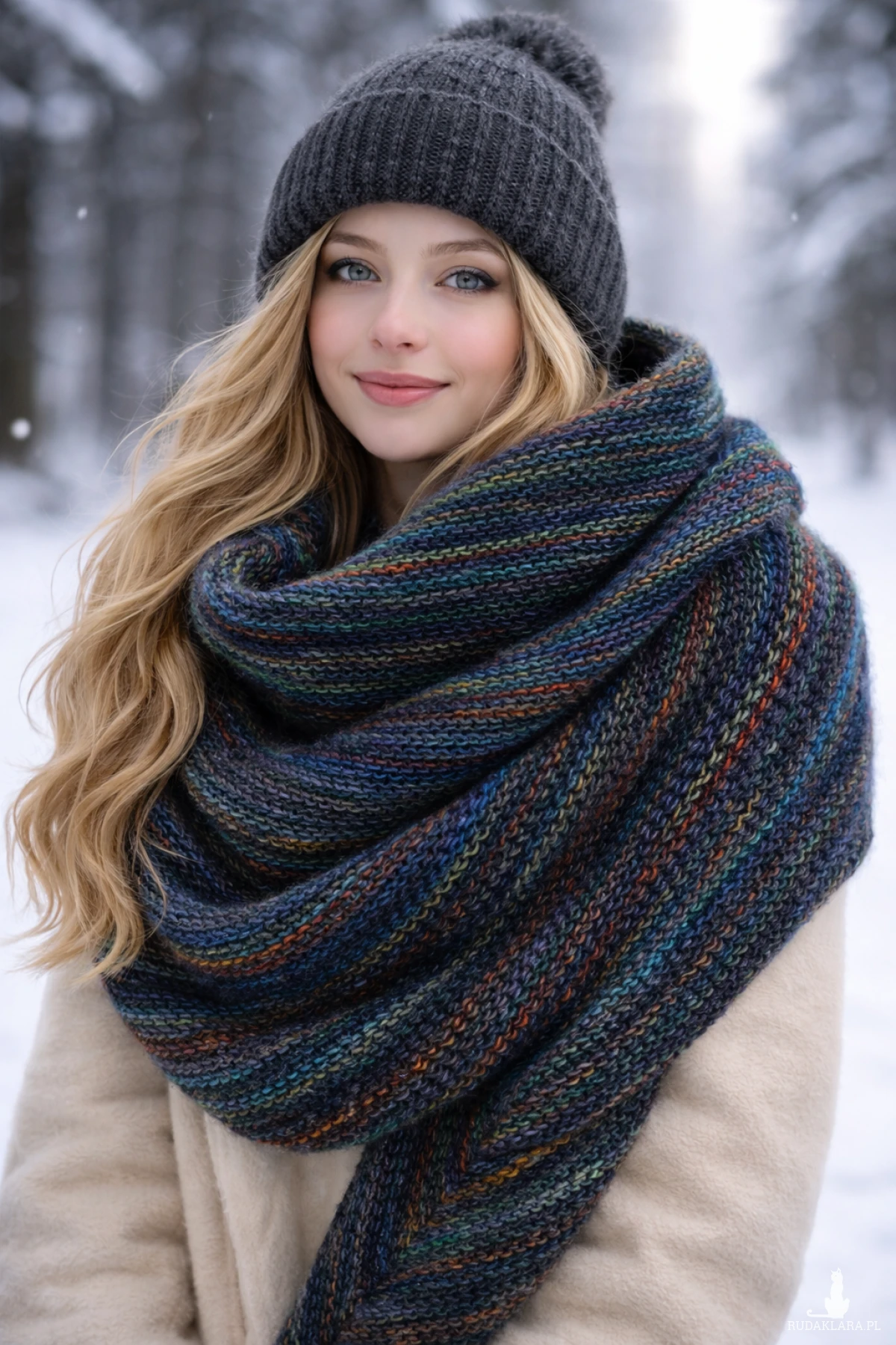 Duża chusta asymetrycznie zrobiona strzałka otuli, ogrzeje w zimowe dni.