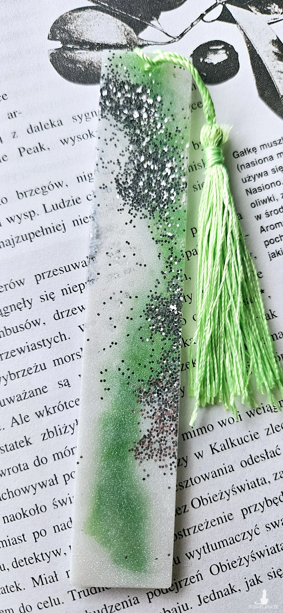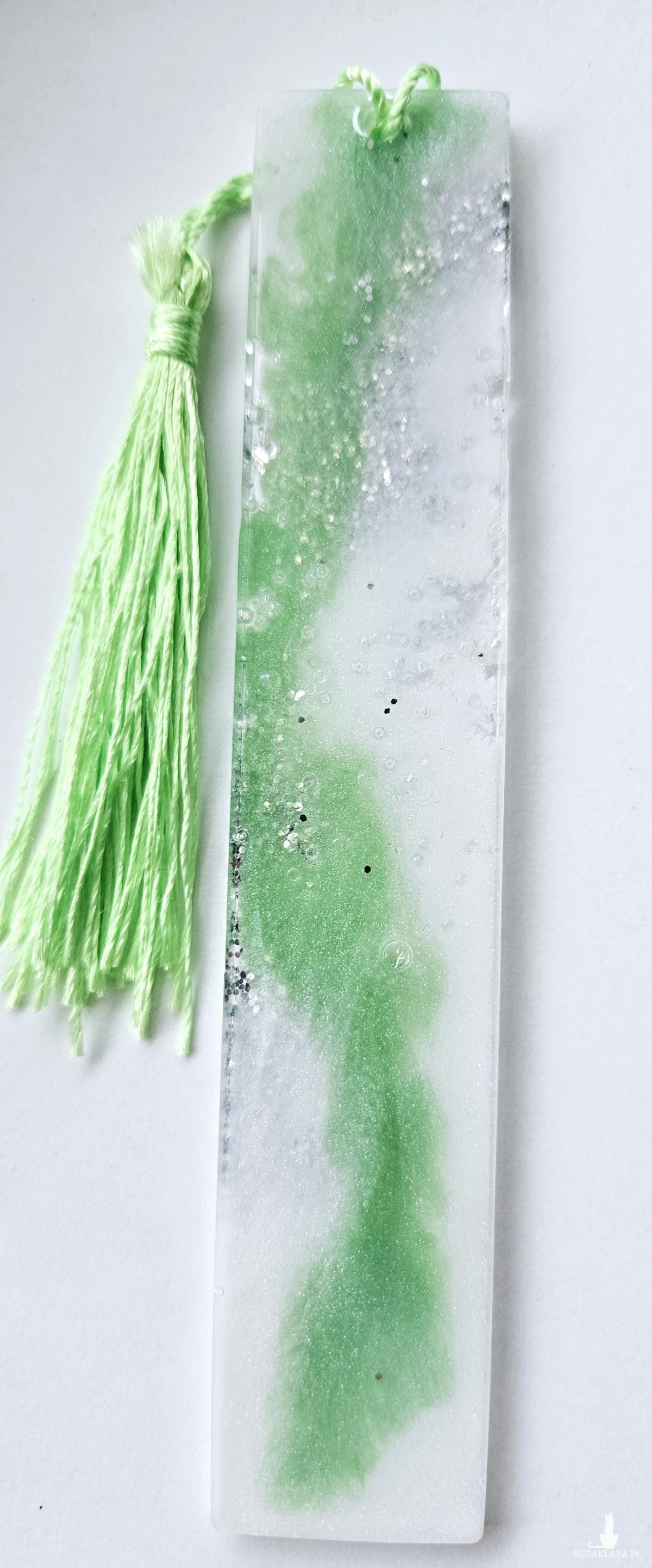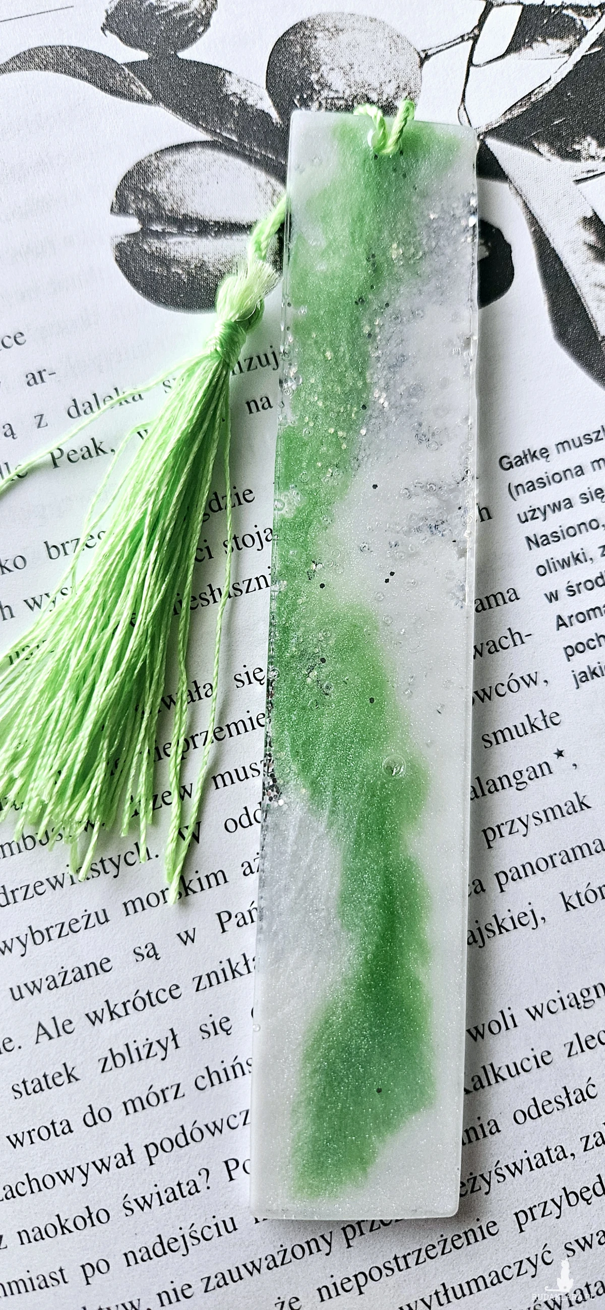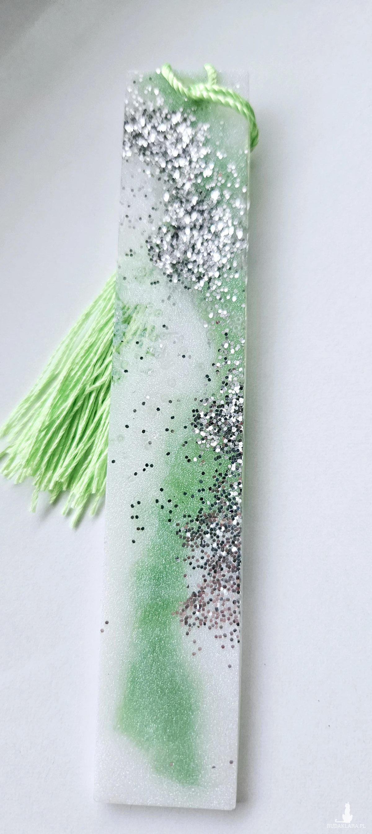 Zakładka z żywicy epoksydowej zieleń z srebrnym brokatem s04