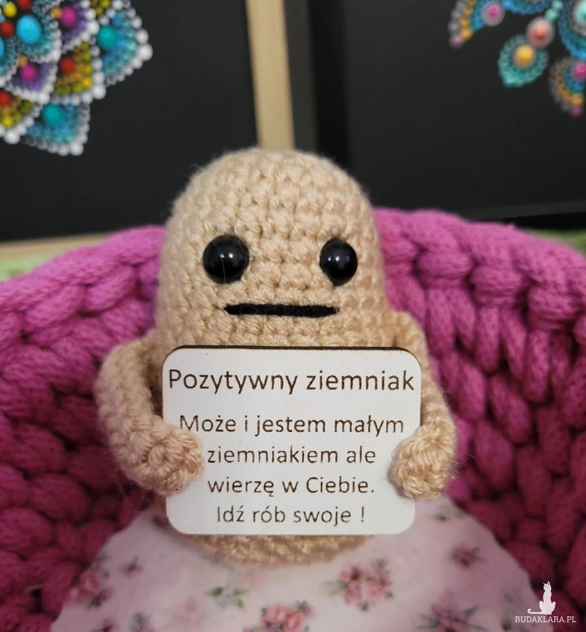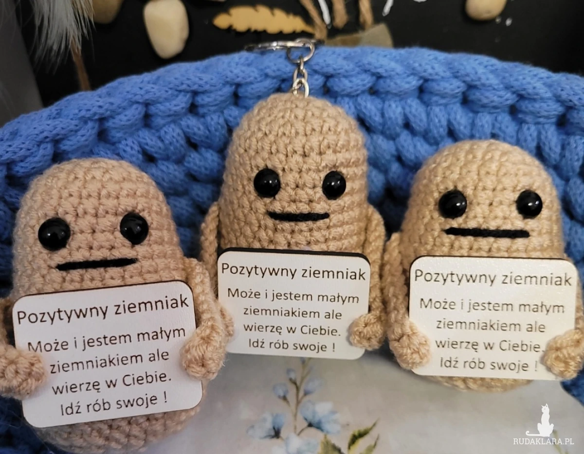 Figurka Pozytywny Ziemniak.Wykonana z włoczki akryl z bambusem,wypełniona kulką silikonową. Wysokosc okolo 7cm.