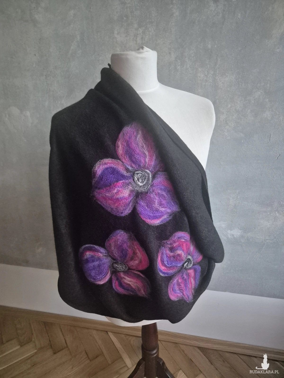 Super prezent na dzień mamy czarny filcowany wełniany miły i ciepły komin handmade- tuba, owijany dwa razy, filcowany wełną merynosów, bardzo ciepły i miły, doskonały na prezent, fantastyczny na codzienne noszenie, zwraca uwagę, dodaje koloru, nie zginiesz w tym kominie na ulicy, pojedyncze egzemplarze, polecam bestseller- Ruda Klara-czas oczekiwania 1,5 tyg  box x1