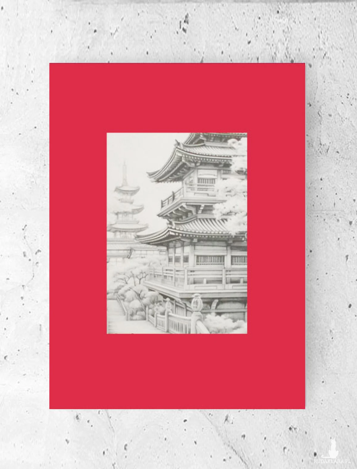 Nowy plakat z azjatycką architekturą. Biało czarny obrazek na czerwonym kartoniku A4. Dekoracja na ścianę do gabinetu, salonu, sypialni, jadalni, biura, przedpokoju, garderoby, kuchni, pokoju młodzieżowego, holu, kawiarni, restauracji itp. Plakat wystarczy dać do ramki 21x30 cm.. Poster będzie pasował do każdego stylu urządzania wnętrz urządzonych,