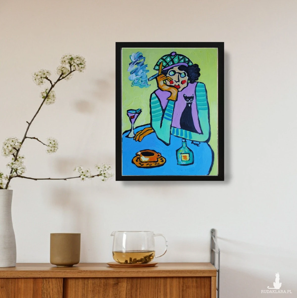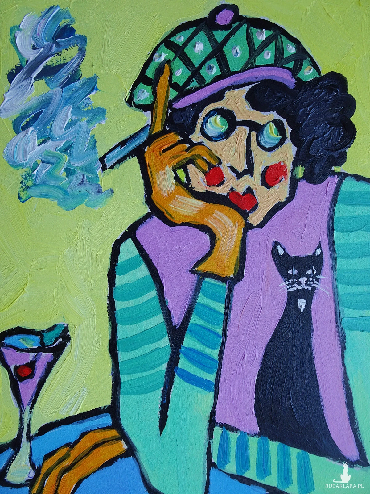 obraz ręcznie malowany portret babcia z drinkiem prezent na dzień babci