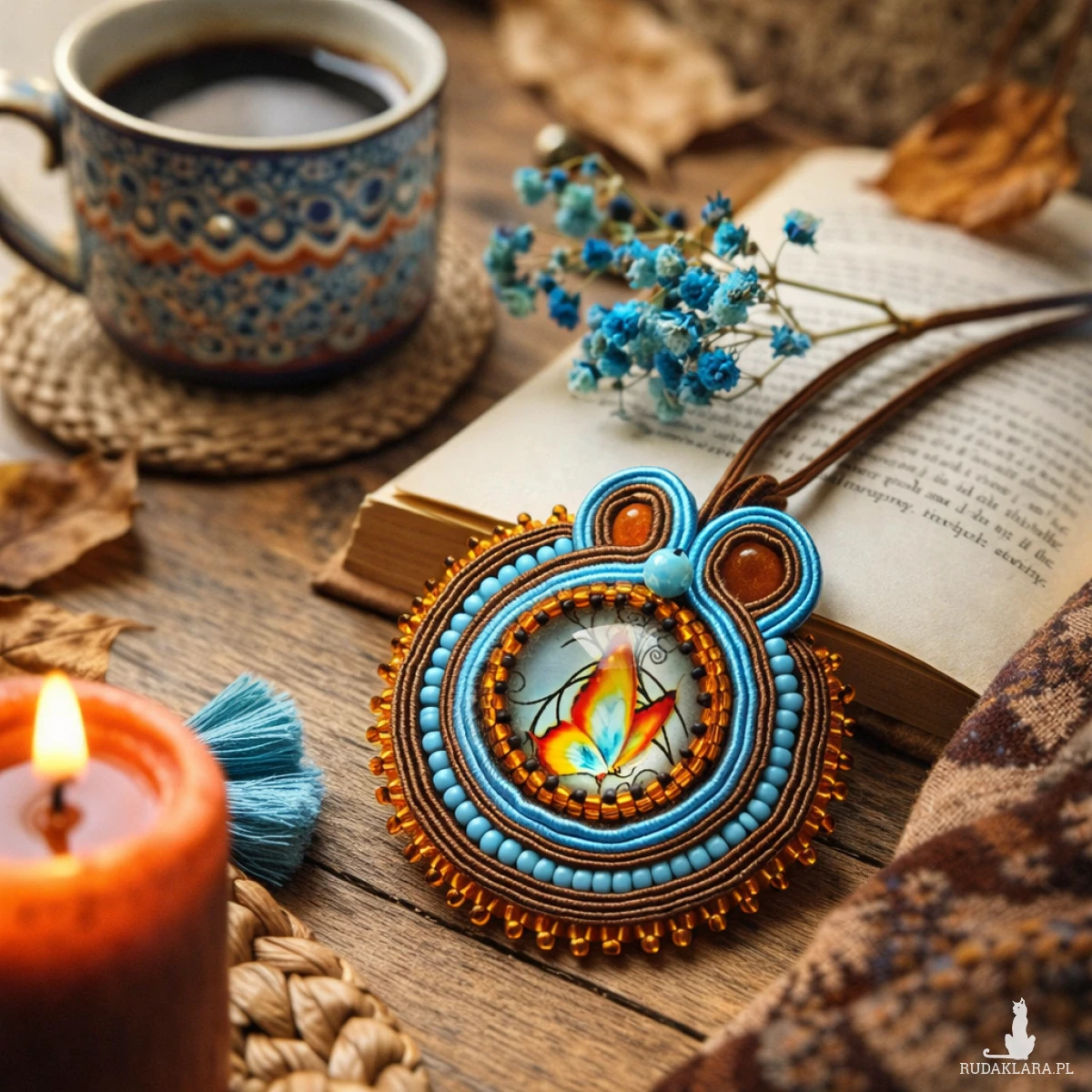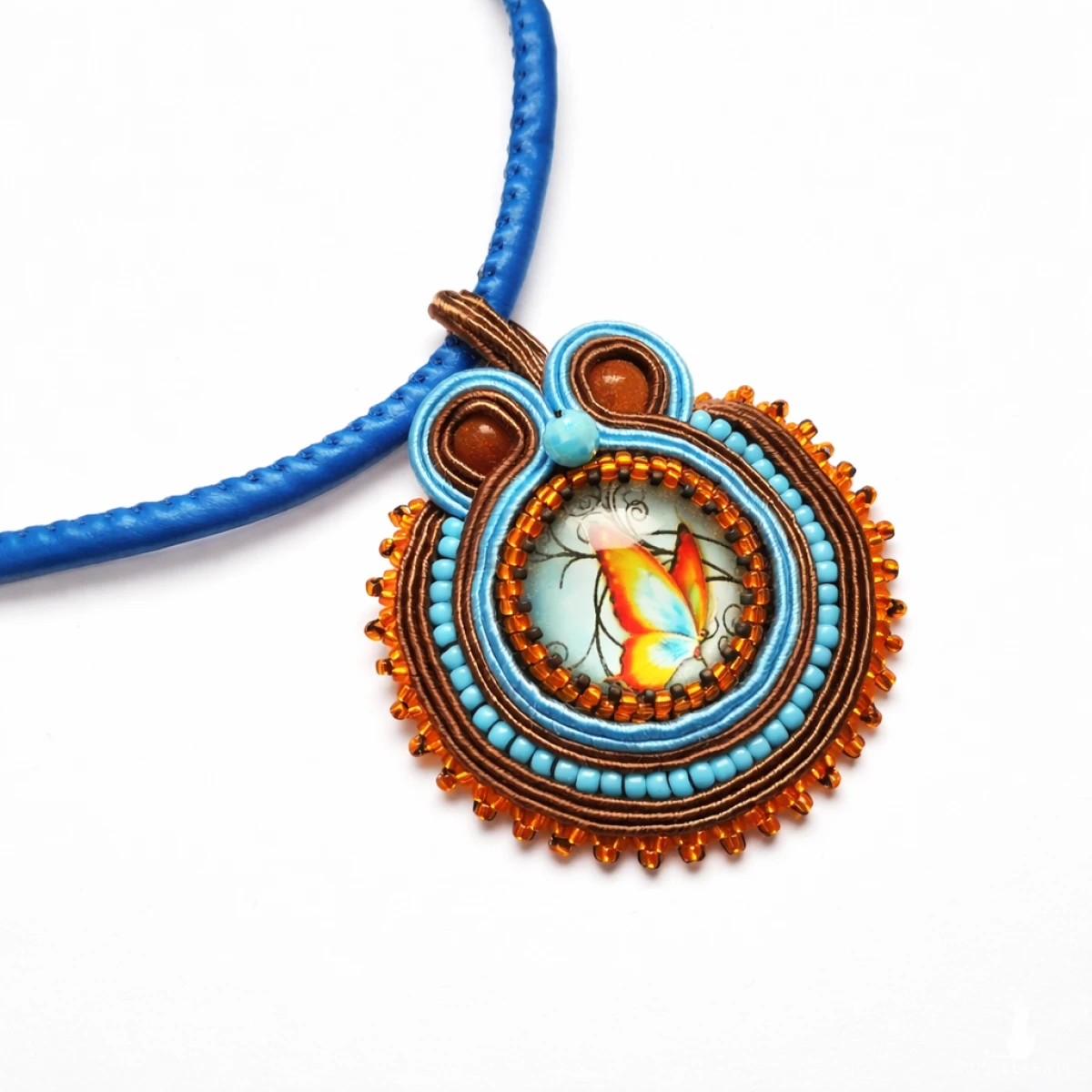 Wyjątkowy wisiorek wykonany techniką haftu sutasz to połączenie precyzji rękodzieła i oryginalnego designu. Stylizowany na kształt koła naszyjnik w odcieniach turkusu, brązu i złota przyciąga uwagę subtelnym motywem motyla umieszczonym w centralnej części ozdoby.