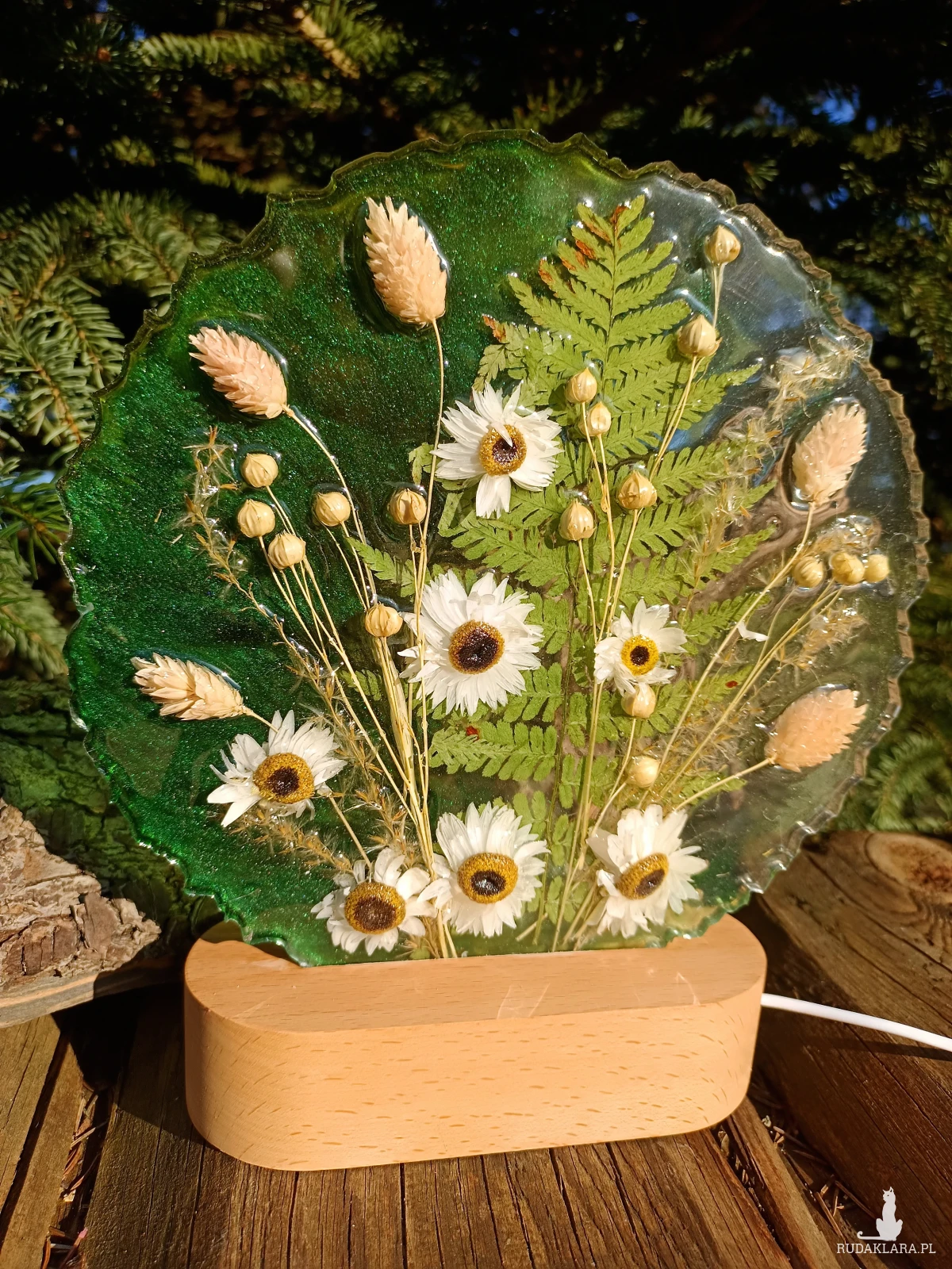 Lampka zasilana przewodem USB, daje subtelne światło rozświetlające zatopione w żywicy kwiaty.