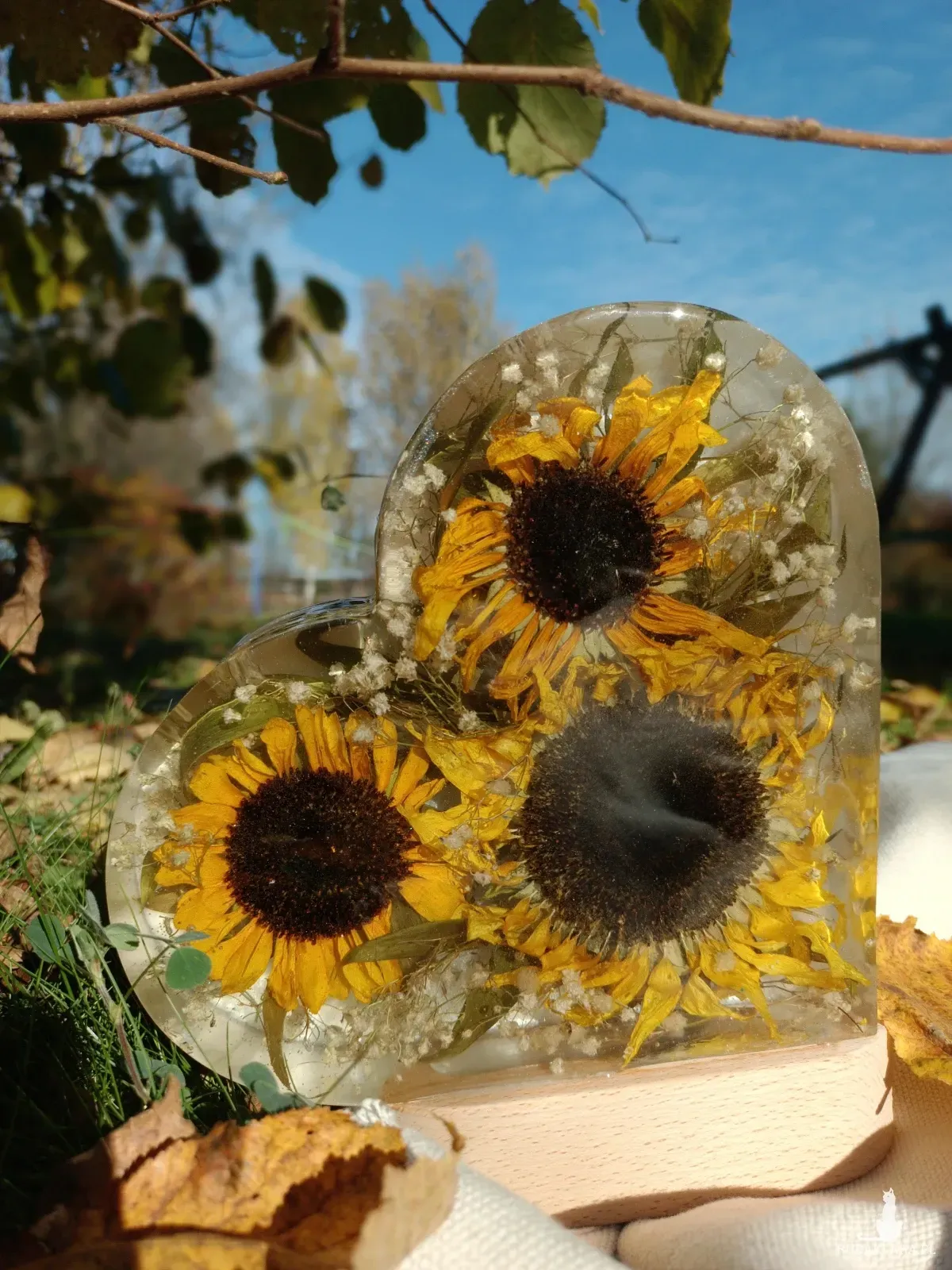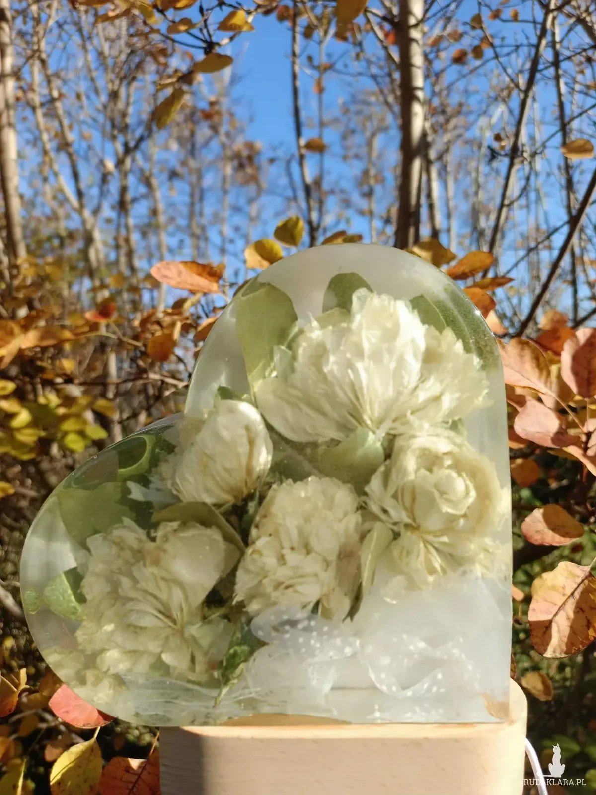 - Konserwacja bukietów w postaci pamiątek z autorskimi kompozycjami kwiatowymi utrwalonymi w żywicy.