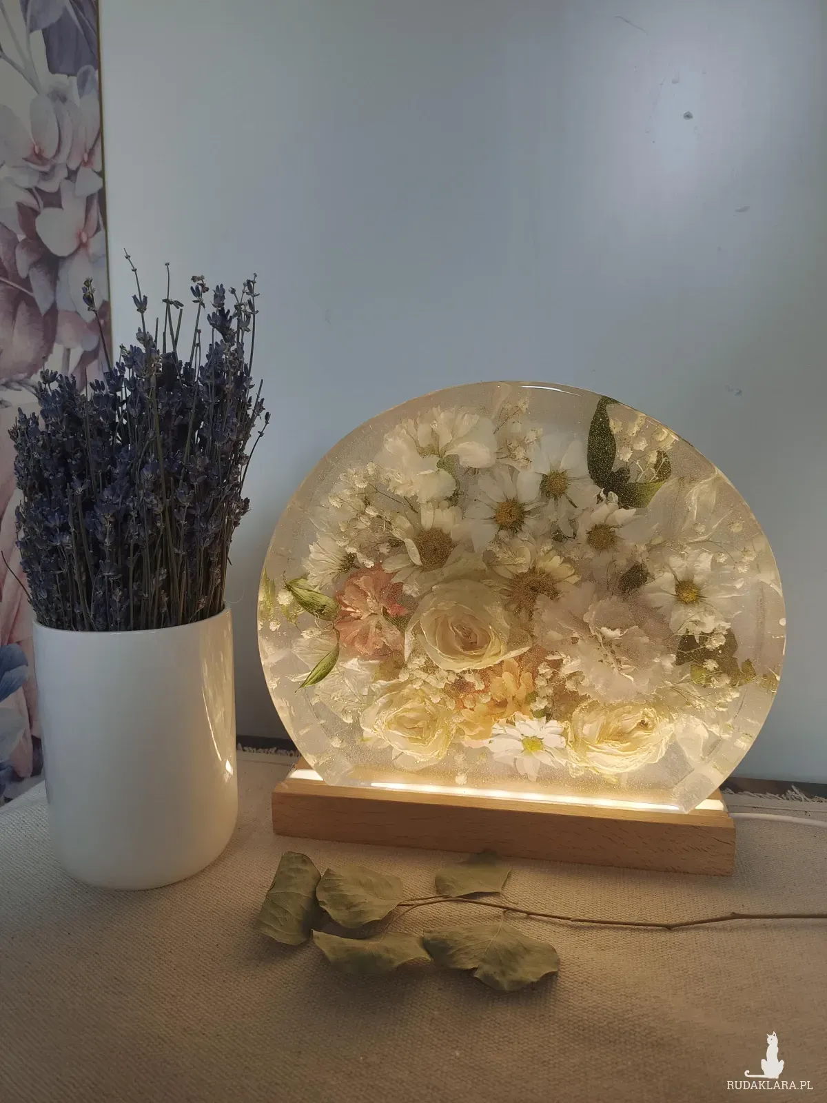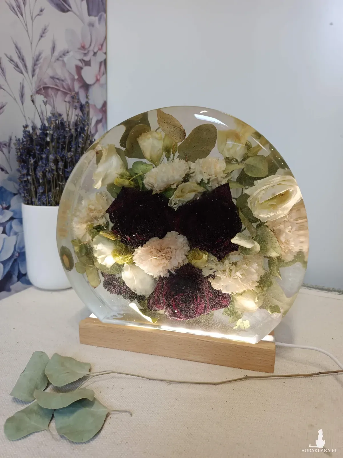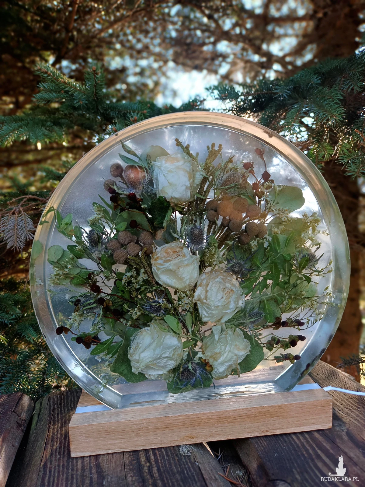 - Lampka w kształcie okręgu- wykonywana w głębokiej formie z kwiatów przestrzennych i drobnych na drewnianej podstawie z podświetleniem LED, zasilane kablem usb.