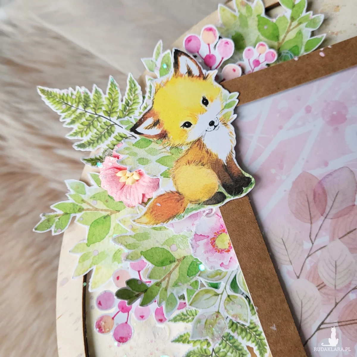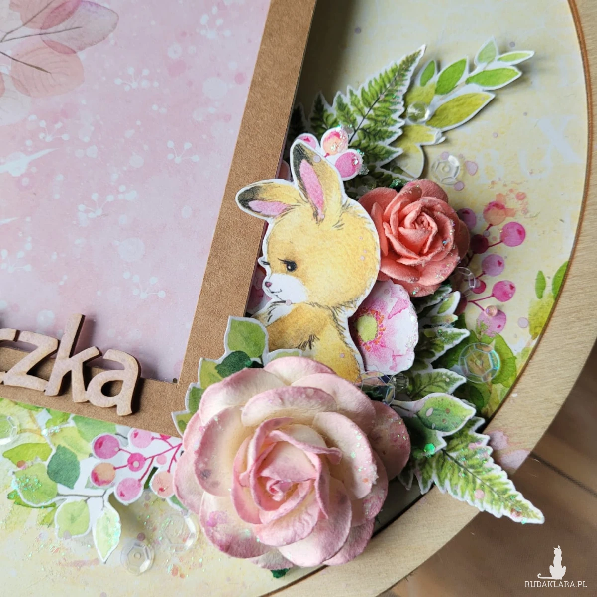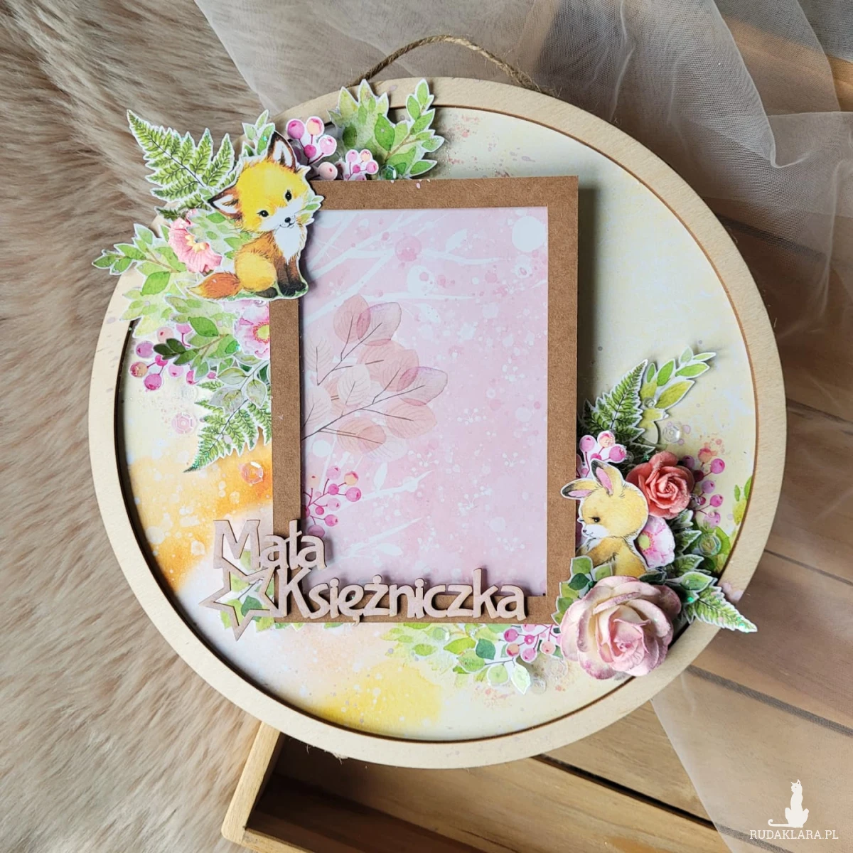 Wyjątkowa, ręcznie wykonana ramka na zdjęcie dla dziewczynki, która będzie piękną ozdobą każdego pokoju. Ramka ma kształt koła o średnicy 25 cm i jest gotowa do zawieszenia na ścianie. Urocze detale, takie jak delikatne papierowe kwiaty, wycięte listki oraz słodkie figurki zwierzątek, nadają jej bajkowy charakter.