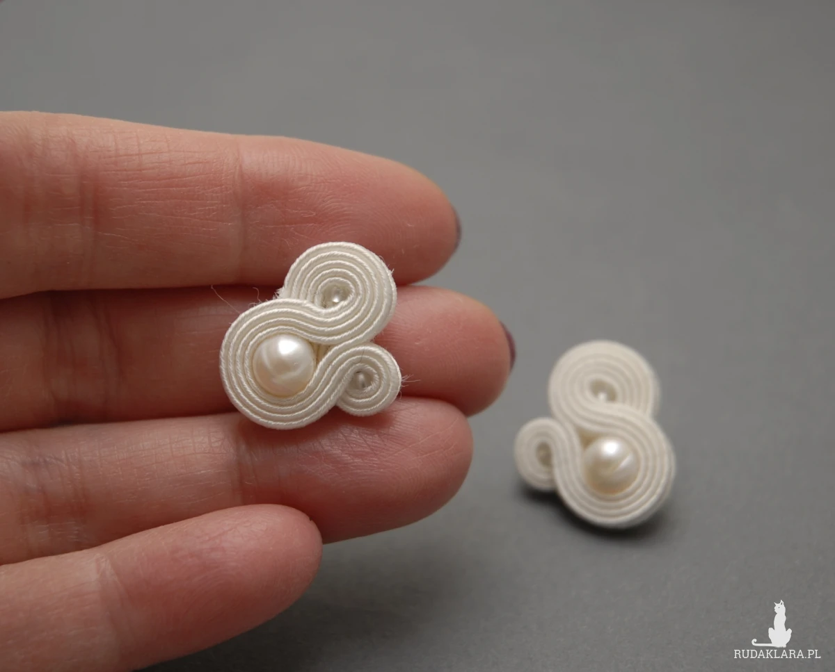 oferuję małe białe kolczyki zrobione techniką sutasz, ozdobione perłami seashell i koralikiem