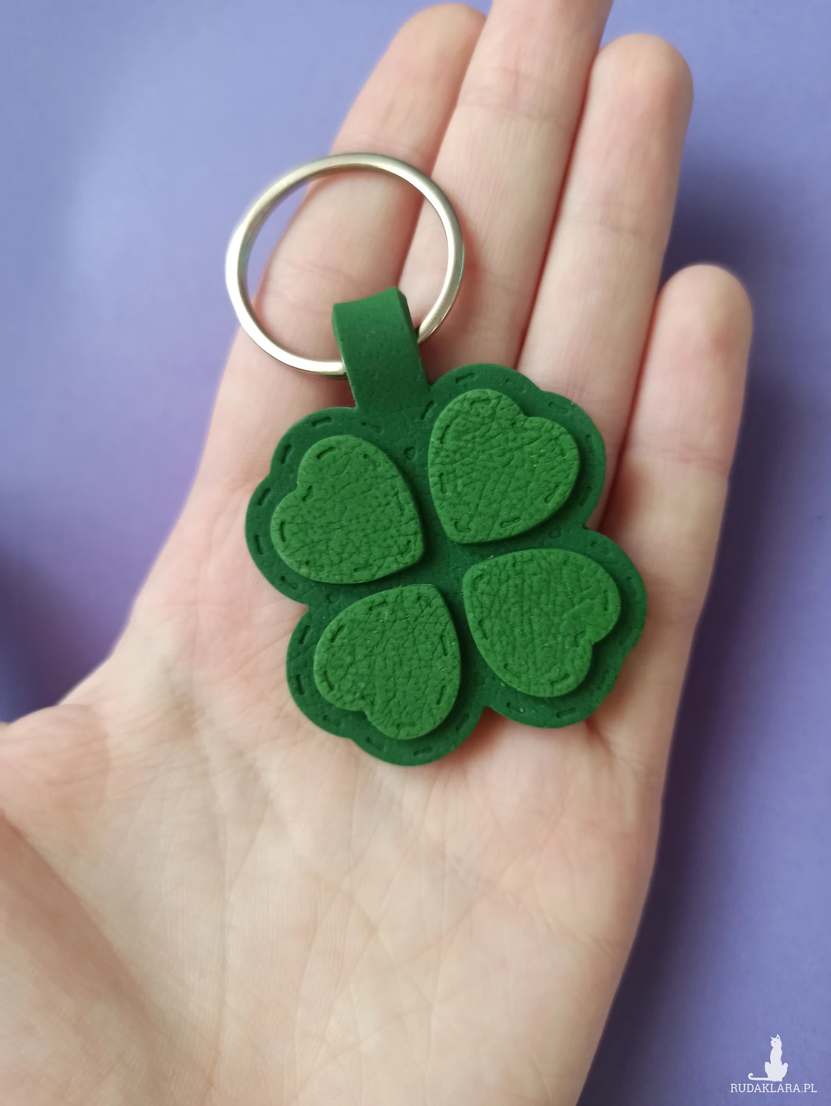 Breloczek czterolistną koniczyna z gliny polimerowej. Efekt szytej skóry.