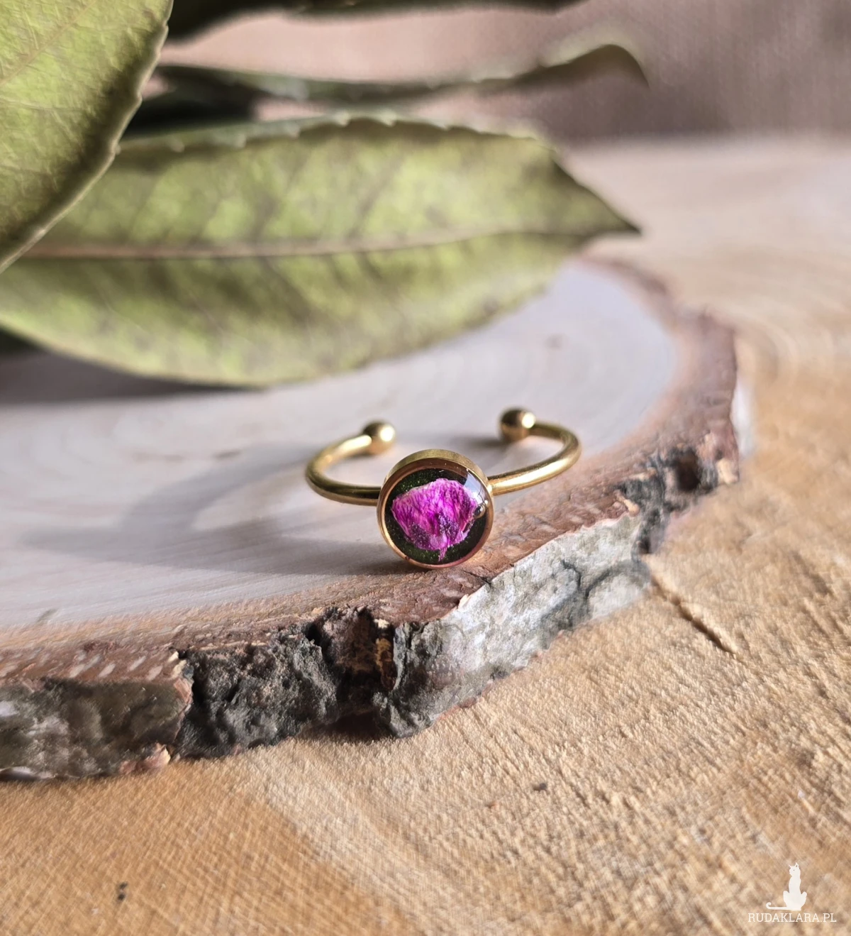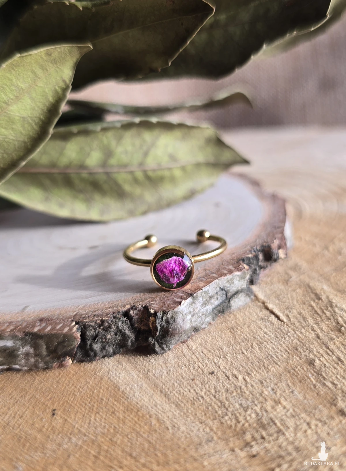 Oferuję Państwu unikalną biżuterię. Pierścionek jest wykonany z suszonych kwiatów i żywicy epoksydowej. Biżuteria jest wspaniałym i oryginalnym prezentem na lata.