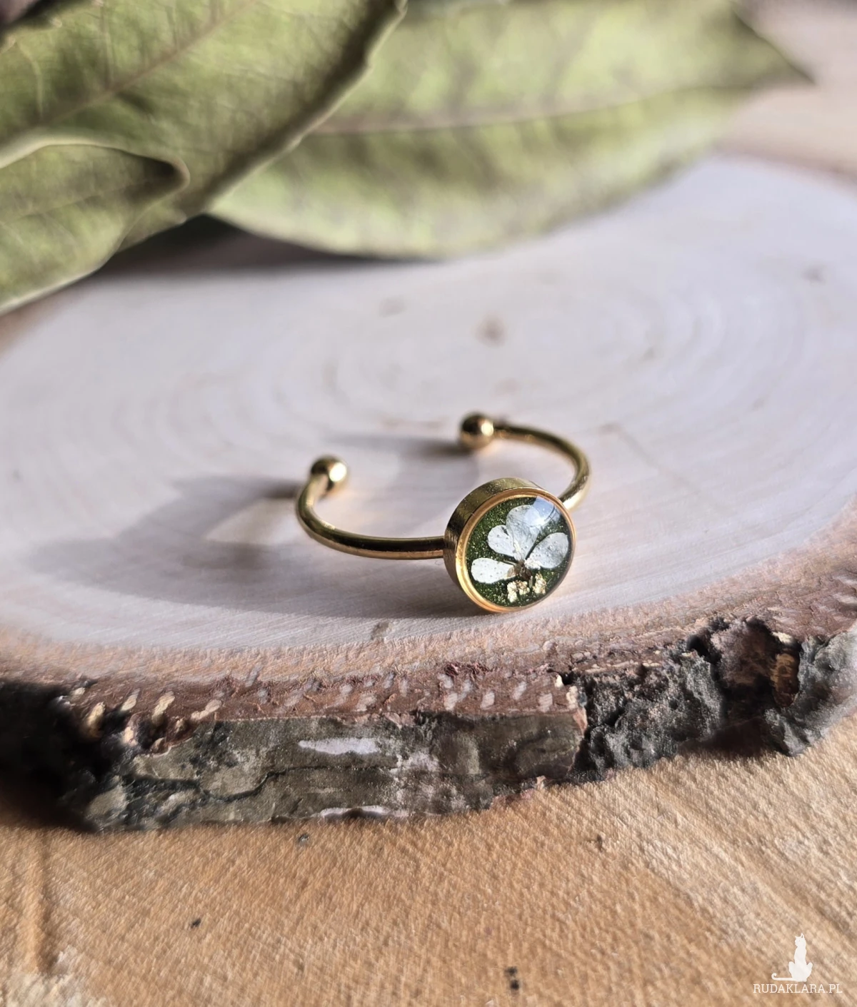 Oferuję Państwu unikalną biżuterię. Pierścionek jest wykonany z suszonych kwiatów i żywicy epoksydowej. Biżuteria jest wspaniałym i oryginalnym prezentem na lata.