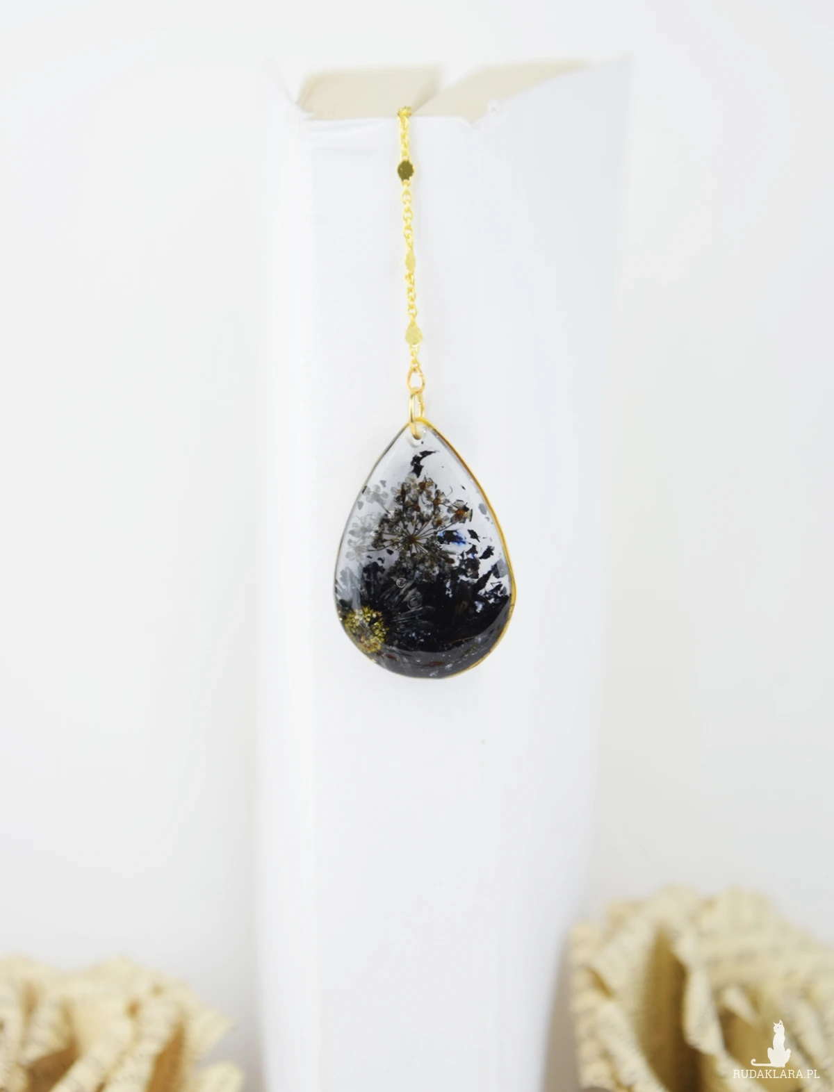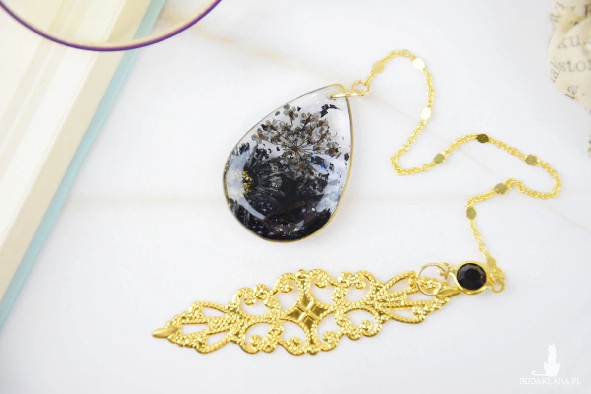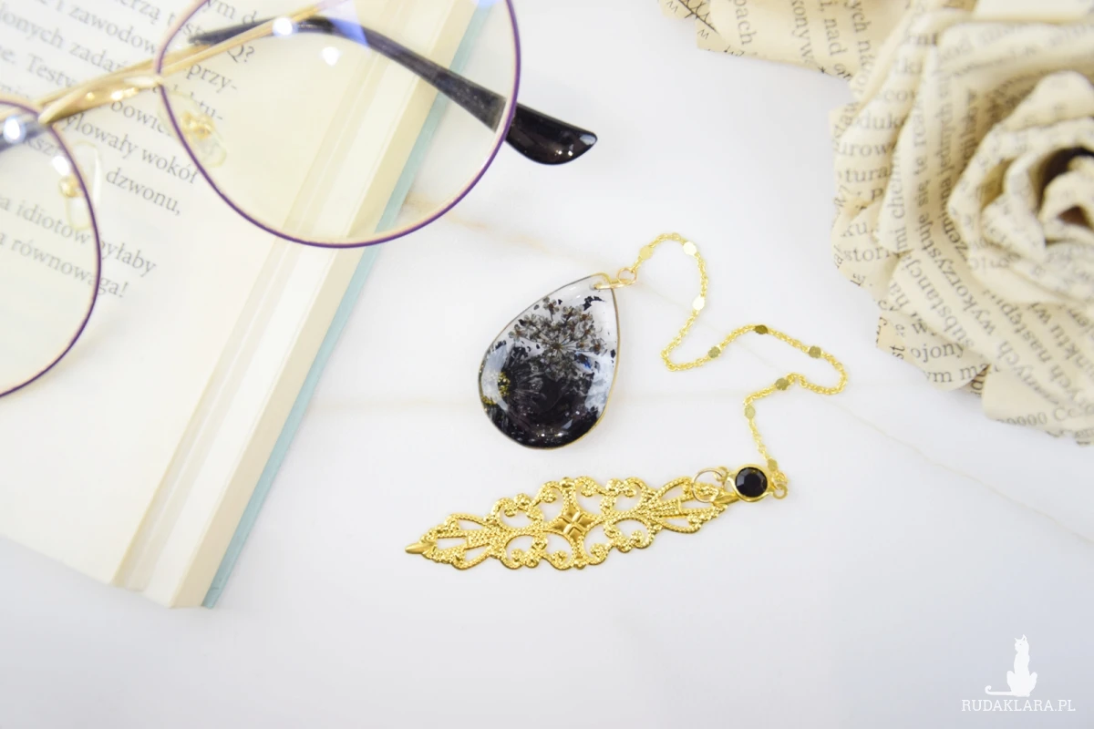 Mam dla Ciebie ręcznie stworzoną zakładkę do książki. Metalowa, złota rama wypełniona kompozycją z ręcznie zbieranych, suszonych i barwionych kwiatów, w całości zalana żywicą. Do drugiej części zakładki prowadzi ozdobny łańcuszek przeplatany złotymi blaszkami. Na końcu znajduje się złota, ozdobna blaszka, połączona z łańcuszkiem szklanym oczkiem, kolorystycznie pasującym do całości zakładki.