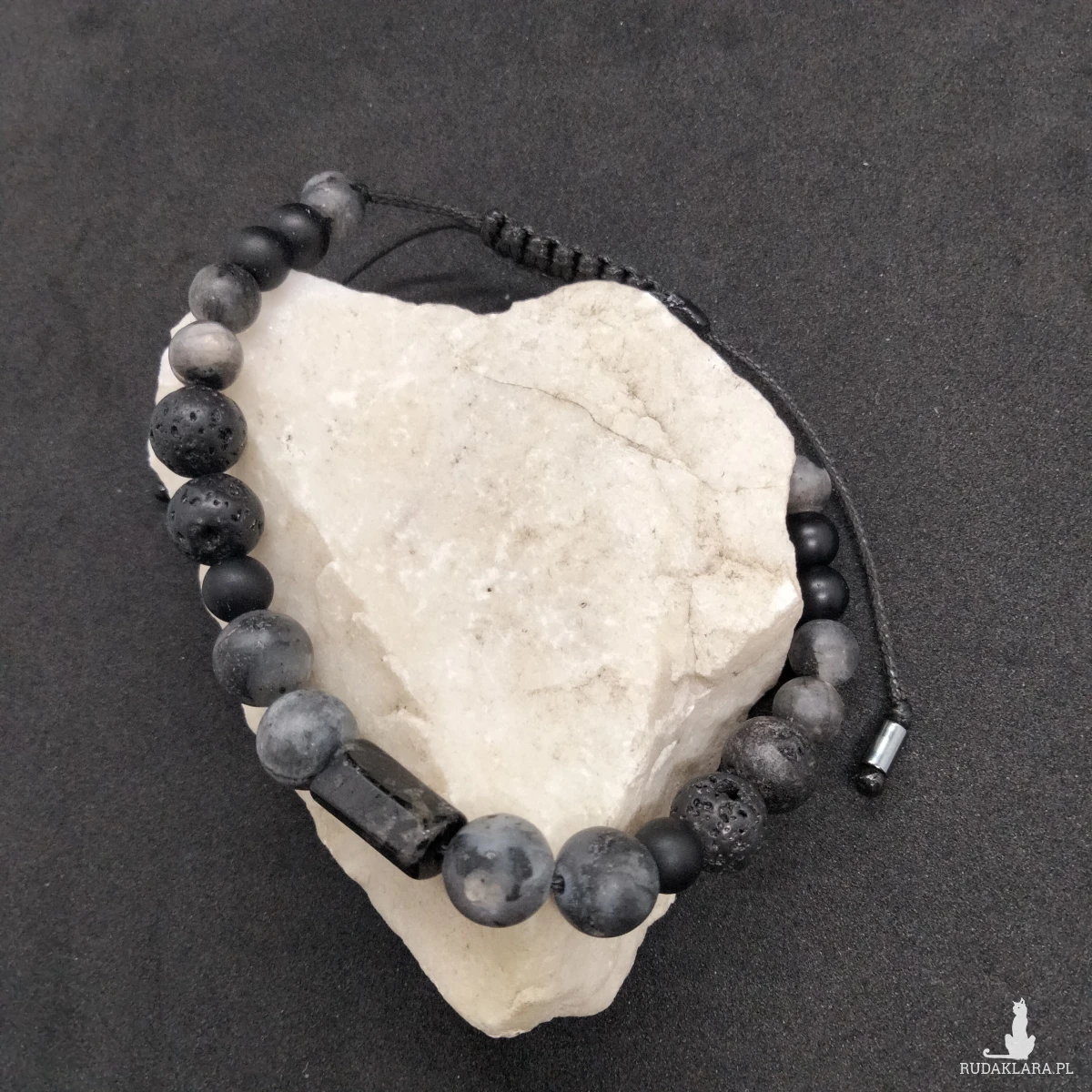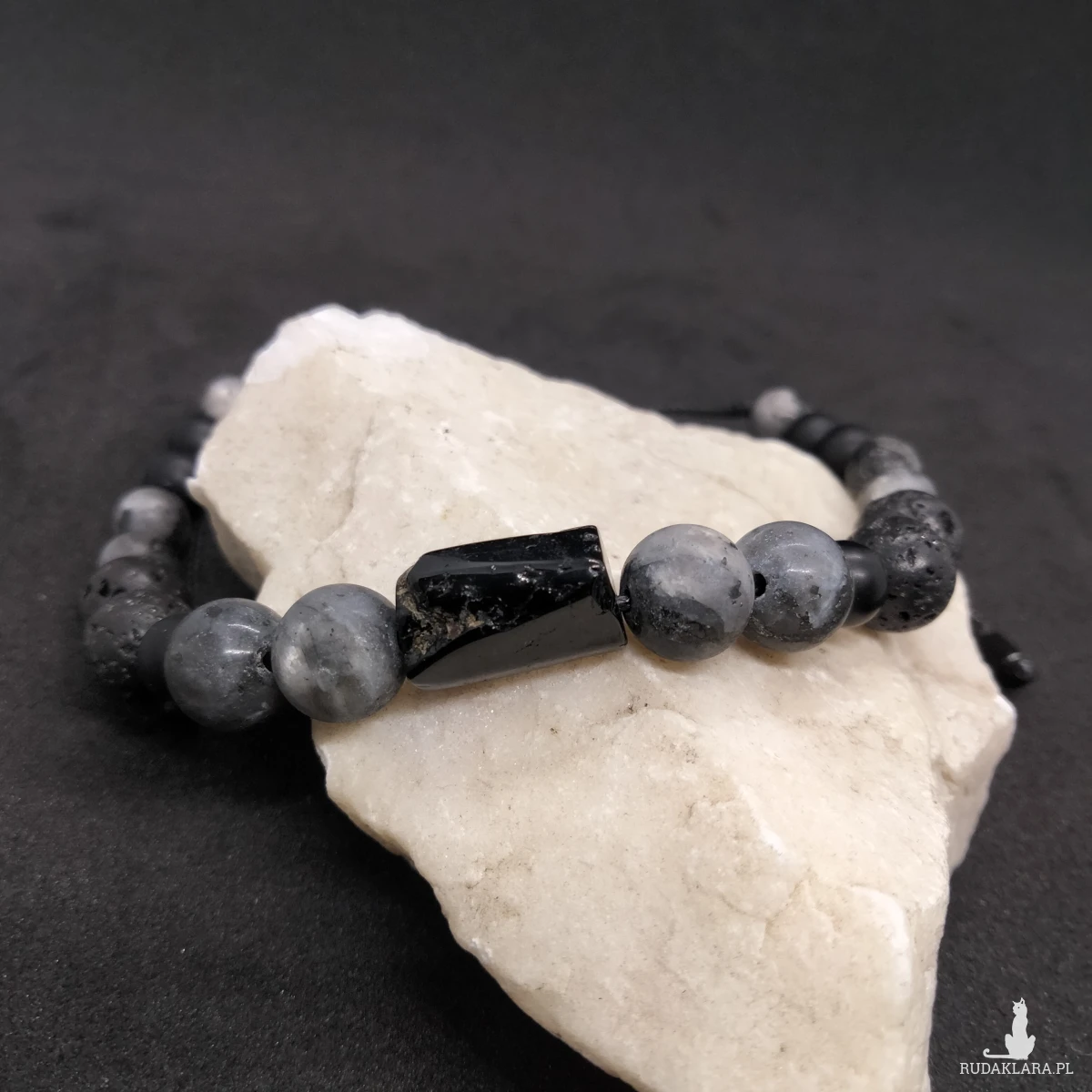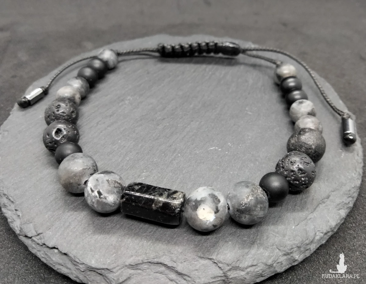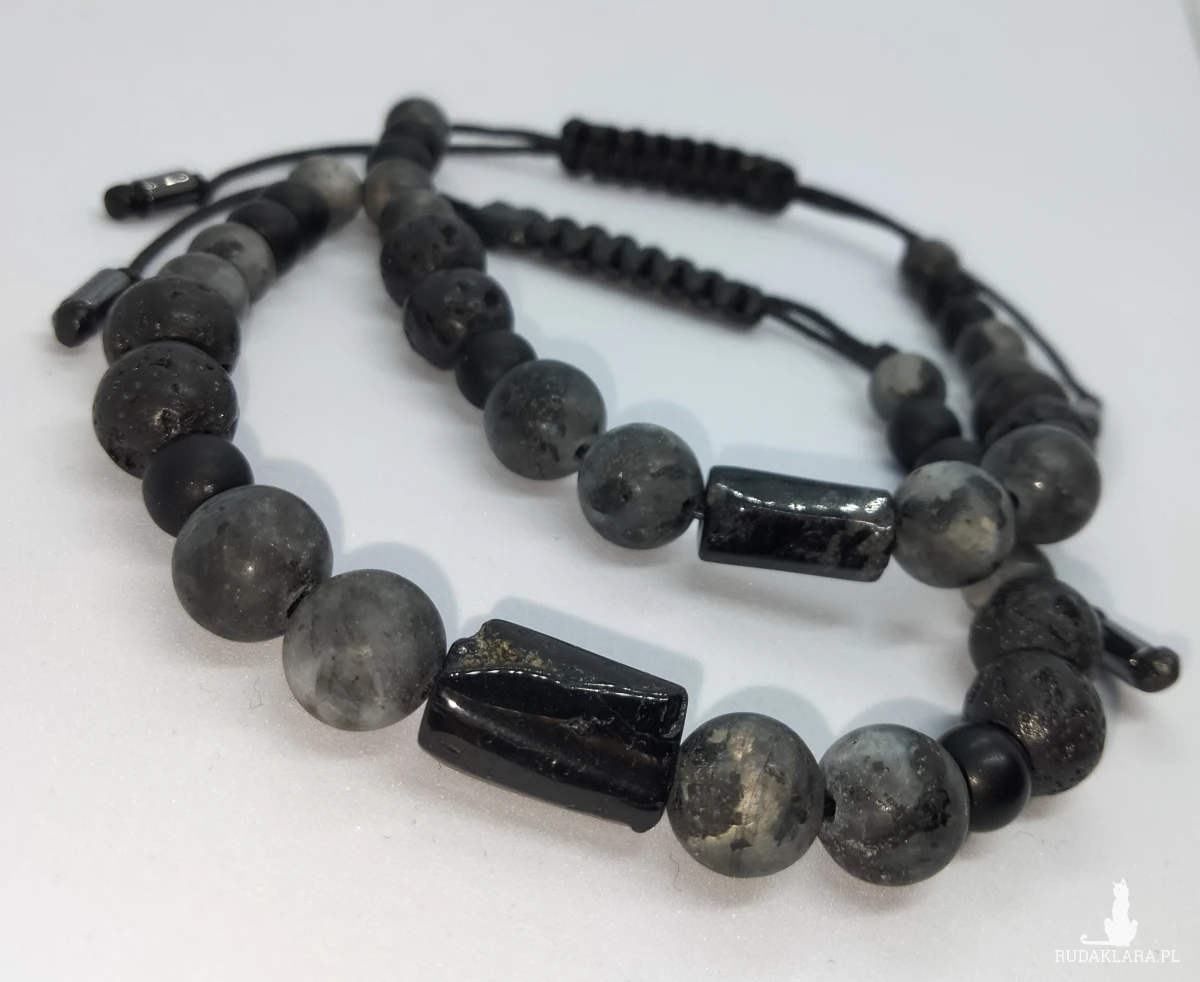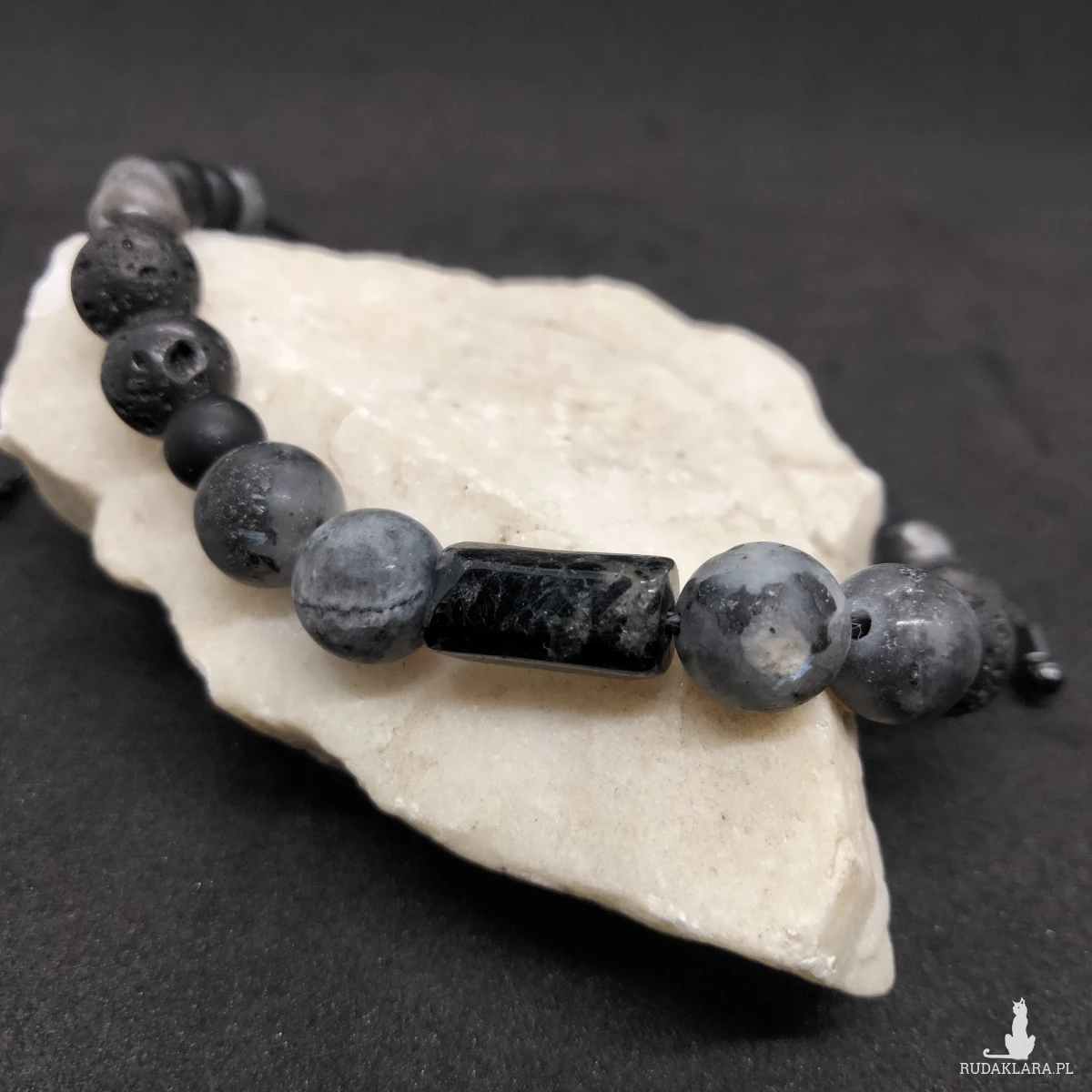 Bransoleta męska, na regulowanym sznurku jubilerskim z czarnym turmalinem, onyksem, lawą wulkaniczną i czarnym labradorytem (larvikit).