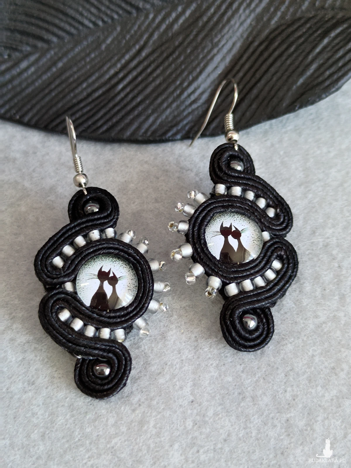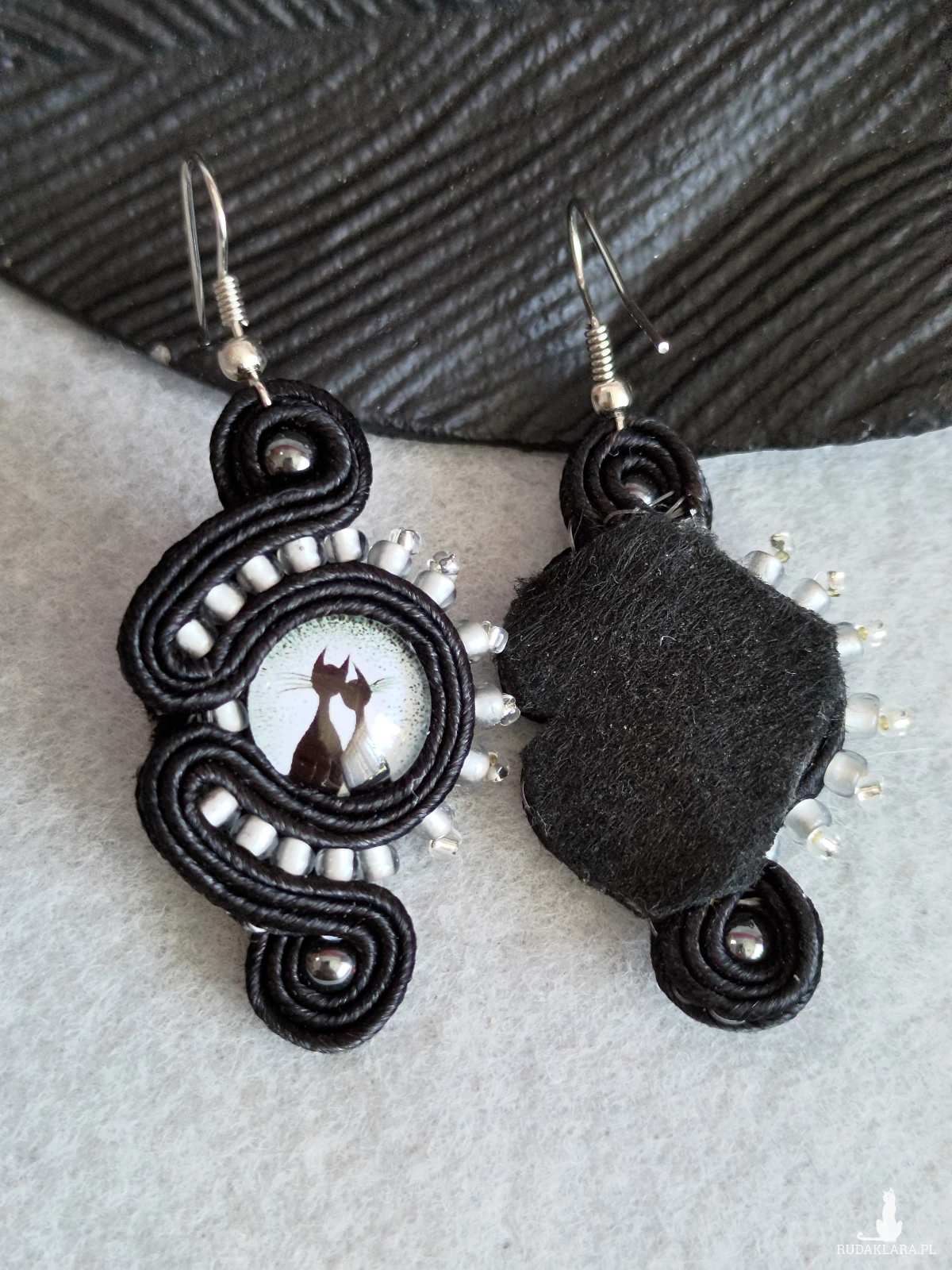 Kolczyki wykonane są techniką haftu sutasz, który polega na zszywaniu ze sobą sznurków sutasz i wszywaniu między sznurki drobnych koralików, minerałów oraz ceramiki. Sercem kolczyków jest kaboszon z grafiką przedstawiającą kotki. Kaboszon opleciony jest czarnym sznurkiem sutasz oraz ozdobiony japońskimi koralikami toho oraz kulkami hematytu. Tył kolczyków podklejony jest czarnym filcem. Kolczyki zawieszone są na antyalergicznych biglach.