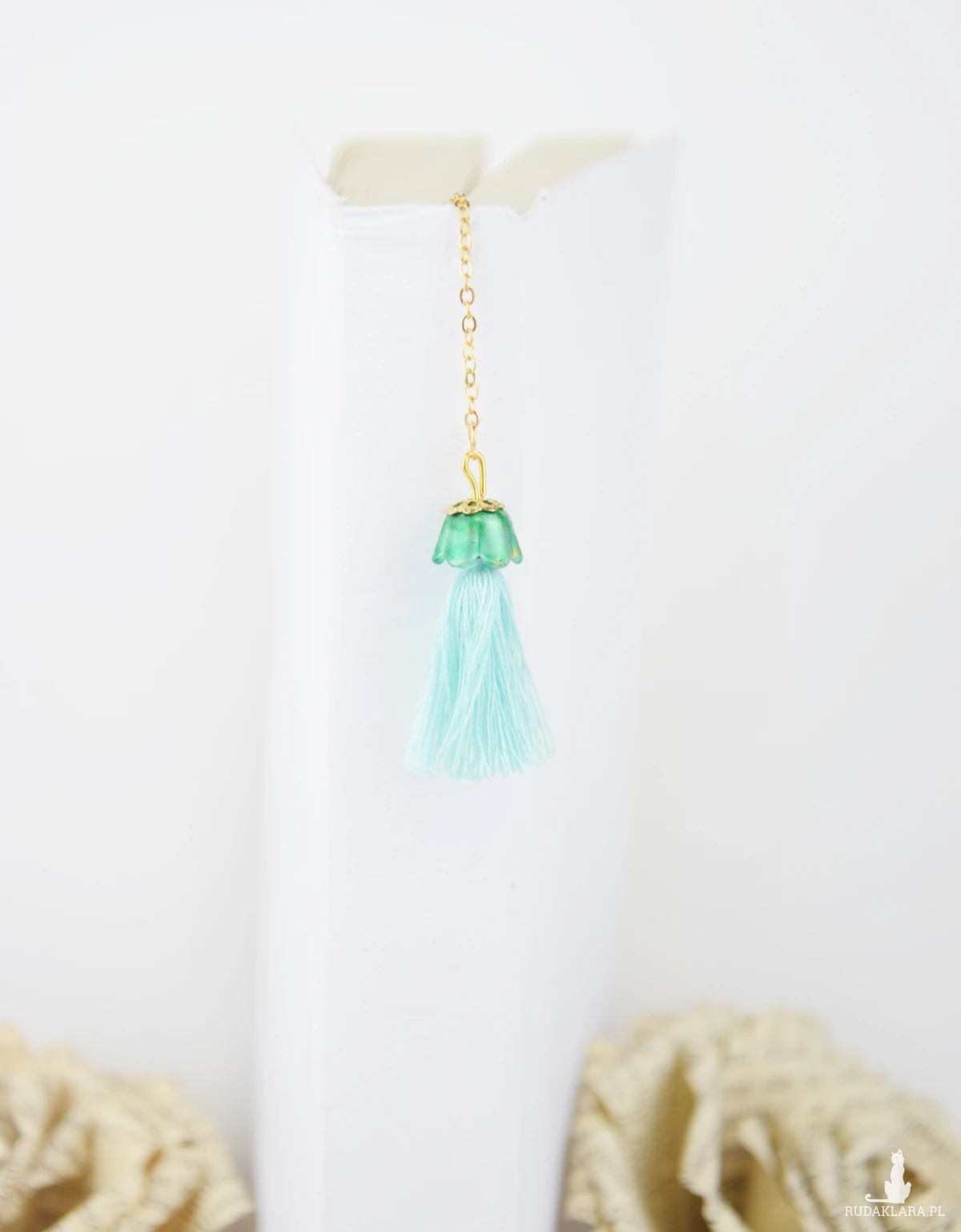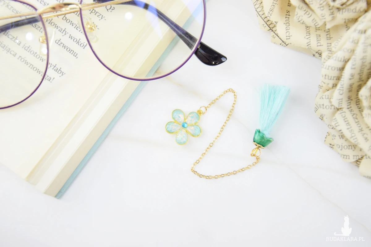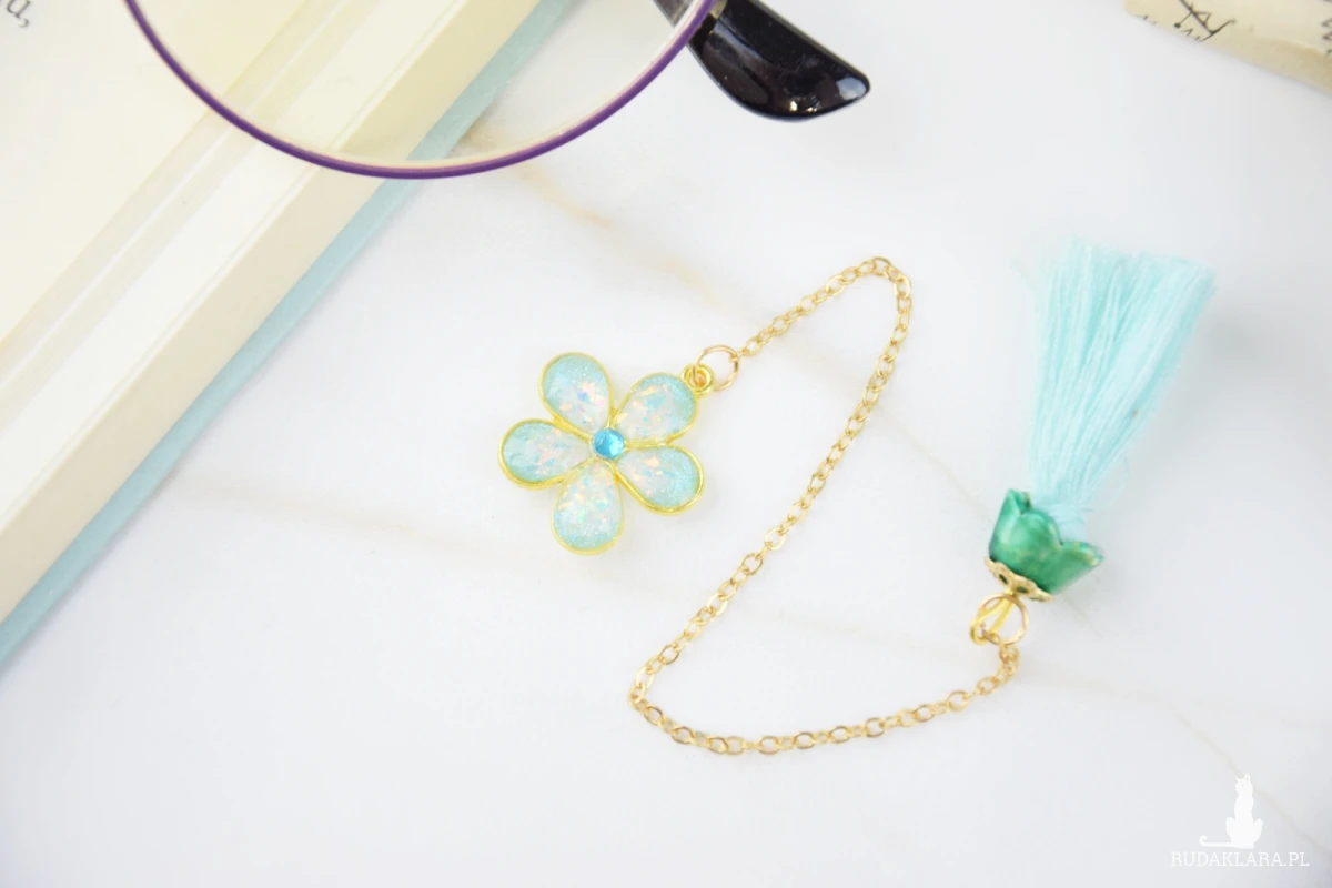 Mam dla Ciebie ręcznie stworzoną zakładkę do książki. Metalowa rama wypełniona żywicą z elementami brokatów, oraz pigmentów najwyższej jakości. Środek kwiatu stanowi cyrkonia. Do drugiej części zakładki prowadzi drobny łańcuszek. Na końcu znajduje się chwost otulony ręcznie barwionym kwiatem, na którego szcycie znajduje się metalowa, ażurowa przekładka.