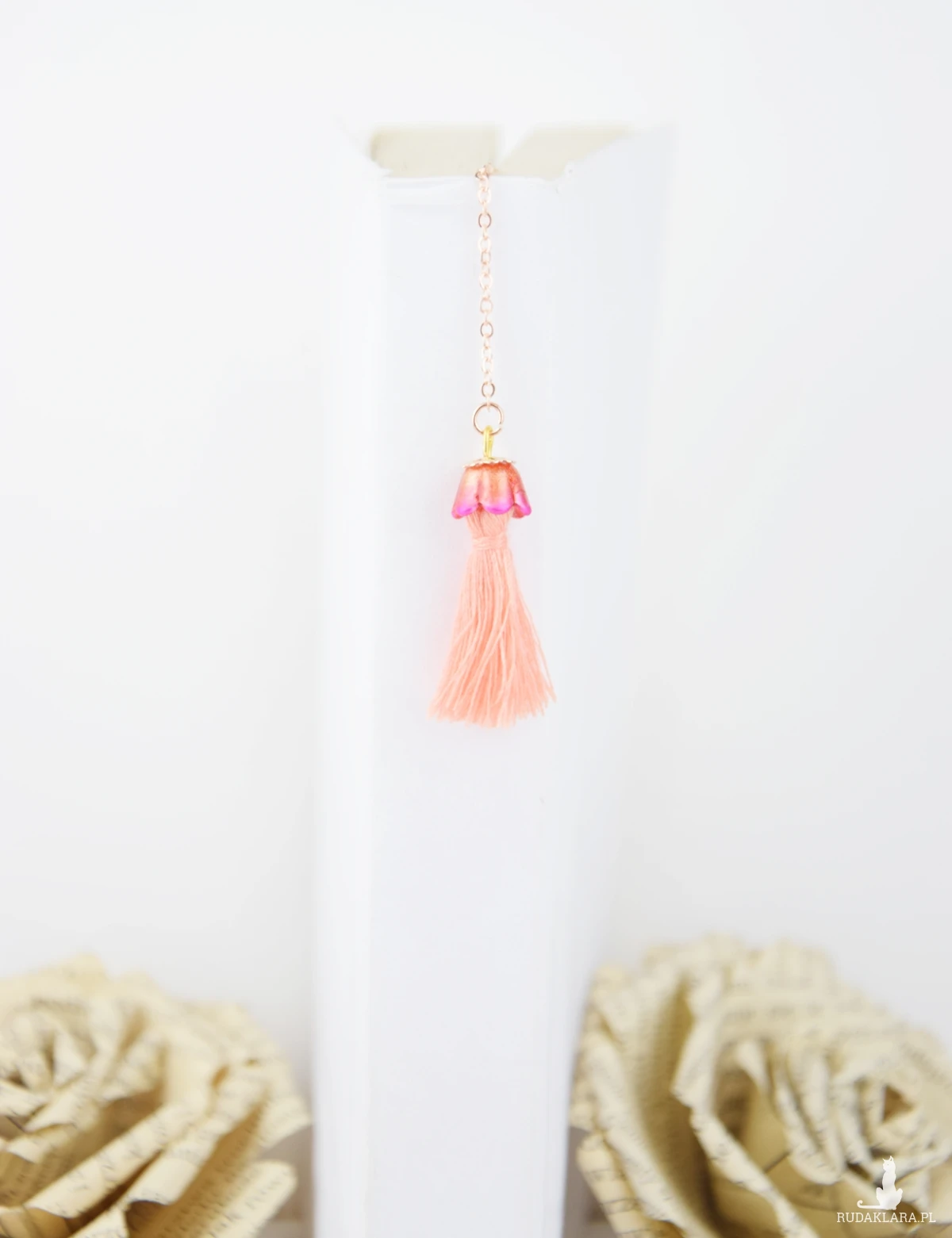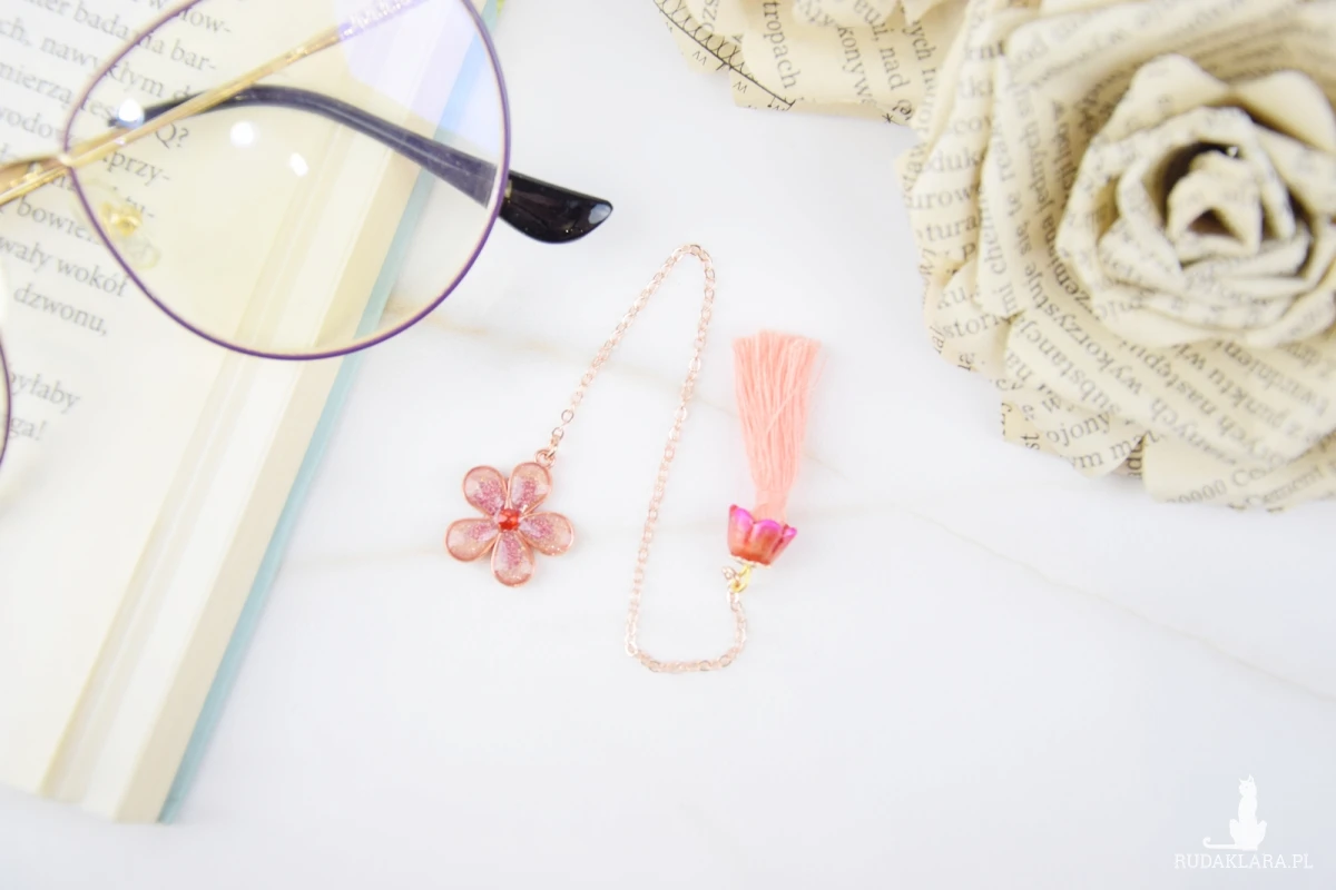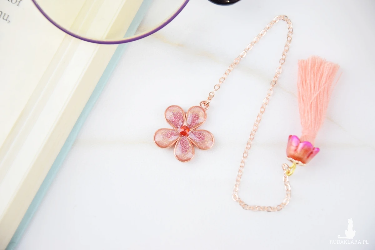 Mam dla Ciebie ręcznie stworzoną zakładkę do książki. Metalowa rama wypełniona żywicą z elementami brokatów, oraz pigmentów najwyższej jakości. Środek kwiatu stanowi cyrkonia. Do drugiej części zakładki prowadzi drobny łańcuszek. Na końcu znajduje się chwost otulony ręcznie barwionym kwiatem, na którego szcycie znajduje się metalowa, ażurowa przekładka.