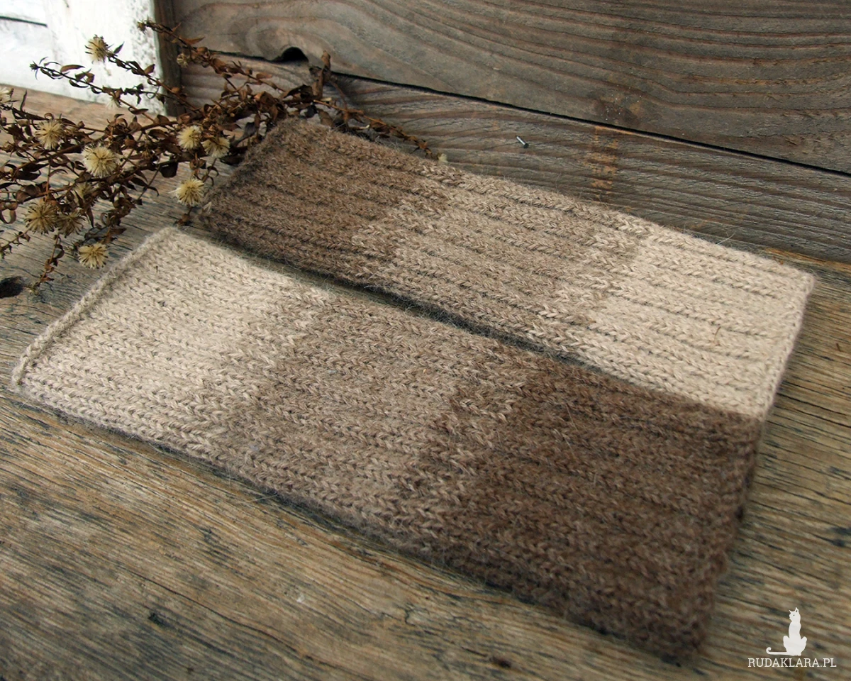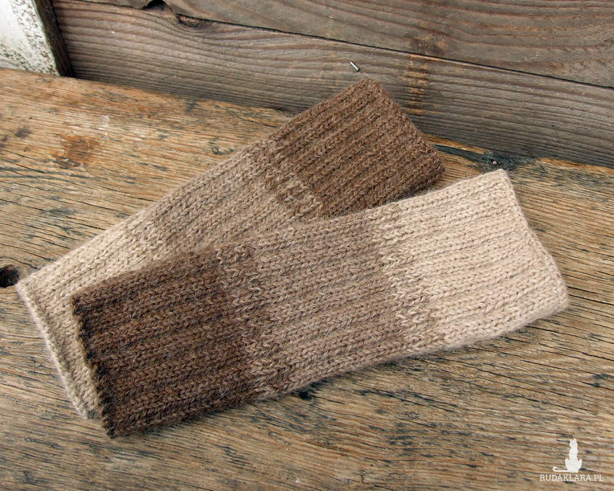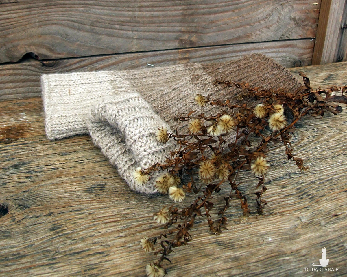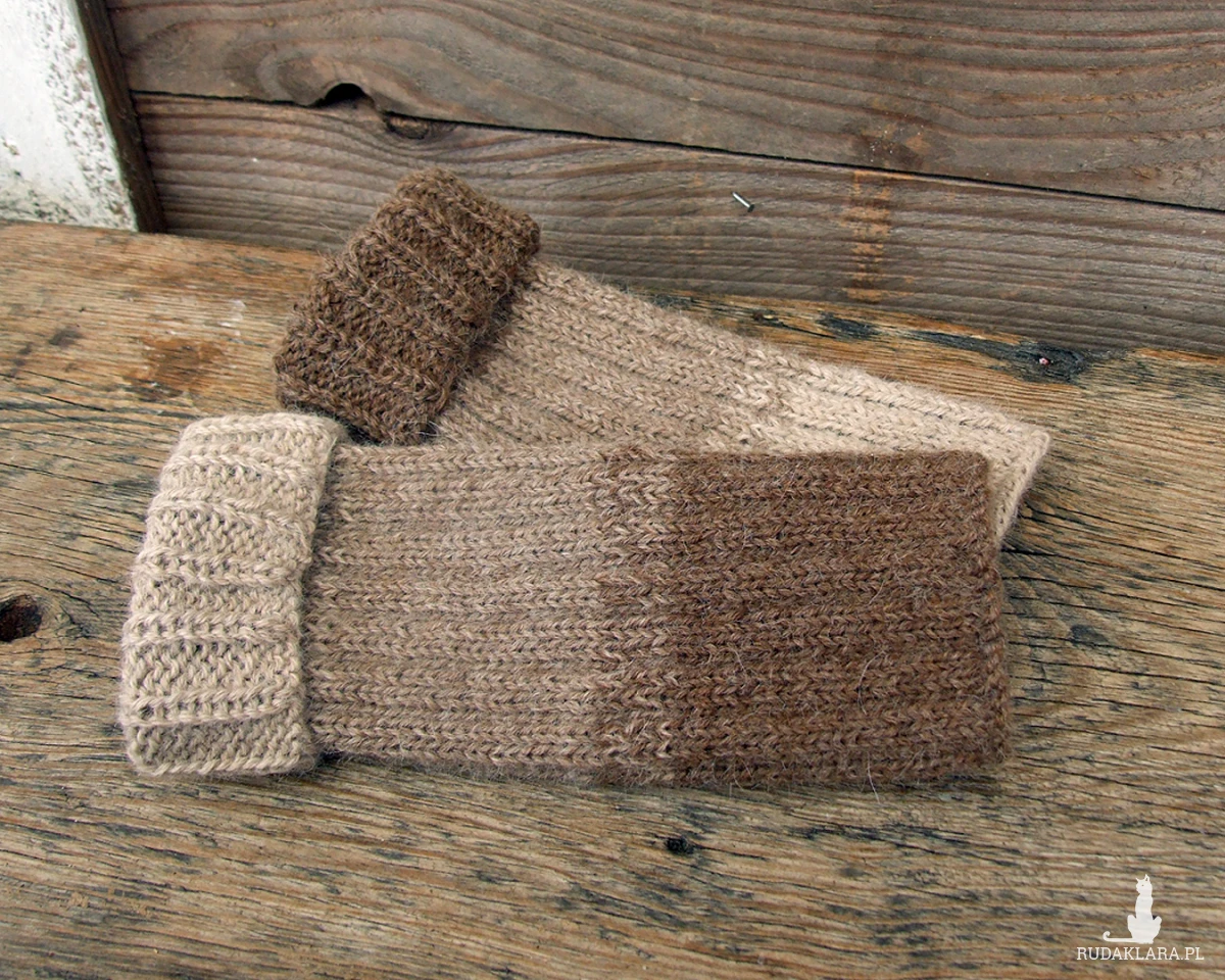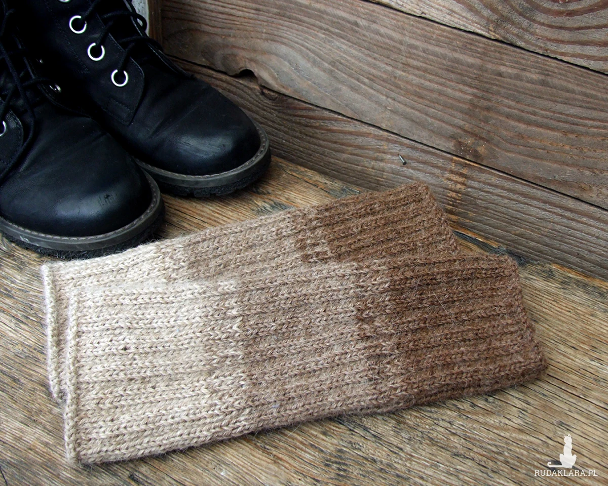 Wełniane, bardzo ciepłe getry na nogi, wykonane ręcznie na drutach w trzech odcieniach beżowego i brązowego.
