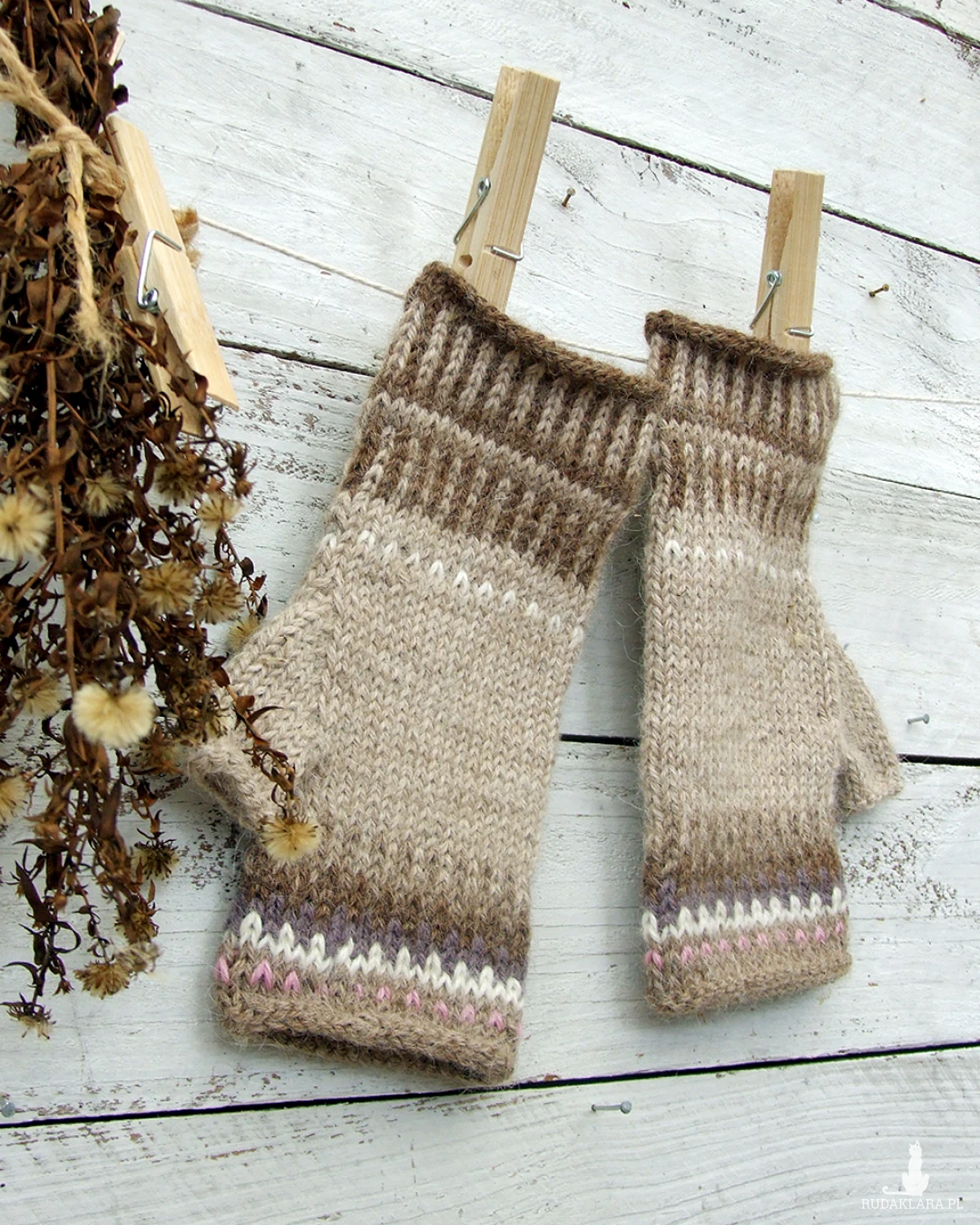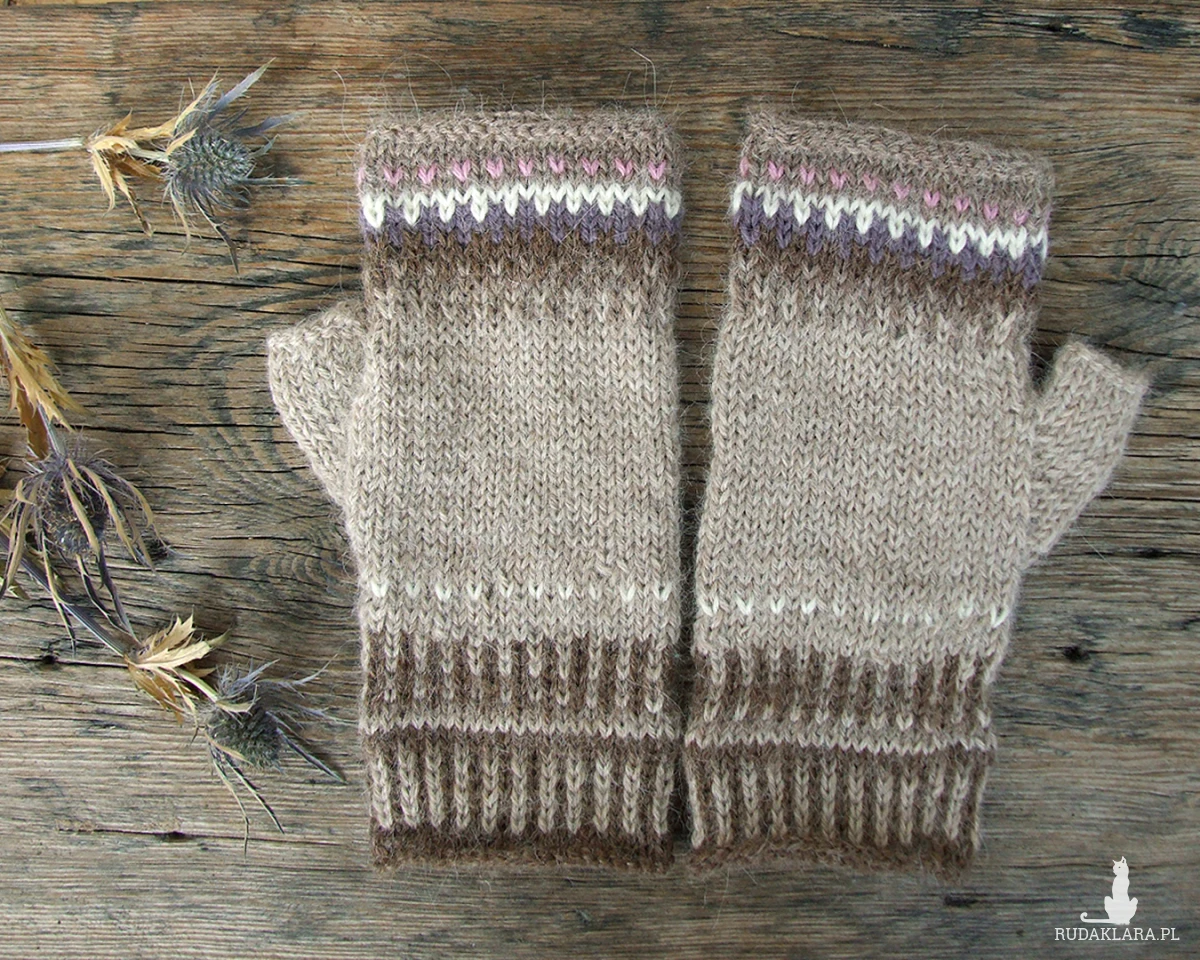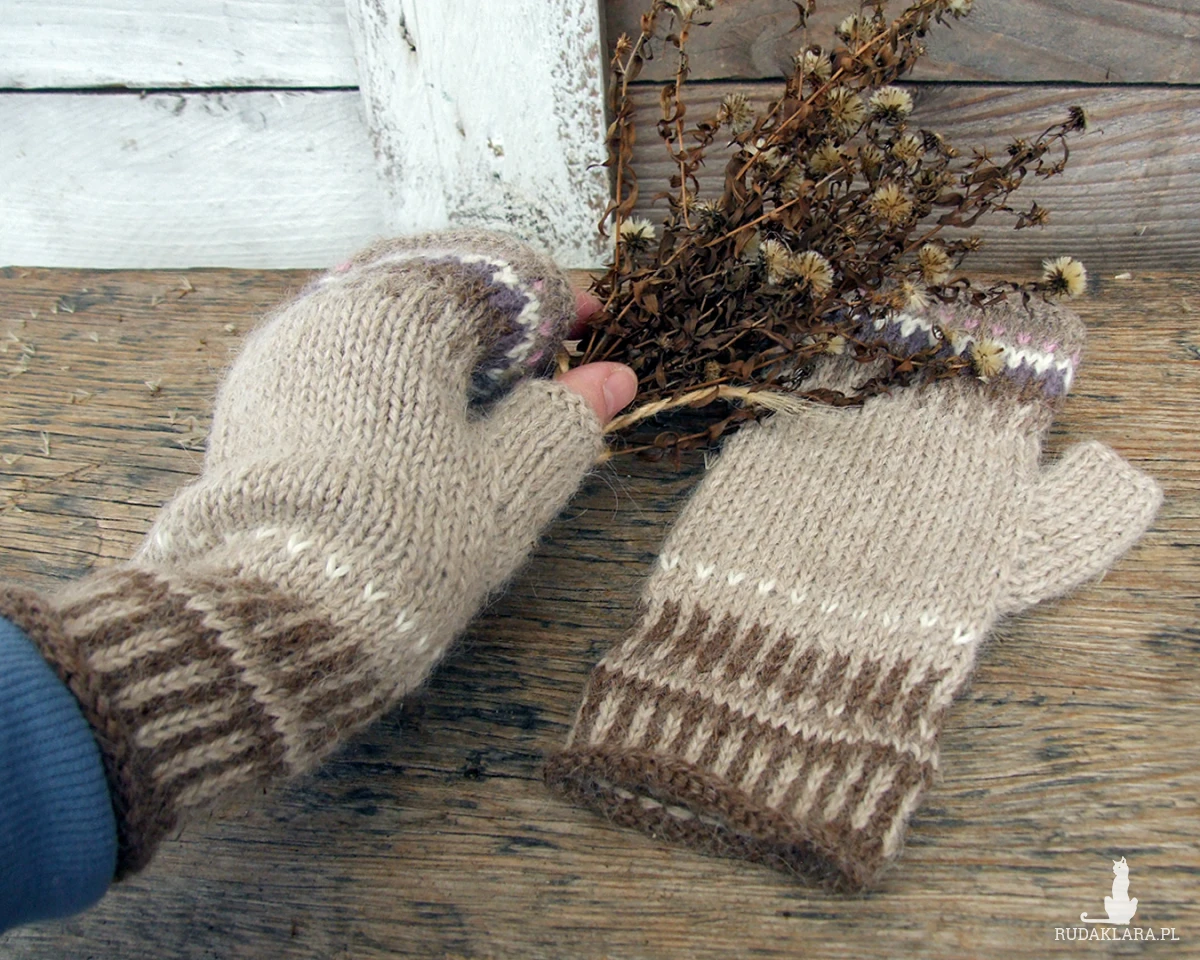 Mitenki z Alpaki - cieplutkie, miłe dla skóry, niegryzące. Kolory połączyłam gładkim wzorem żakardowym, mitenki są bezszwowe. Naturalność kolorów pięknie się łączy z naturalnością alpaki.