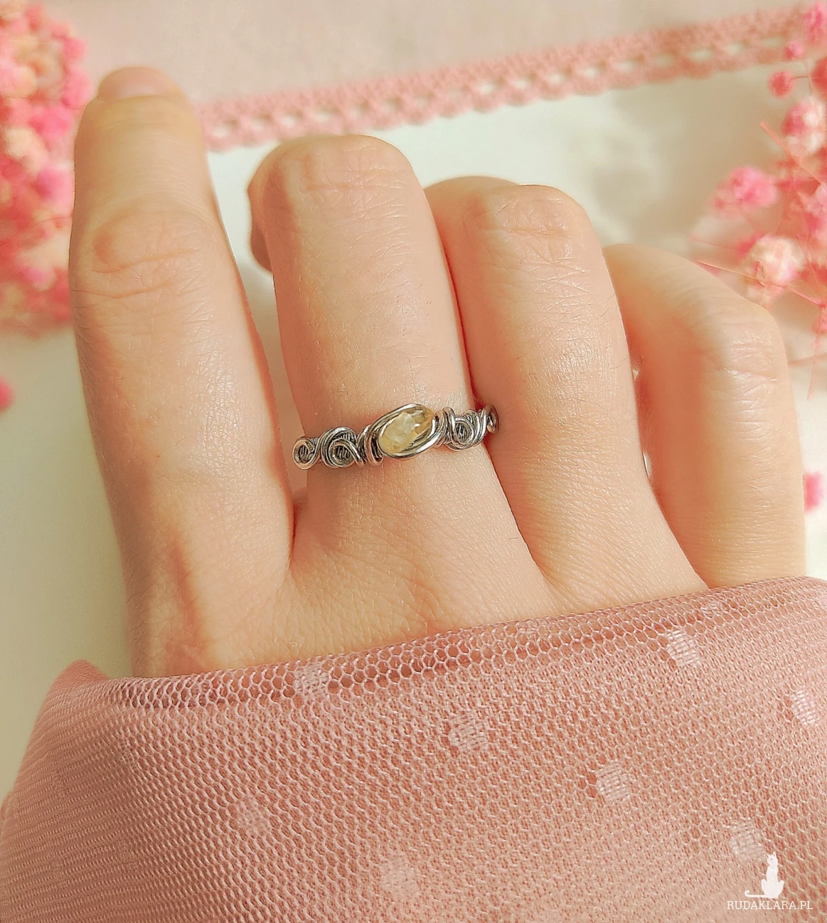 Pierścionek został wykonany ręcznie metodą wire wrapping, co oznacza, że drut stalowy został starannie opleciony wokół kamienia, tworząc unikalny wzór. Stal chirurgiczna, z której powstała ta biżuteria, jest materiałem hipoalergicznym, odpornym na działanie wilgoci i czynników zewnętrznych. Dzięki temu pierścionek może być noszony na co dzień bez obaw o jego trwałość czy reakcje alergiczne.