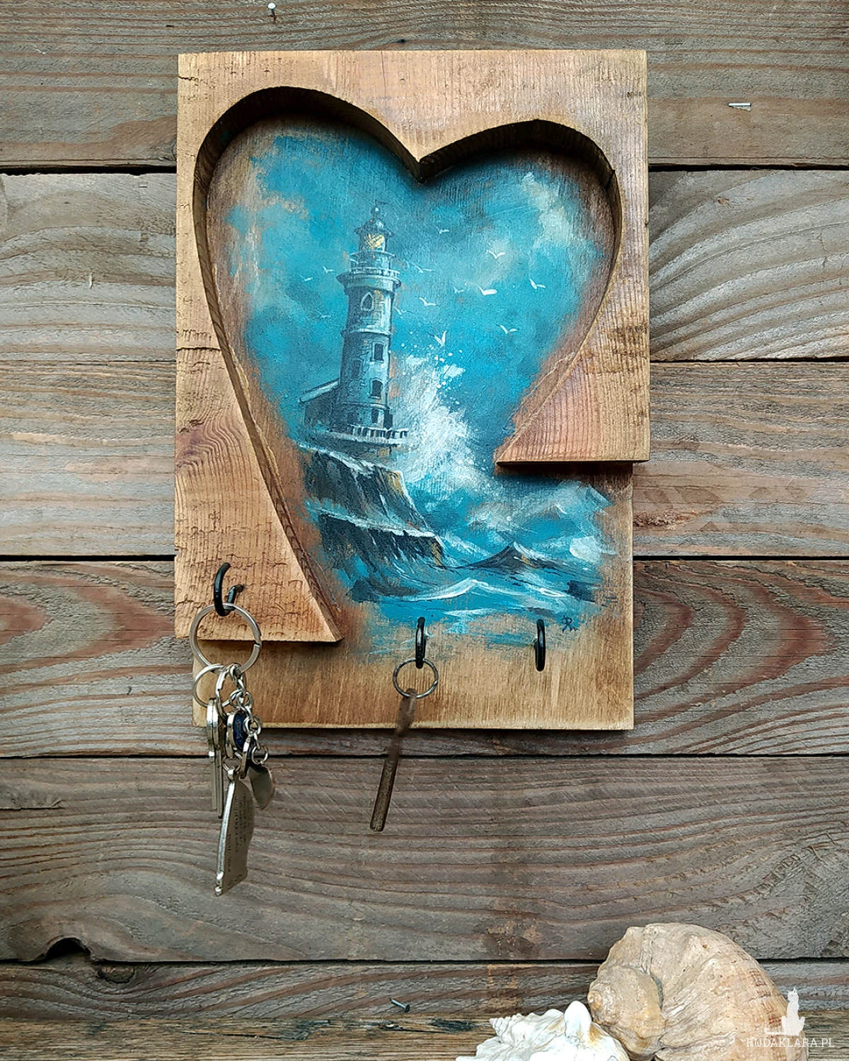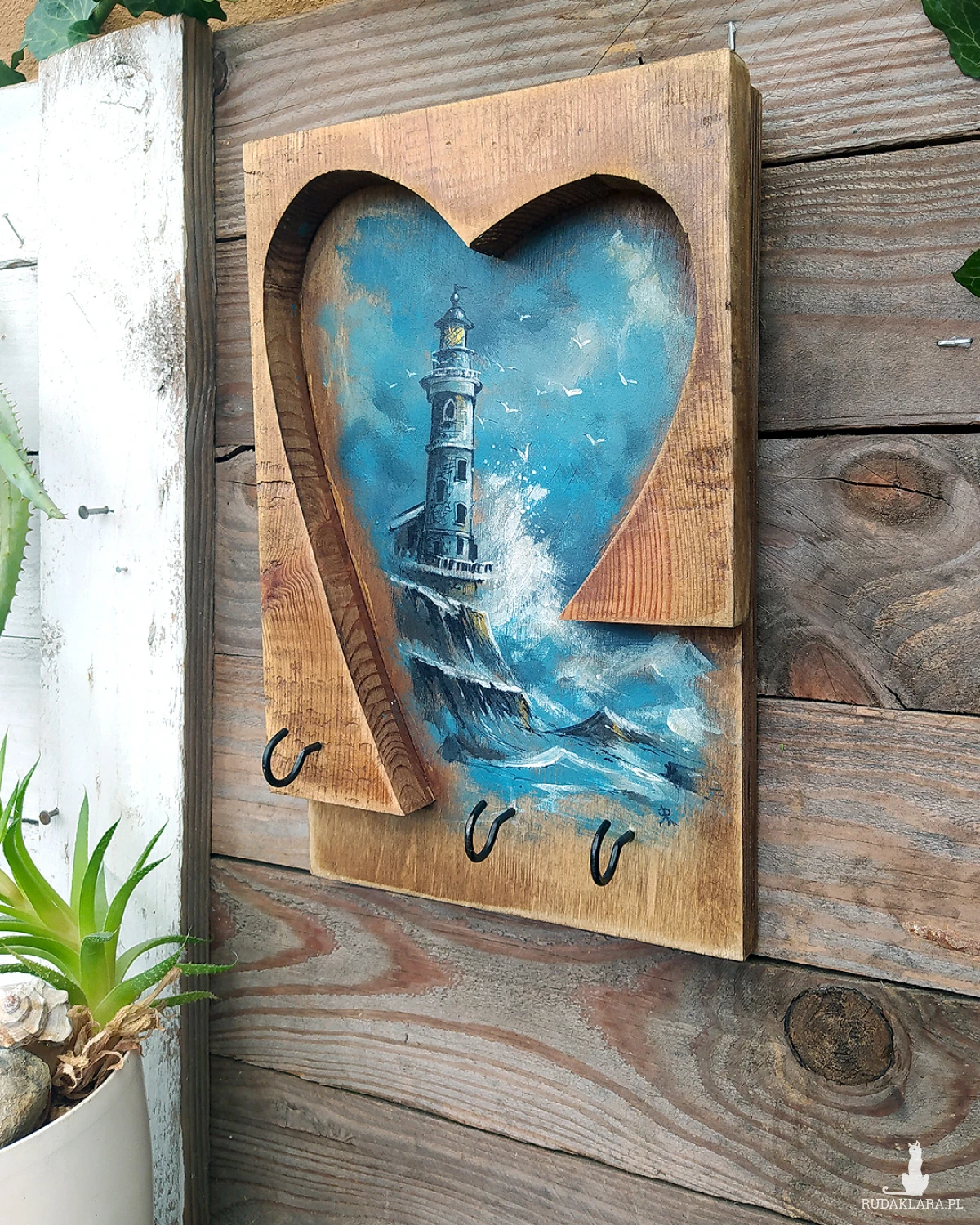 Tył wieszaczka to drewniana sklejka, na której namalowany jest pejzaż - Latarnia Morska na skale, o którą rozbijają się wzburzone fale. Dodatkowa deska z wyciętym wewnątrz sercem, zamyka jakby ramką tę morską scenę.