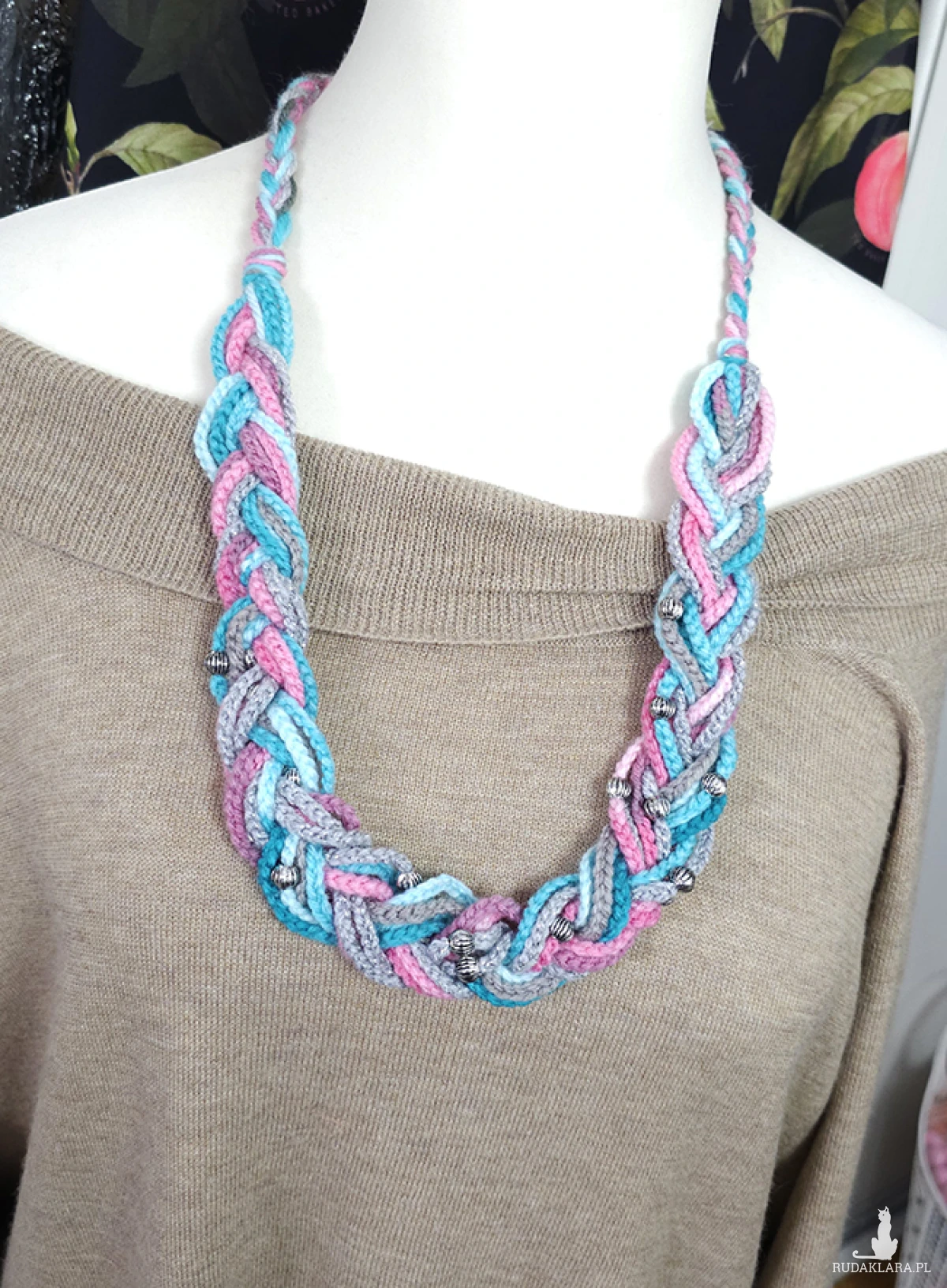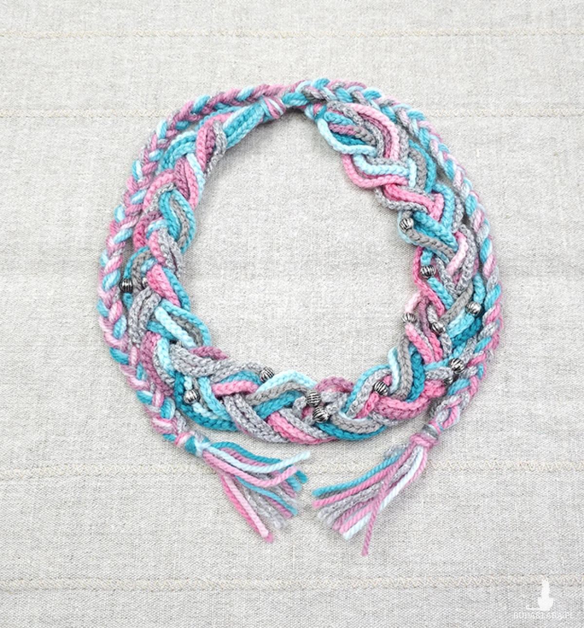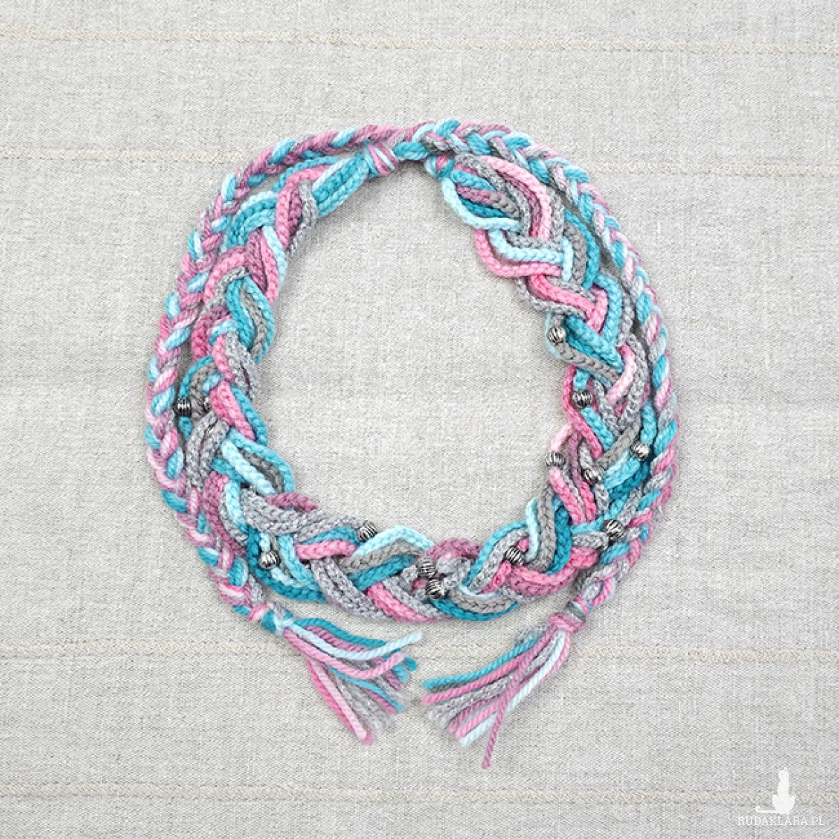 Naszyjnik wykonany z 12 szt. ręcznie plecionych sznurków, splecionych w luźny warkocz.