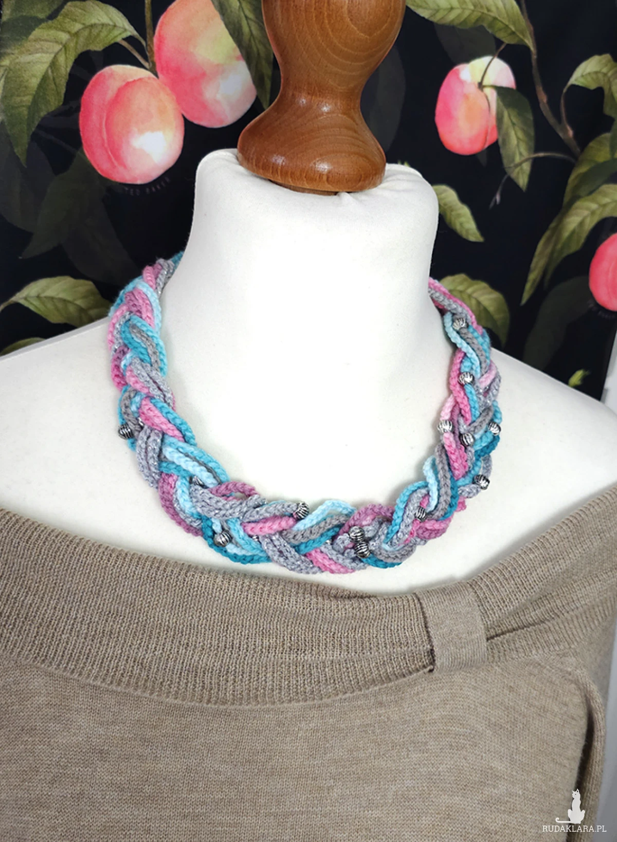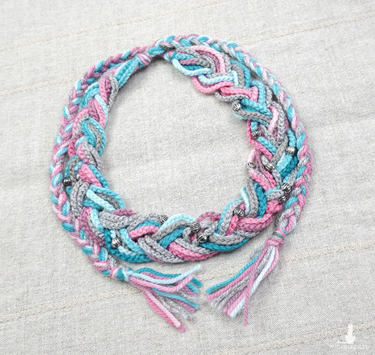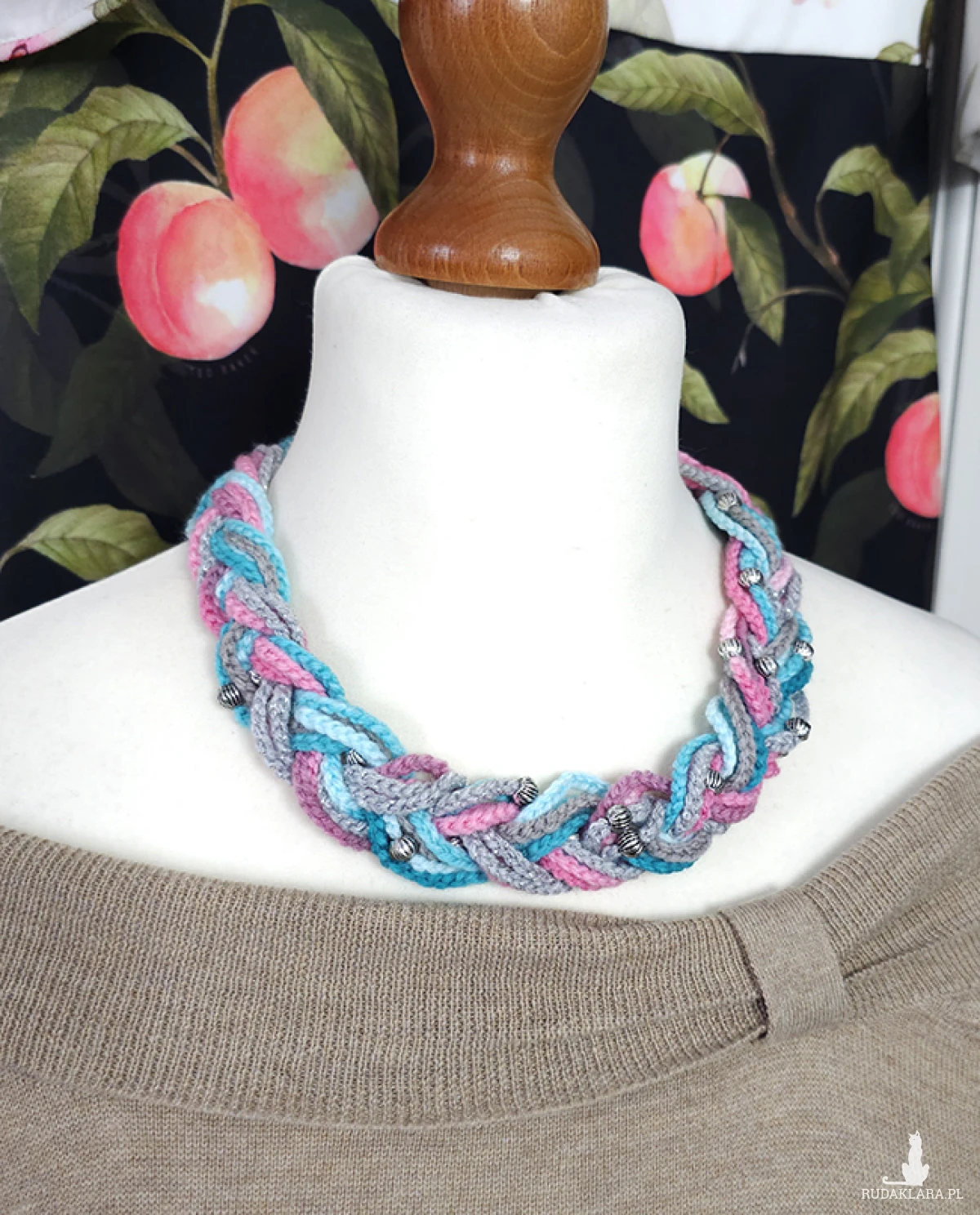 Naszyjnik wykonany z 12 szt. ręcznie plecionych sznurków, splecionych w luźny warkocz.