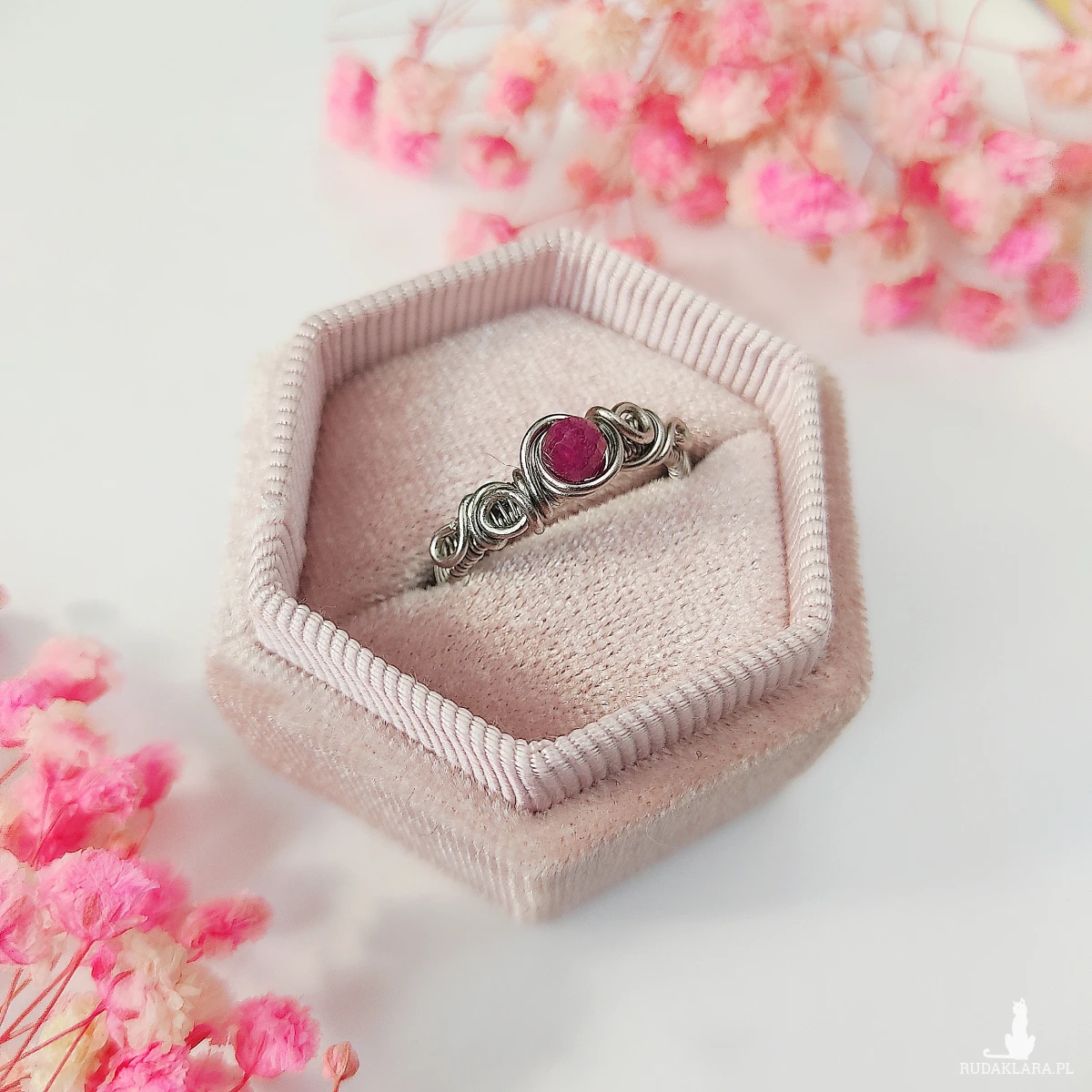 Pierścionek z rubinem wykonany metodą wire wrapping to wyjątkowy dodatek dla osób ceniących ręcznie robioną biżuterię oraz kamienie naturalne. Stal chirurgiczna, która została użyta do stworzenia tej ozdoby, zapewnia trwałość, odporność na korozję i hipoalergiczne właściwości. Dzięki temu pierścionek może być noszony na co dzień bez ryzyka podrażnień. Rubin, będący jednym z najbardziej cenionych kamieni szlachetnych, symbolizuje pasję, miłość oraz energię życiową. Jego głęboka, czerwono-karminowa barwa sprawia, że biżuteria nabiera niepowtarzalnego charakteru.