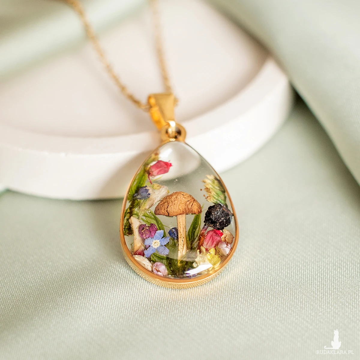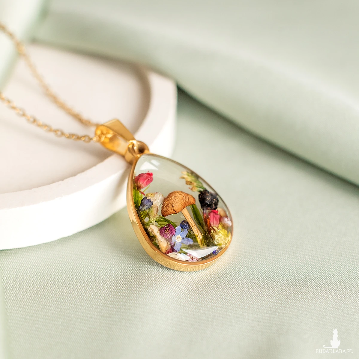 Wisiorek wykonany jest z żywicy epoksydowej z wykorzystaniem suszonych kwiatów. Metalowe elementy to stal nierdzewna szlachetna chirurgiczna.