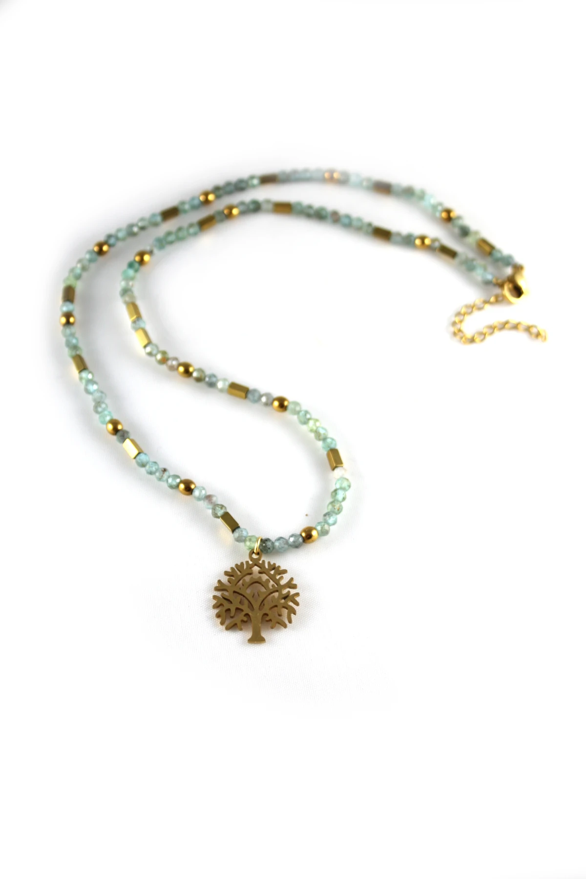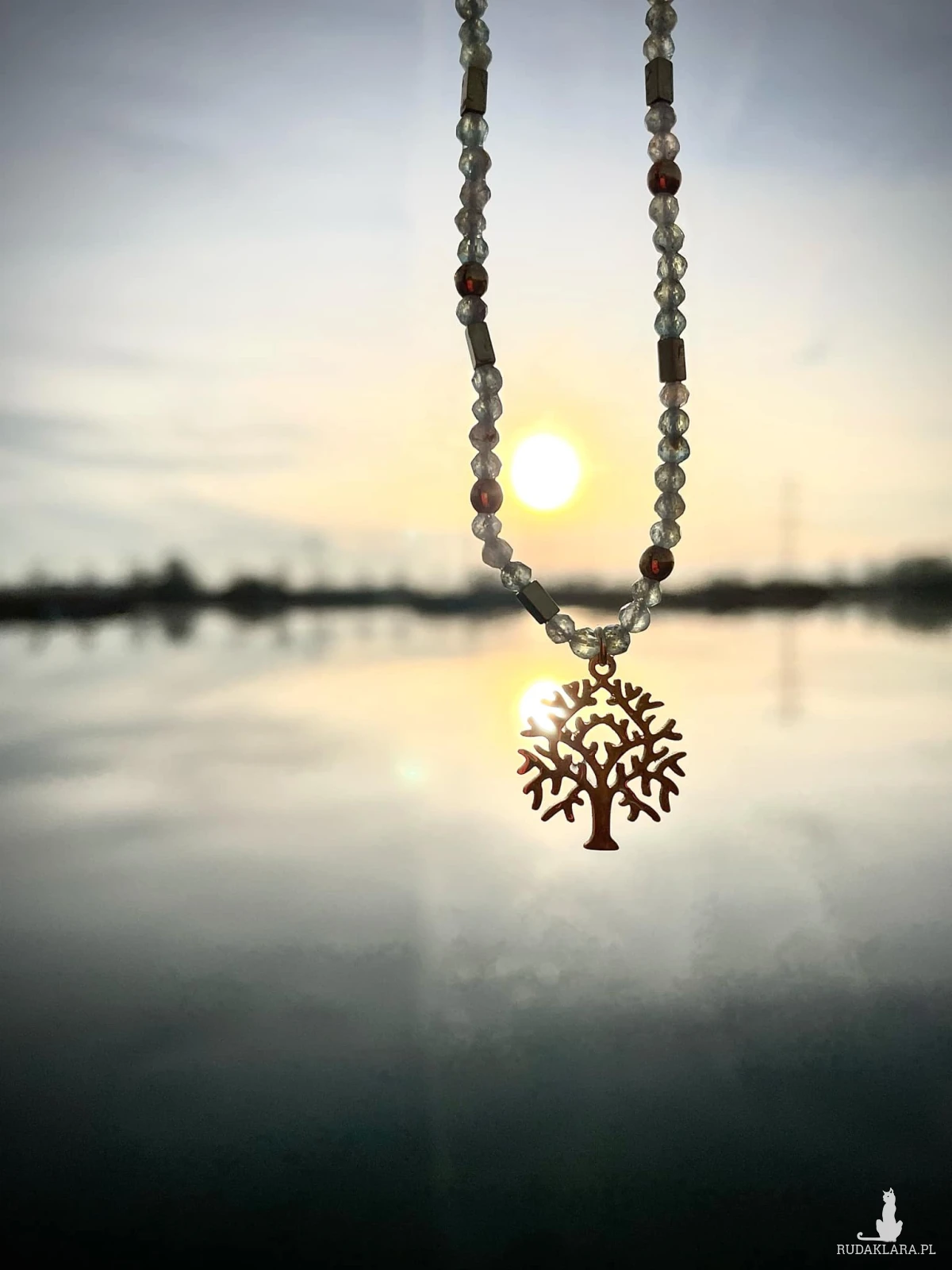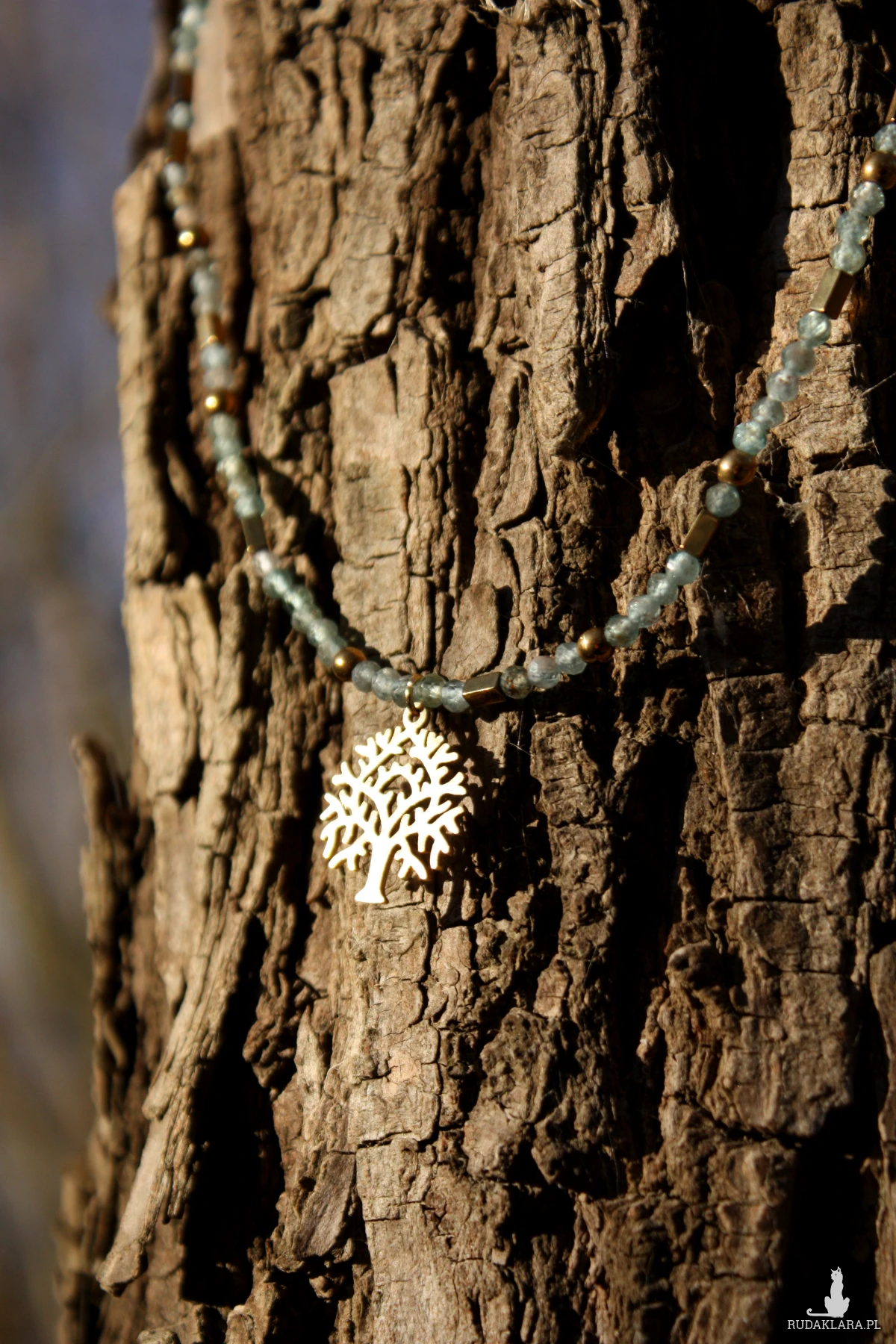 Błękitny naszyjnik z drzewem wykonany z fasetowanych kainitów o średnicy 3 cm. Naszyjnik o długości 40 cm posiada regulowane zapięcie pozwalające uzyskać długość 45 cm. Na lince, obok kamieni, umieściłam elementy w kolorze złota o w kształcie gładkich kulek i prostopadłościanów. Pozłacane elementy wykonane ze szlachetnej stali chirurgicznej oraz złotych hematytów.