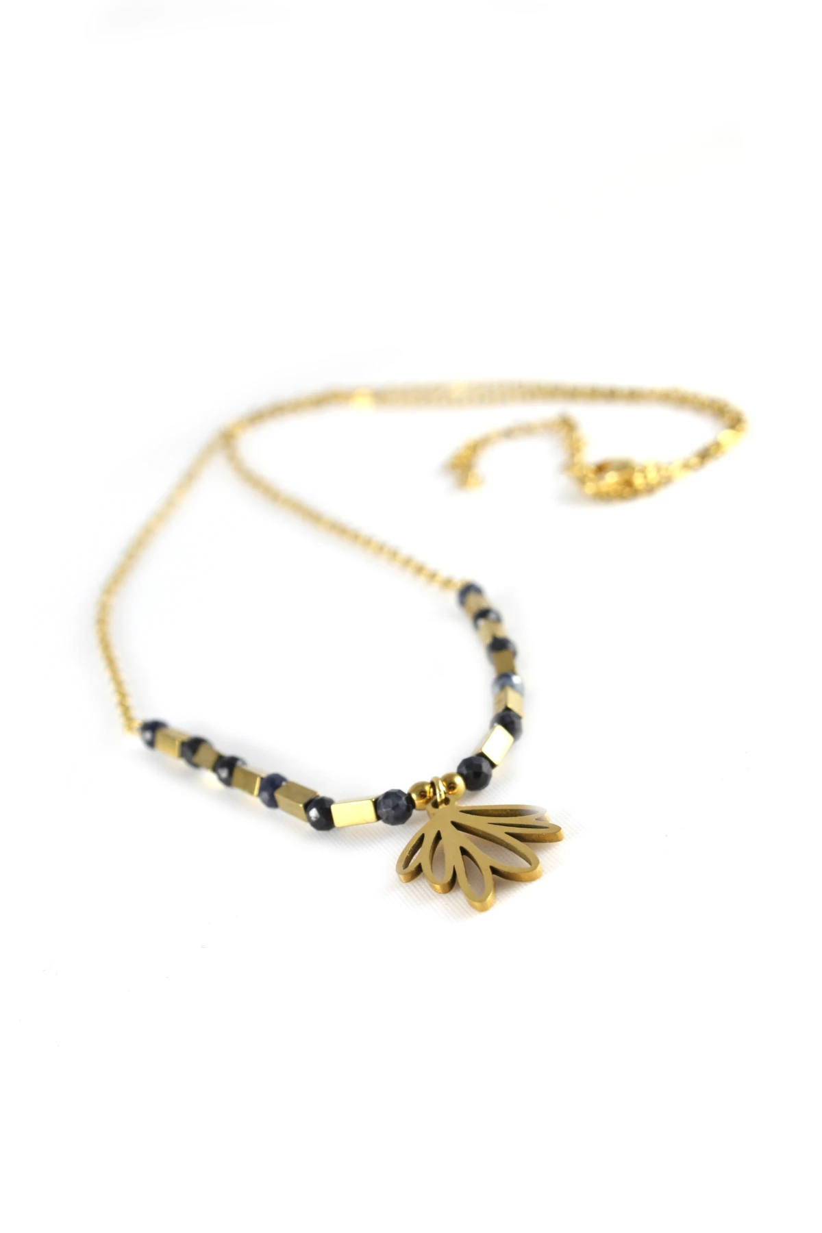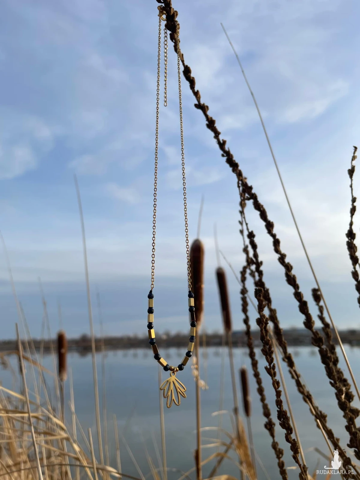Subtelny naszyjnik z łańcuszkiem ze stali chirurgicznej w kolorze złota. W centralnej części znajduje się element dekoracyjny wykonany z sześciennych złotych hematytów oraz fasetowanych szafirów o wielkości 0,3 cm wraz ze złotą zawieszką z motywem roślinnym przypominającym kwiat. Długość minimalna naszyjnika 44 cm, długość maksymalna 49,5 cm.