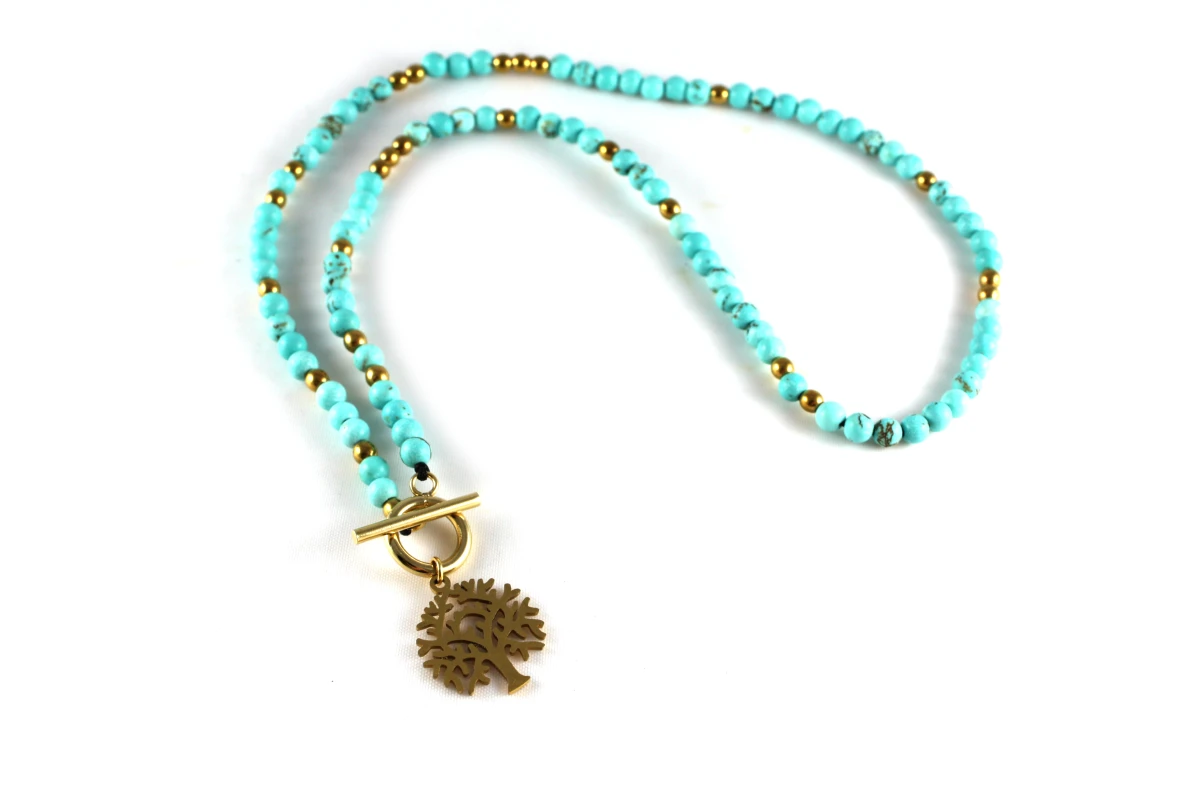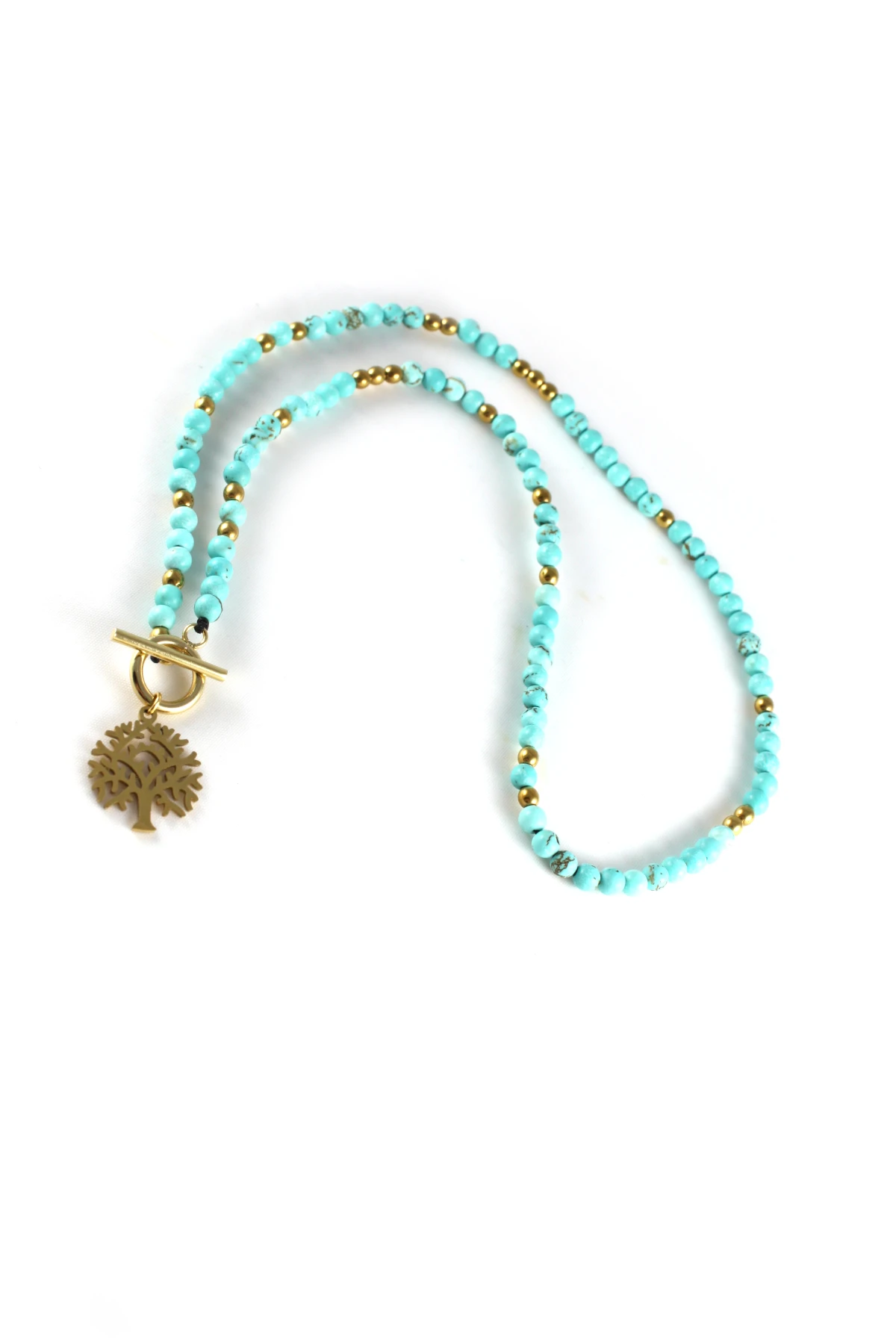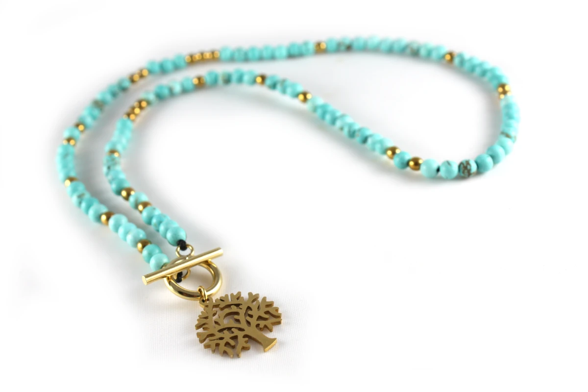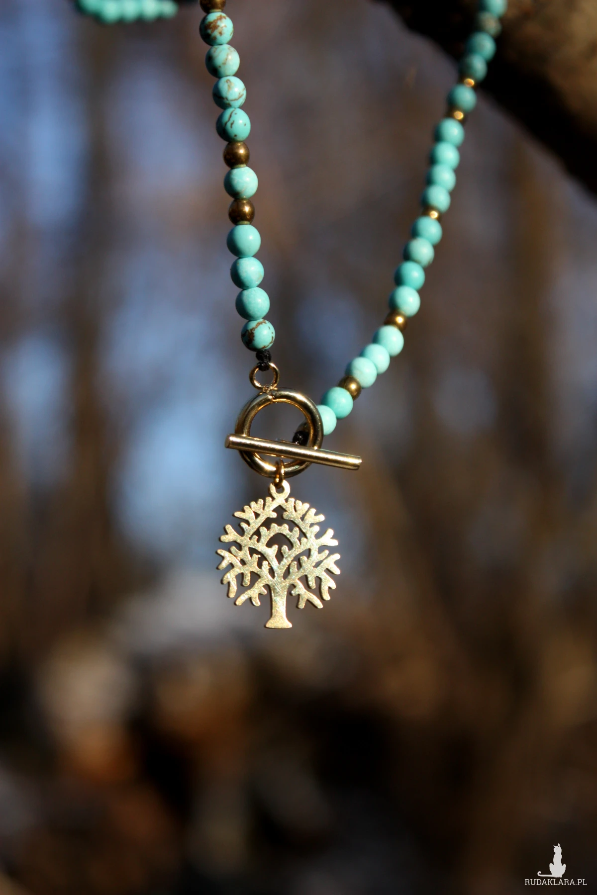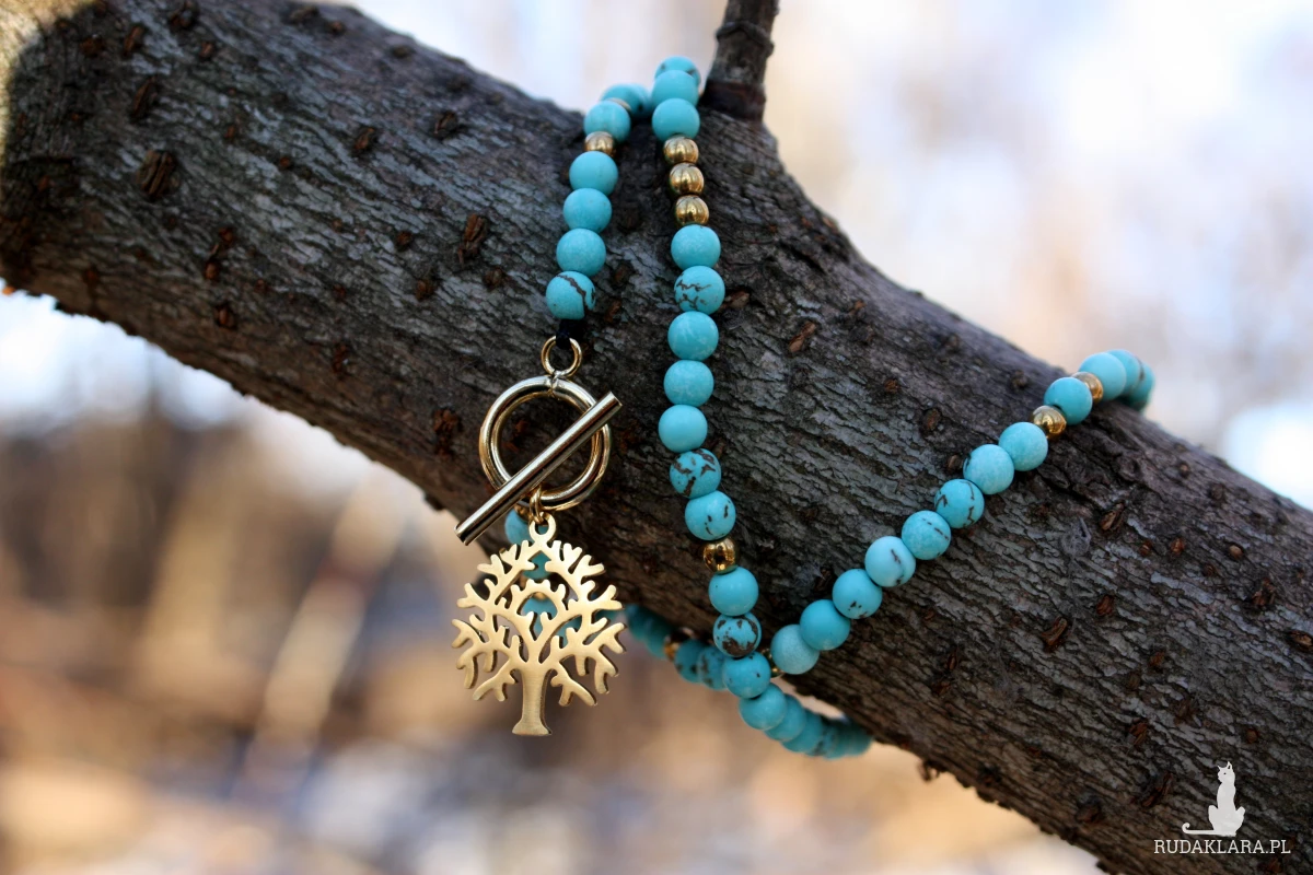 Naszyjnik z naturalnego magnezytu w kształcie gładkich kulek o wymiarach 0,4 cm oraz złotych kulek z hematytu 0,3 cm. Wygodne zapięcie typu toggle. Wymiary złotej zawieszki z drzewem to 1,5 cm/ 1,3 cm. Długość naszyjnika ok 45 cm.