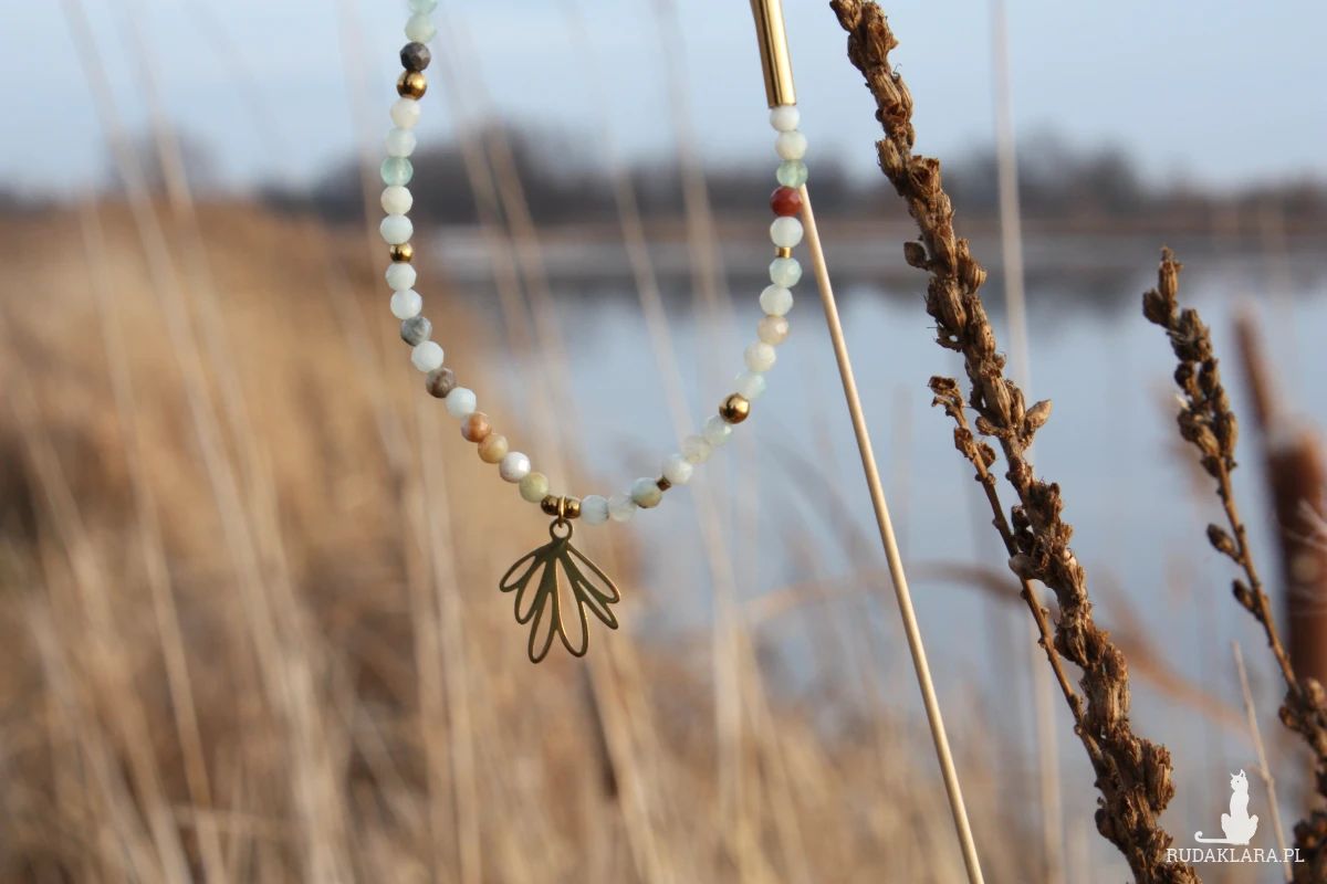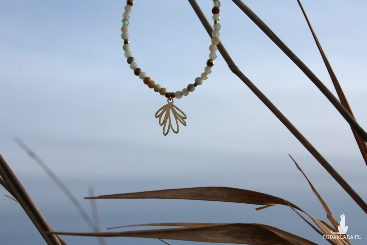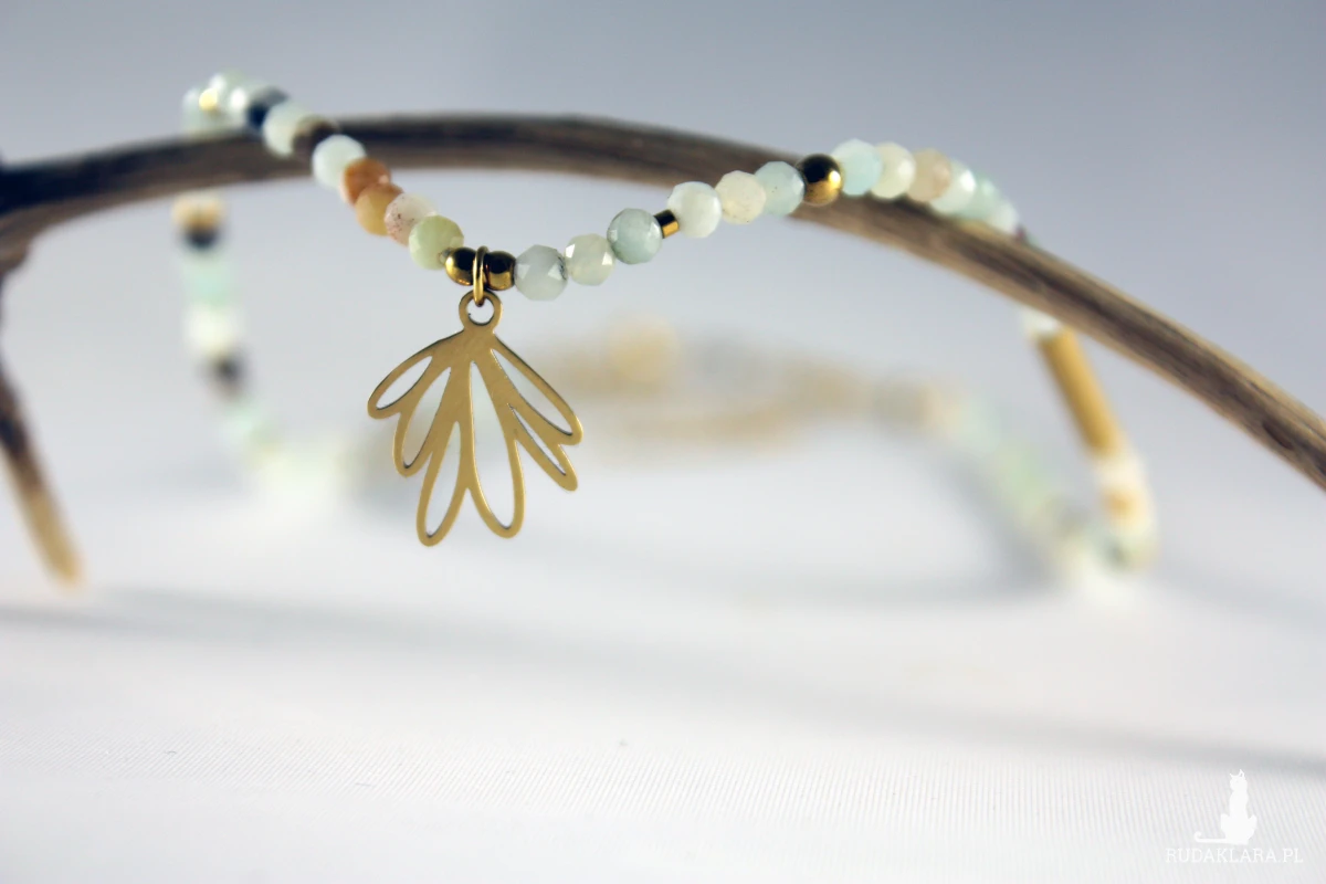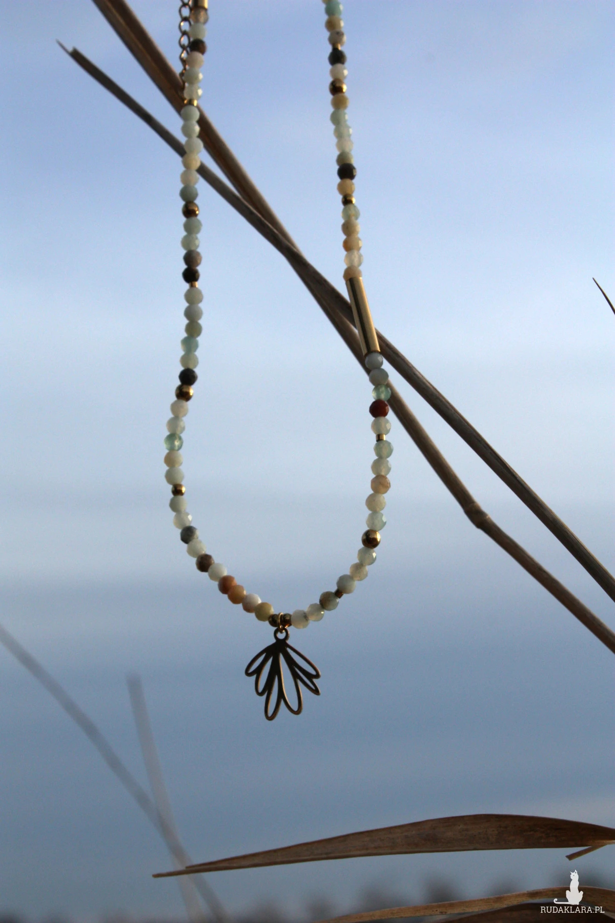 Naszyjnik z fasetowanych kamieni amazonitu z elementami w kolorze złota. Koraliki z naturalnych kamieni o średnicy 3 cm oraz elementy ze złotej stali chirurgicznej w kształcie walców i kulek tworzą naszyjnik o długości 38,5cm. Regulowane zapięcie karabińczyk pozwoli Ci uzyskać długość do 46 cm.
