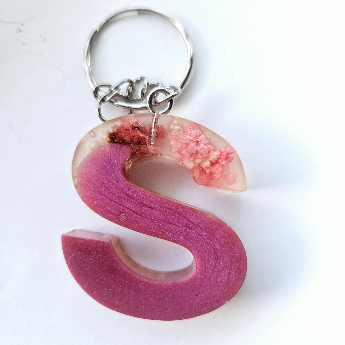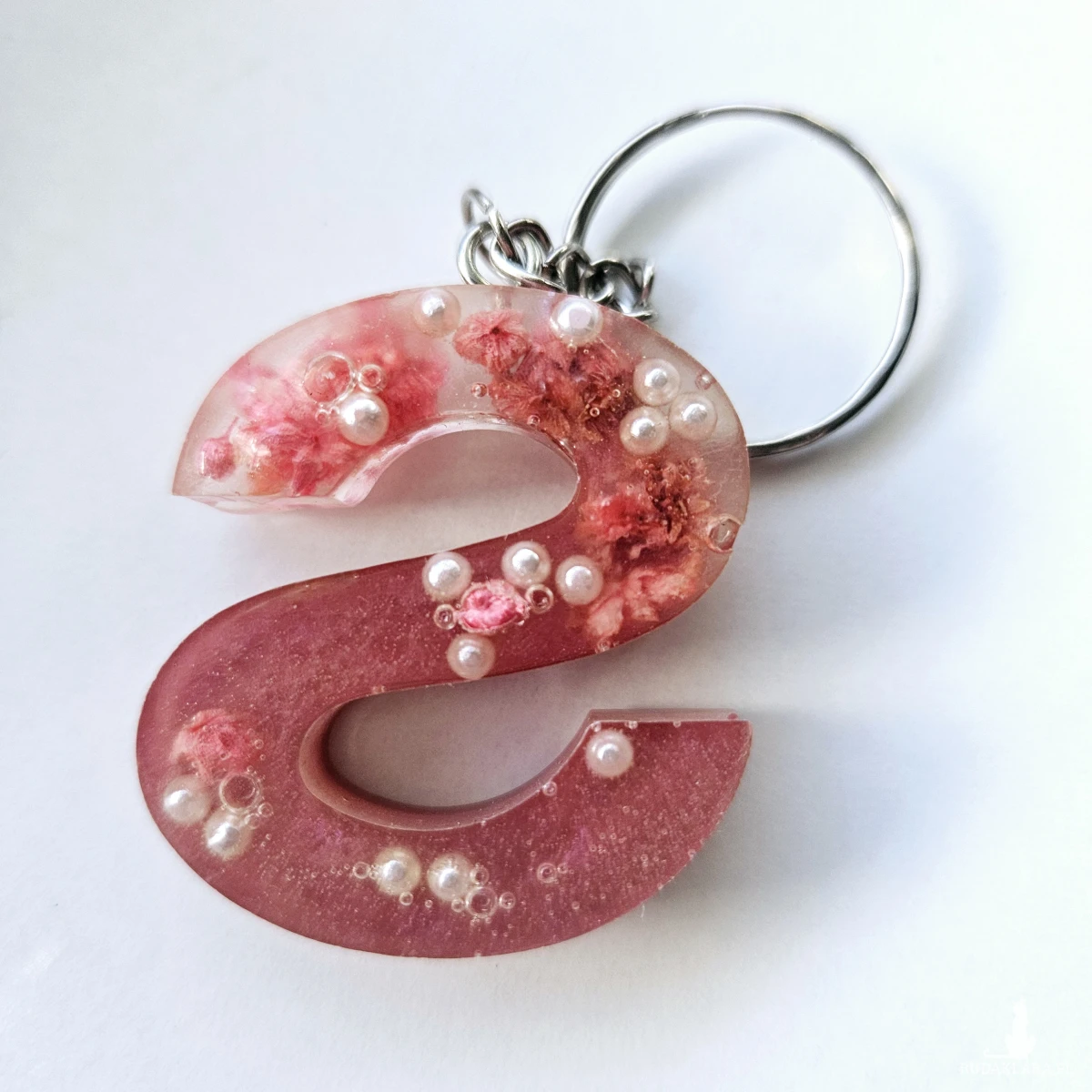 Brelok literka S ŕóżowa z gipsówką i perłami