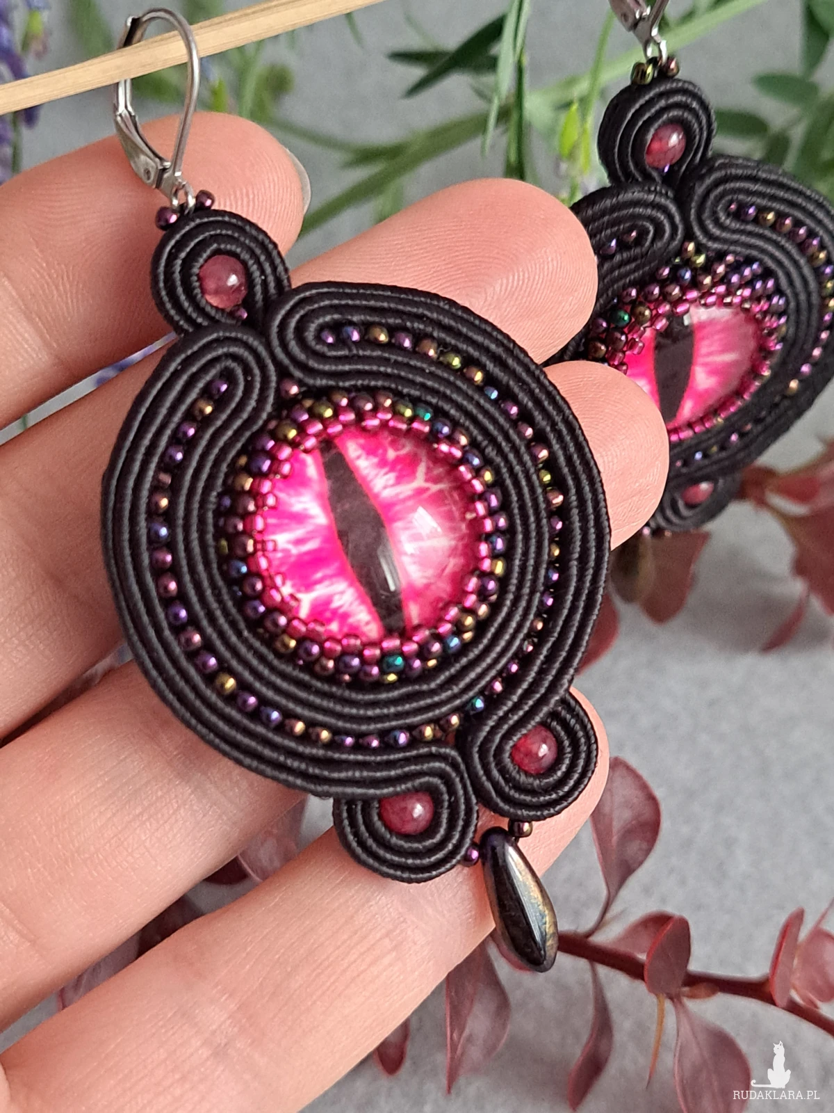Kolczyki wykonane są techniką haftu sutasz, który polega na zszywaniu ze sobą sznurków sutasz i wszywaniu między sznurki drobnych koralików, minerałów oraz ceramiki. Sercem kolczyków jest kaboszon z grafiką przedstawiającą różowe oko. Kaboszon opleciony jest czarnym sznurkiem sutasz oraz ozdobiony japońskimi koralikami toho oraz różowymi kulkami agatu. Z tyłu koczyki są ręcznie podszyte skórą naturalną. Kolczyki zawieszone są na biglach angielskich ze stali chirurgicznej. Zapakowane w ozdobne pudełeczko.