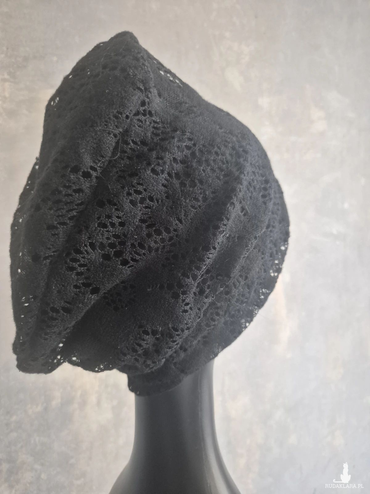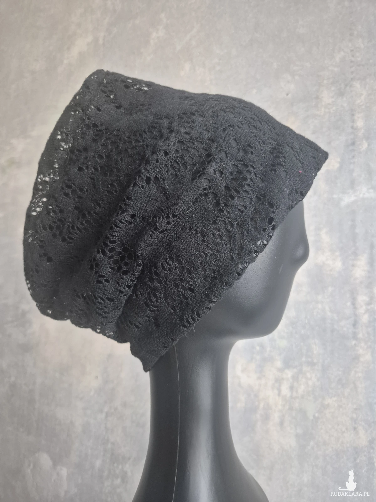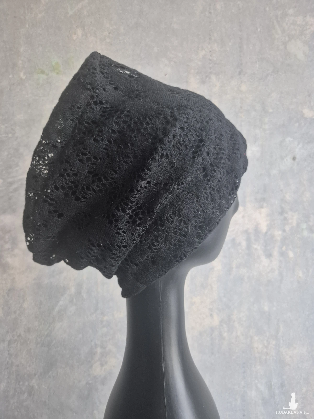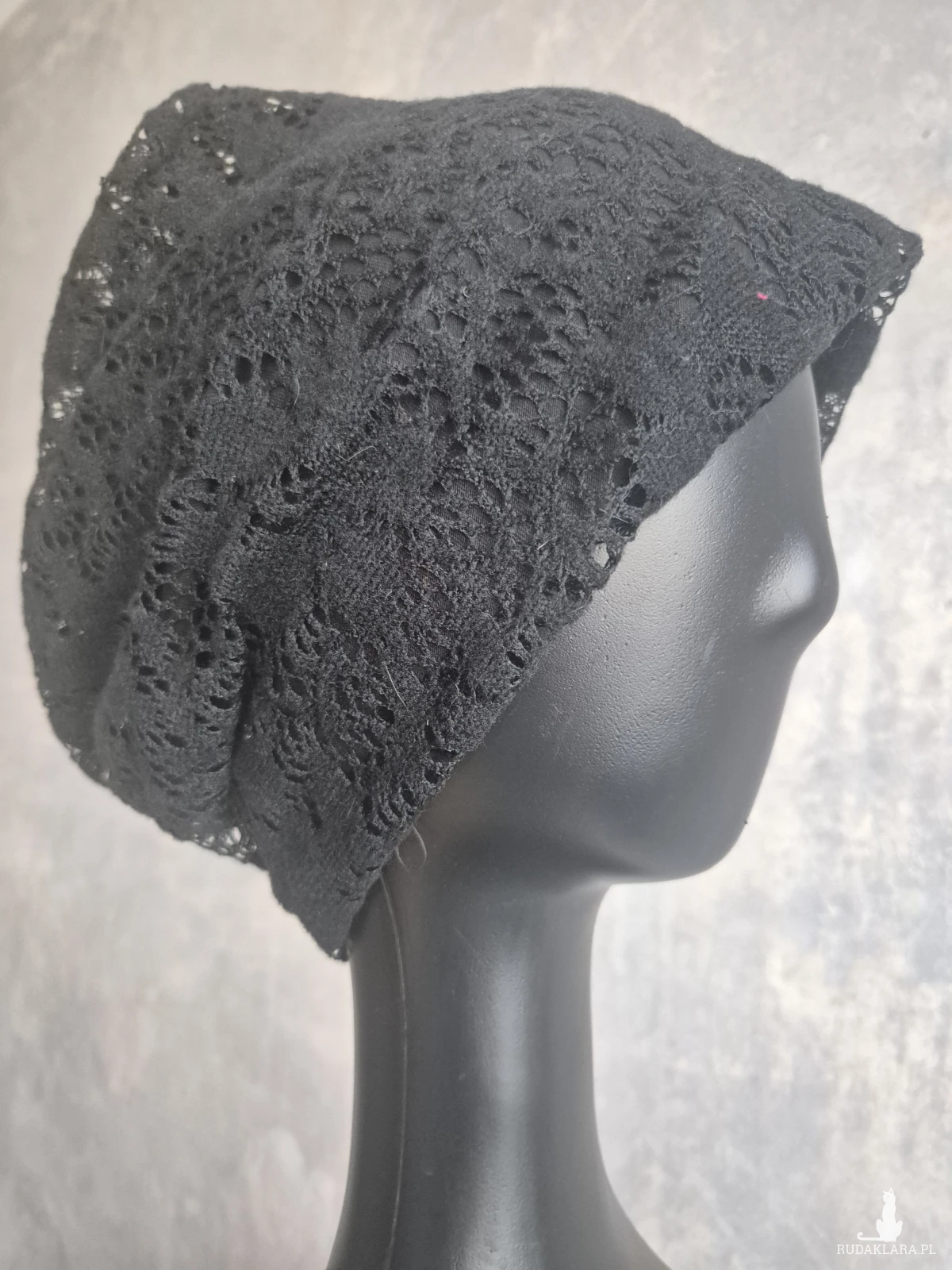 czapka czarna codzienna koronkowa  na podszewce rozmiar uniwersalny na niepogodę na złą fryzurę na poprawę energii góra patchworkowa box a1