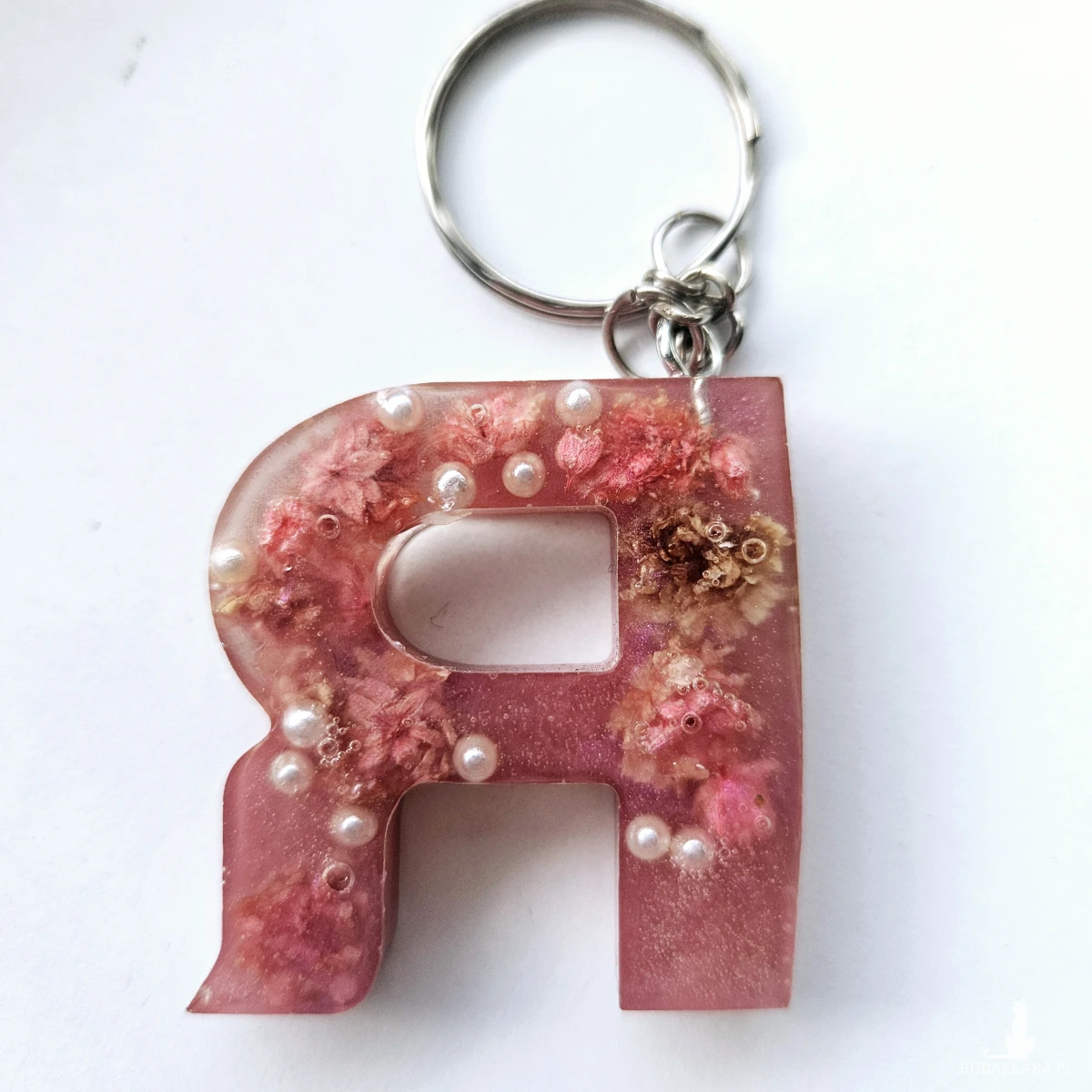 Brelok literka R ŕóżowa z gipsówką i perłami