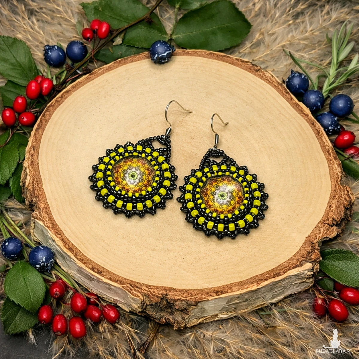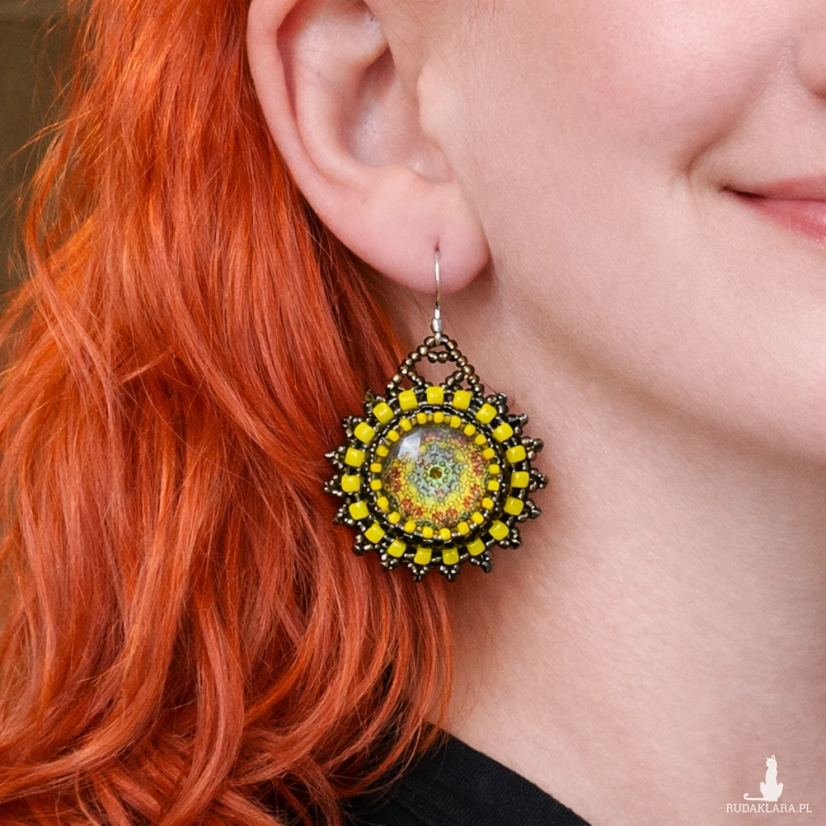 Kolczyki zostały stworzone metodą haftu koralikowego z wykorzystaniem wysokiej jakości koralików w odcieniach złota i hematytu. Centralny kaboszon z motywem mandali nadaje kompozycji głębi i artystycznego wyrazu. To ręcznie robiona biżuteria, która łączy precyzję z unikalnym designem.