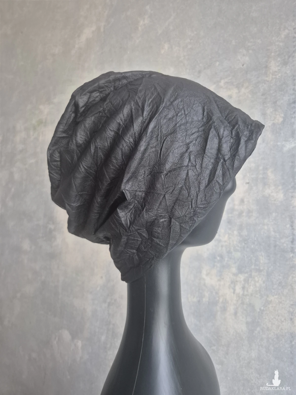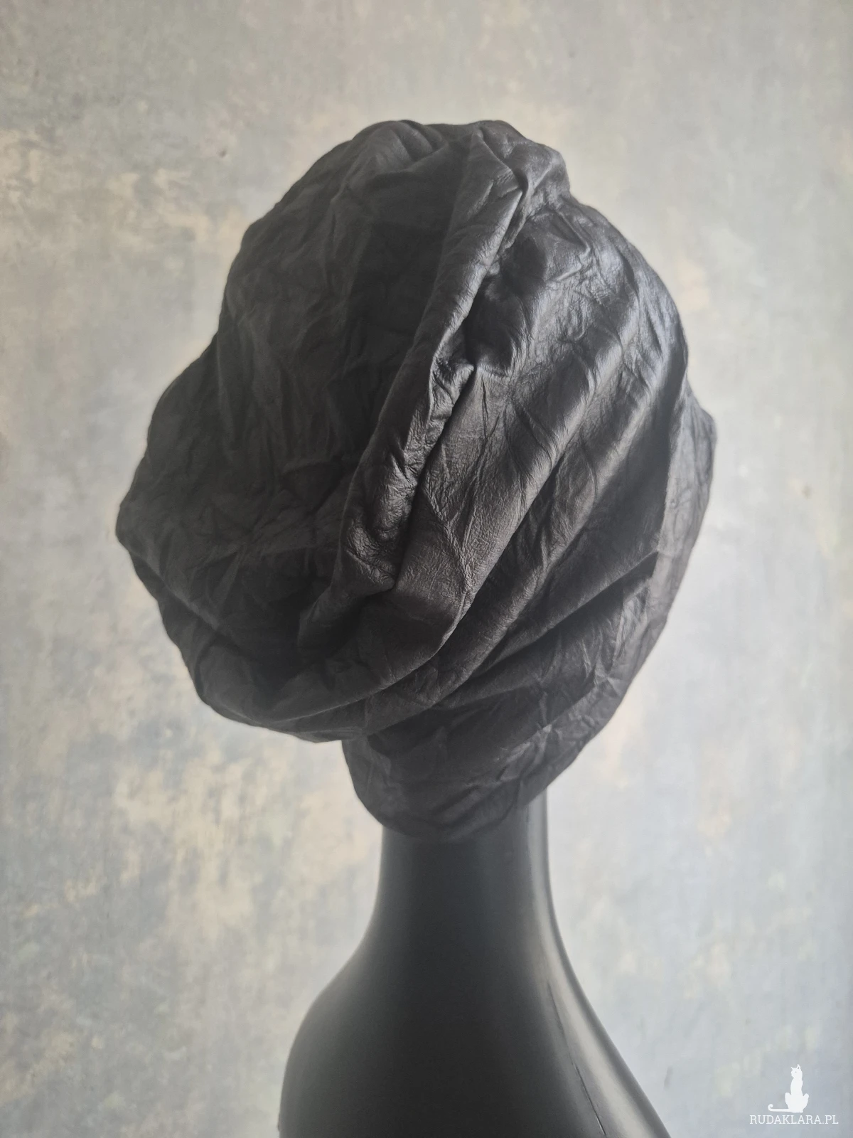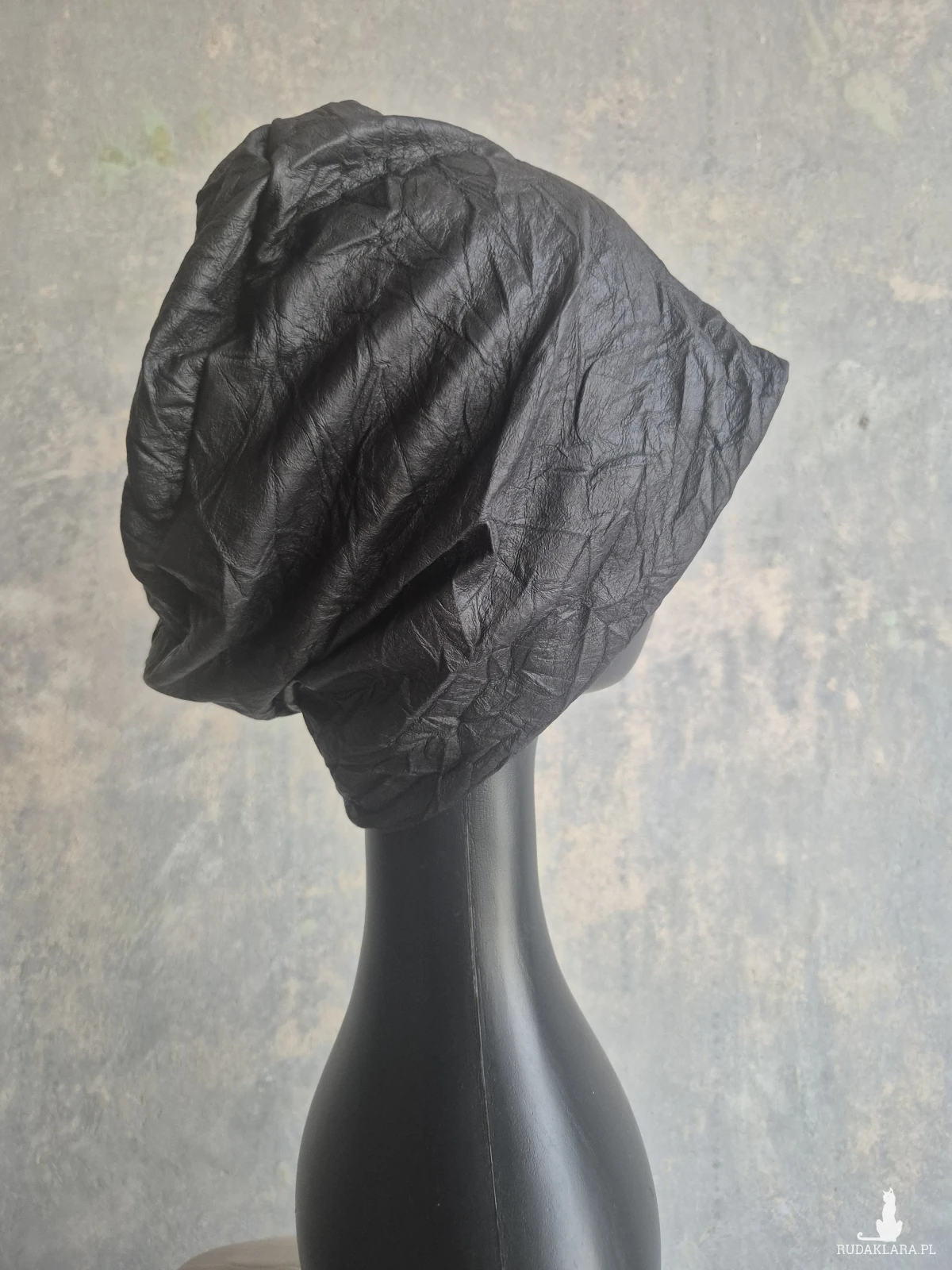 czapka czarna codzienna materiał gnieciony skóropodobny bardzo ciekawy czapka na podszewce w rozmiarze uniwersalnym kształt Smerfetka super box a1