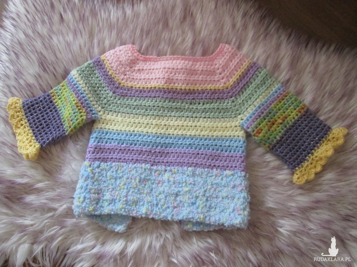 Rękaw 3/4,zapinany na jeden guzik przy szyi Wymiary: -dług.34 cm -szer.od pachy do pachy 26 cm -rękaw 29 cm(mierzony od szyi) Kolory:cukierkowe pastelowe