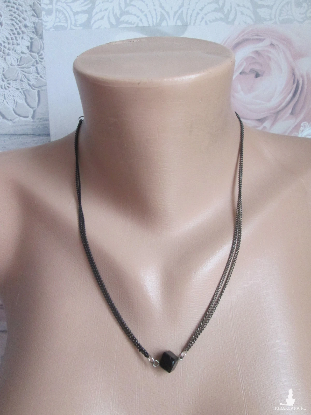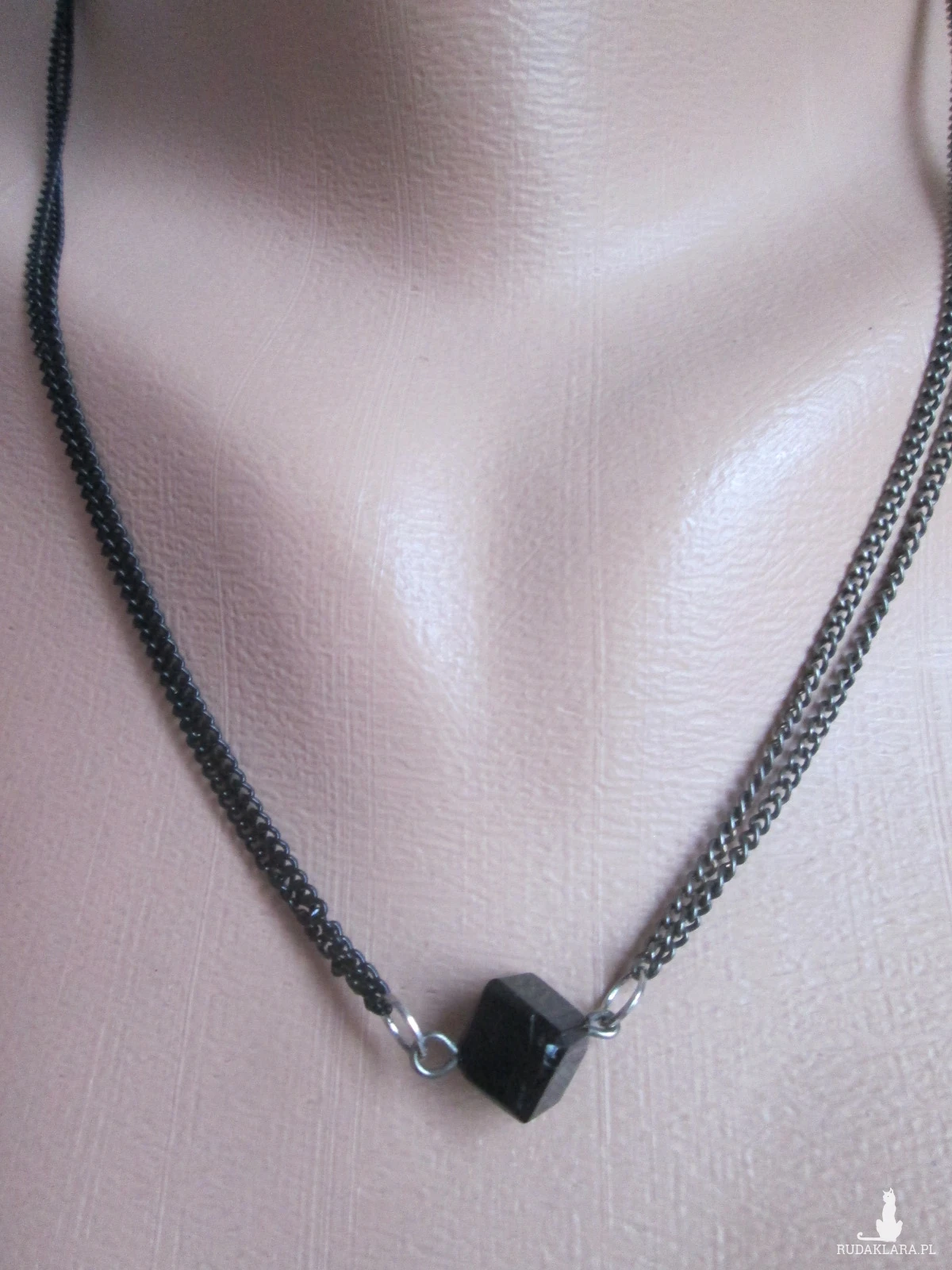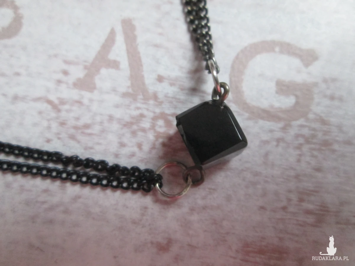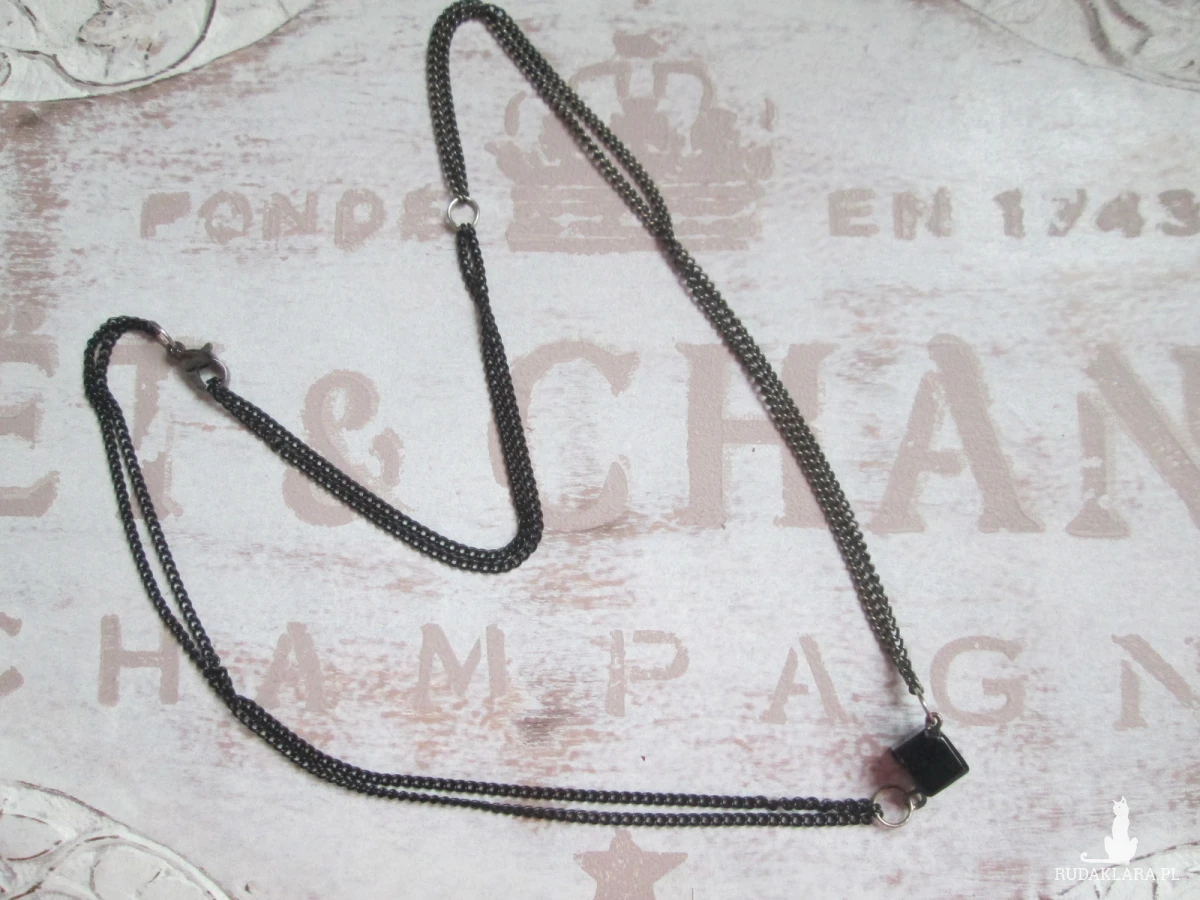 Materiały: koralik-kostka,na podwójnym łańcuszku z zapięciem typu karabińczyk