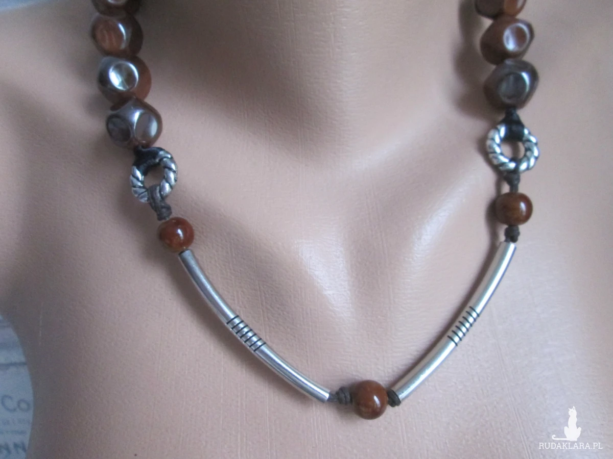 Materiały:ozdobne koraliki (ceramika-imitacja brązowego kalcytu,cieniowane) i metalowe grawerowane rurki,na czarnym bawełnianym sznurku jubilerskim i