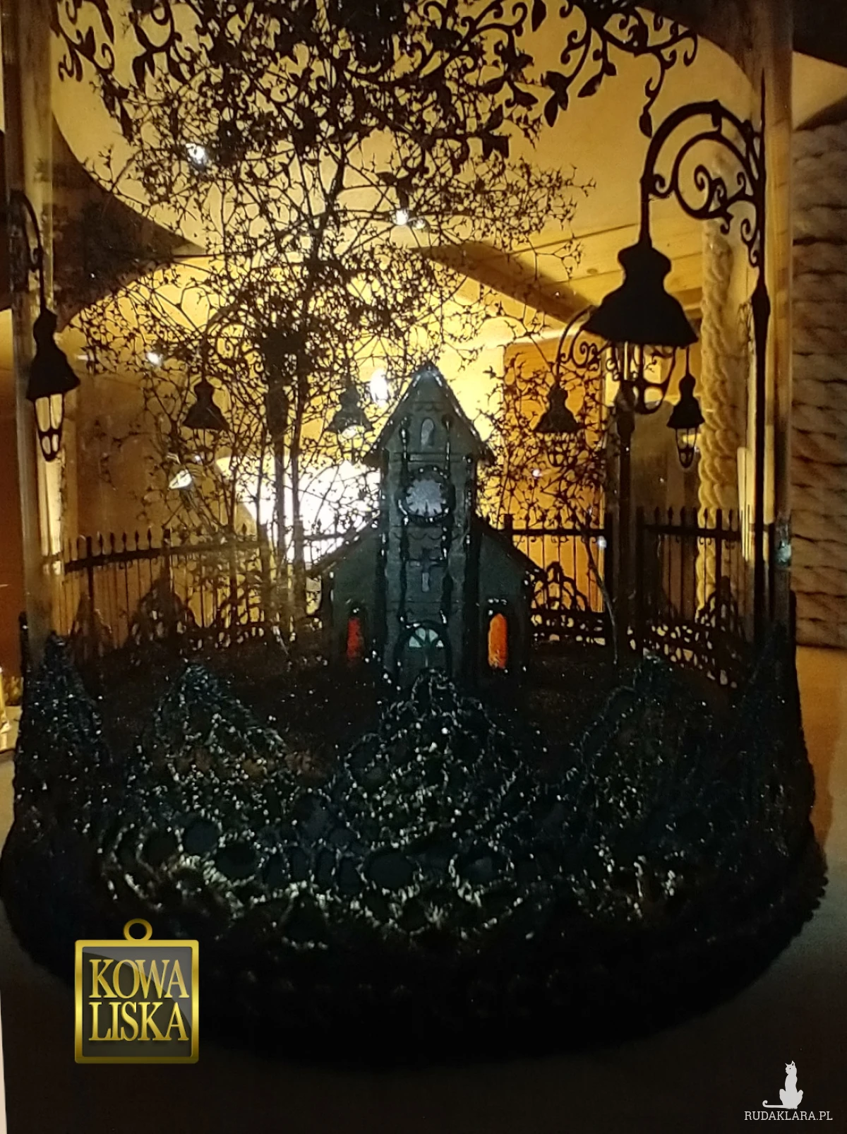 Czarne ogrodzenie, czarne latarnie, czarne drzewo, przez które ktoś przewiesił sznur lampek, ledwo oświetlających ciemną przestrzeń. Nawet śnieg w tej zaklętej ciemności jest czarny.
