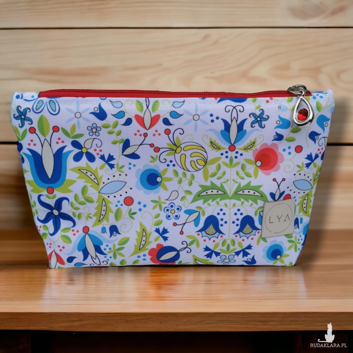 Bardzo kobieca kosmetyczka uszyta z wodoodpornej tkaniny. W środku podszewka.