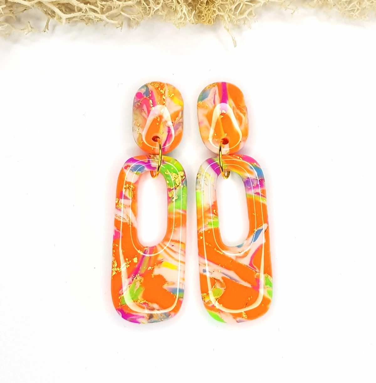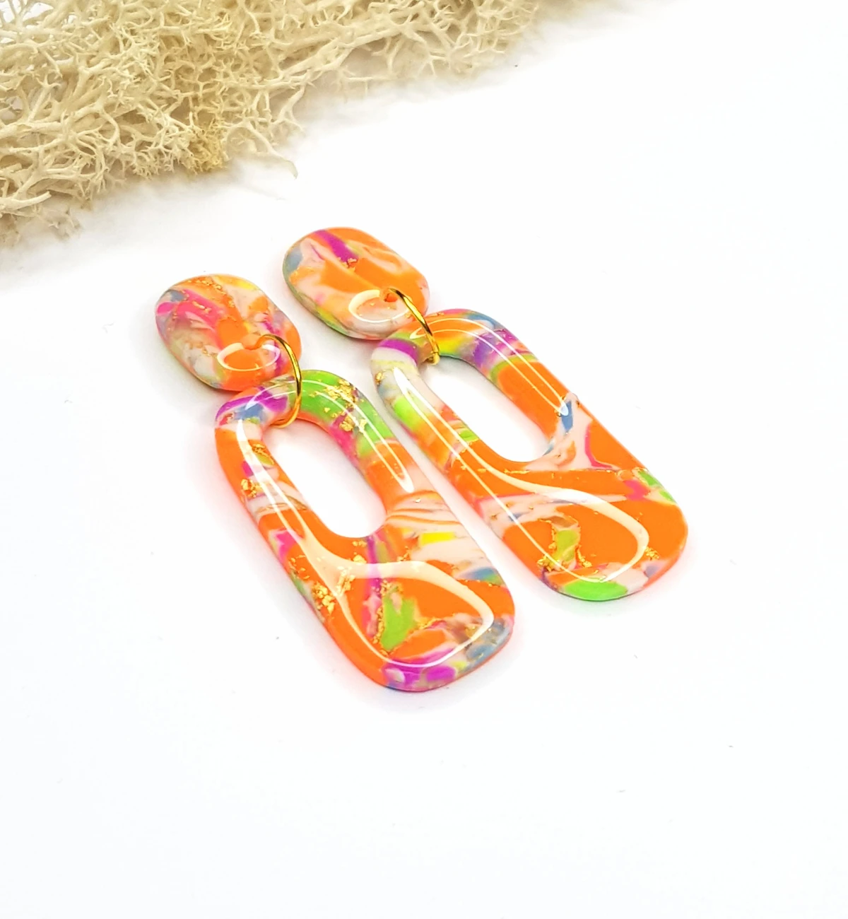 Ręcznie robione kolczyki wyróżniają się intensywnym, marmurkowym wzorem w jaskrawych kolorach: pomarańczu, różu, zieleni i bieli, uzupełnionym złotymi drobinkami. Składają się z dwóch elementów – zaokrąglonej górnej części oraz wydłużonej, prostokątnej ramy z zaokrąglonymi rogami, które są połączone złotymi ogniwami. Dzięki geometrycznym kształtom i dynamicznej kolorystyce przyciągają wzrok i wprowadzają odważny akcent do stylizacji. Materiały takie jak glina polimerowa i żywica nadają im trwałość oraz artystyczny charakter. To idealny wybór dla osób ceniących unikalną biżuterię pełną energii i kreatywności. Długość 6,3cm. Kolor pomarańczy to jaskrawy- neon. Ciężko uchwycić go na zdjęciu.